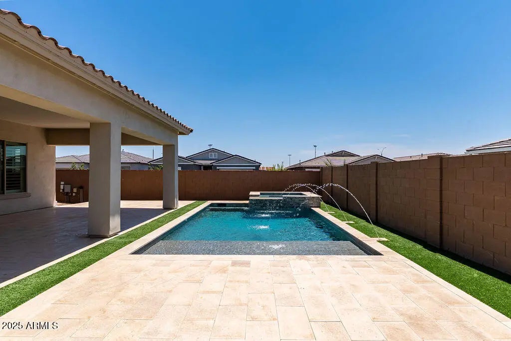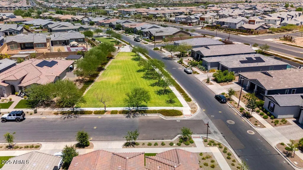 Beautiful 5-bedroom, 4.5-bath home for sale in Eastmark! This upgraded home with a bonus room sits on a premium quarter-acre corner lot across from a park. Inside you'll love the open floor plan, split layout, 10-foot ceilings, plantation shutters, and a huge 4-panel sliding glass door that connects to your backyard oasis. The gourmet kitchen has a large island with breakfast bar, quartz countertops, custom backsplash, walk-in pantry, 42-inch cabinets with glass uppers and crown molding, and stainless steel appliances including a gas cooktop and wall oven. Spacious primary suite with tiled walk-in shower, big walk-in closet, and direct laundry room access. Outside: enjoy an extended covered patio with stone accents, heated PebbleTec pool and spa, Baja step, water feature... in-ground cleaning, and low-maintenance synthetic grass yard perfect for entertaining. Live in award-winning Eastmark, one of the best master-planned communities in Mesa. Community amenities include resort-style pool and spa, splash pad, playgrounds, trails, parks, lakes, and a community center.
