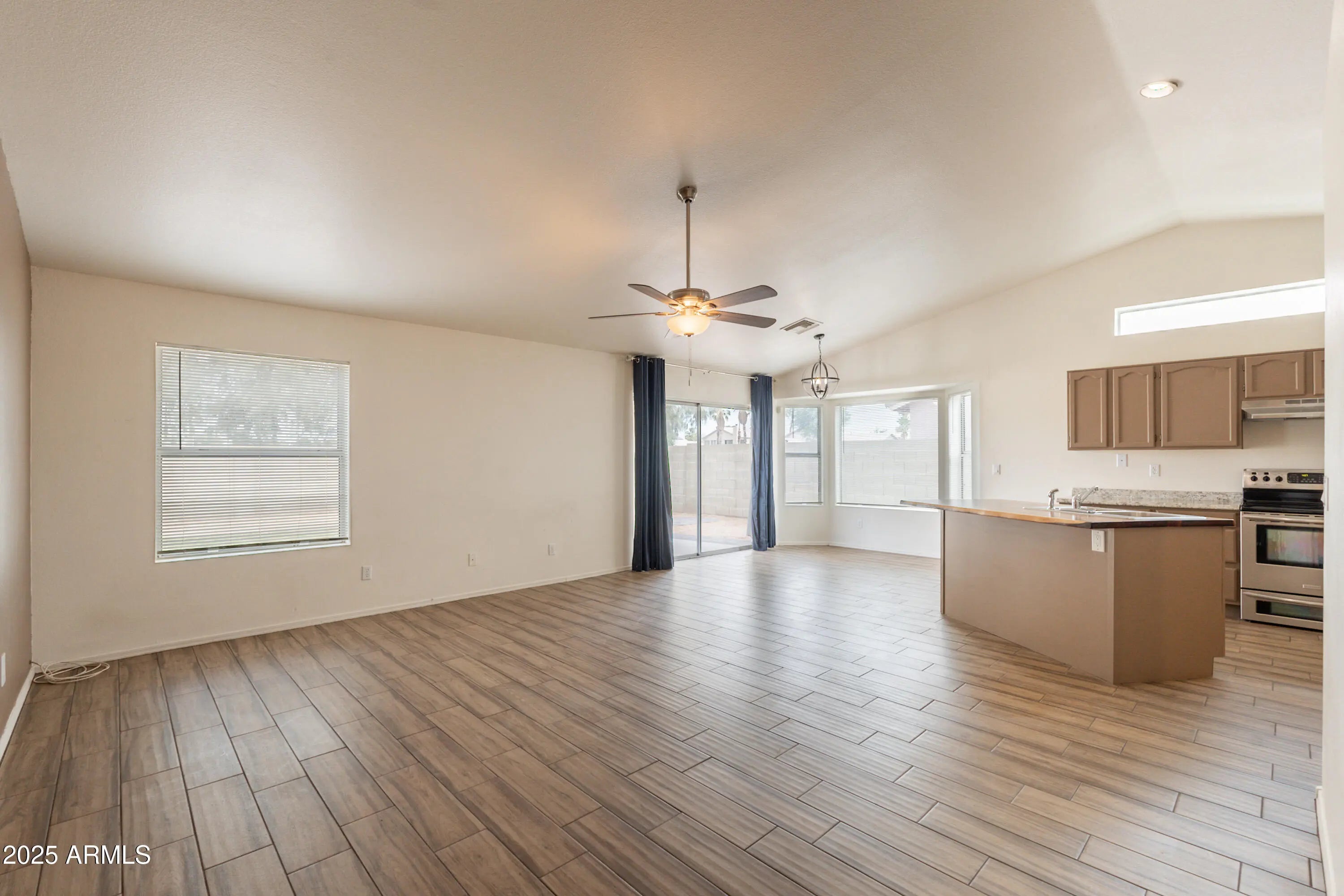 Charming 1-story home with 3 bedrooms, 2 bathrooms, NEW WINDOWS & beautiful tile flooring throughout. The kitchen features light brown cabinets, granite countertops, a large island, and stainless steel appliances perfect for cooking and entertaining. Enjoy the open layout with seamless flow between living, dining, and kitchen areas. The primary suite offers comfort and privacy. Step outside to a fully fenced backyard with turf and a covered patio, ideal for relaxing or hosting guests. Includes a 2-car garage and private driveway. This home blends comfort, style, and functionality.
