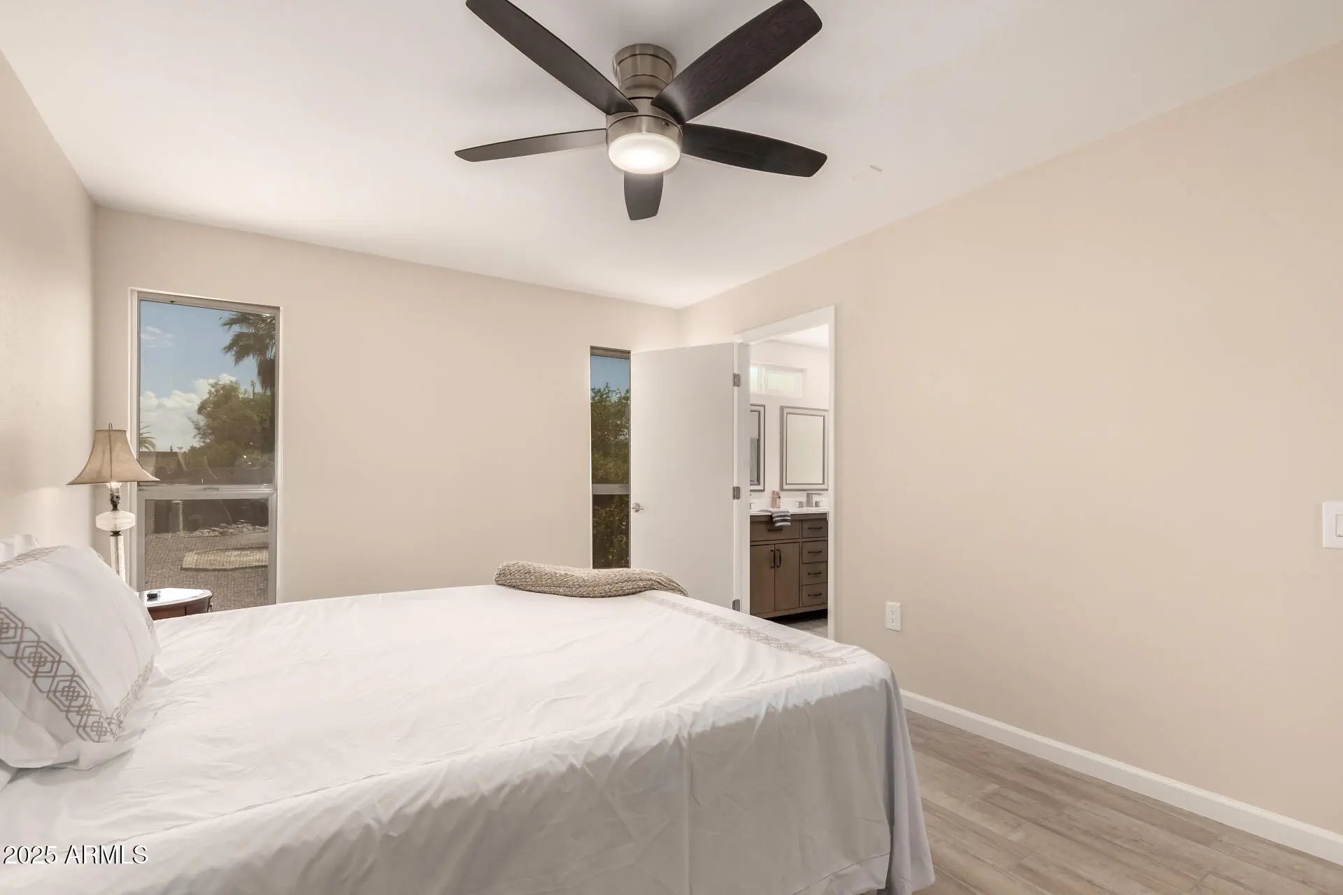 Wow! This exceptionally remodeled home features a unique layout with 3 bedrooms and 3 bathrooms, including 2 split-ensuite bedrooms, perfect for guests or multi-generational living. The open-concept design seamlessly combines comfort and style. Start your day with coffee and relax on the large, covered patio. The backyard, enclosed by a block wall, offers privacy and plenty of outdoor activities. There is also a fenced-off area for gardening. The chef's kitchen is ideal for entertaining, featuring quartz countertops, an island, a stunning backsplash, and a pantry. It also includes new high-end stainless-steel appliances that every cooking enthusiast will love. The LED-lit refrigerator, air fryer oven, white shaker cabinets, and farmhouse sink make the kitchen a favorite. The beautiful wood plank tile flooring extends to the front entry and enhances the home's overall charm. Both primary bedrooms have walk-in closets and luxurious ensuite bathrooms with tiled walk-in showers and double sinks. The home has Pella dual-pane windows, a patio slider, ceiling fans, and recessed lighting. The laundry room is spacious, features a utility sink, and is separate from the garage. It could also be used as an office or craft room with extra storage. The home has been freshly painted inside and out, and the 2-car garage offers additional storage cabinets.