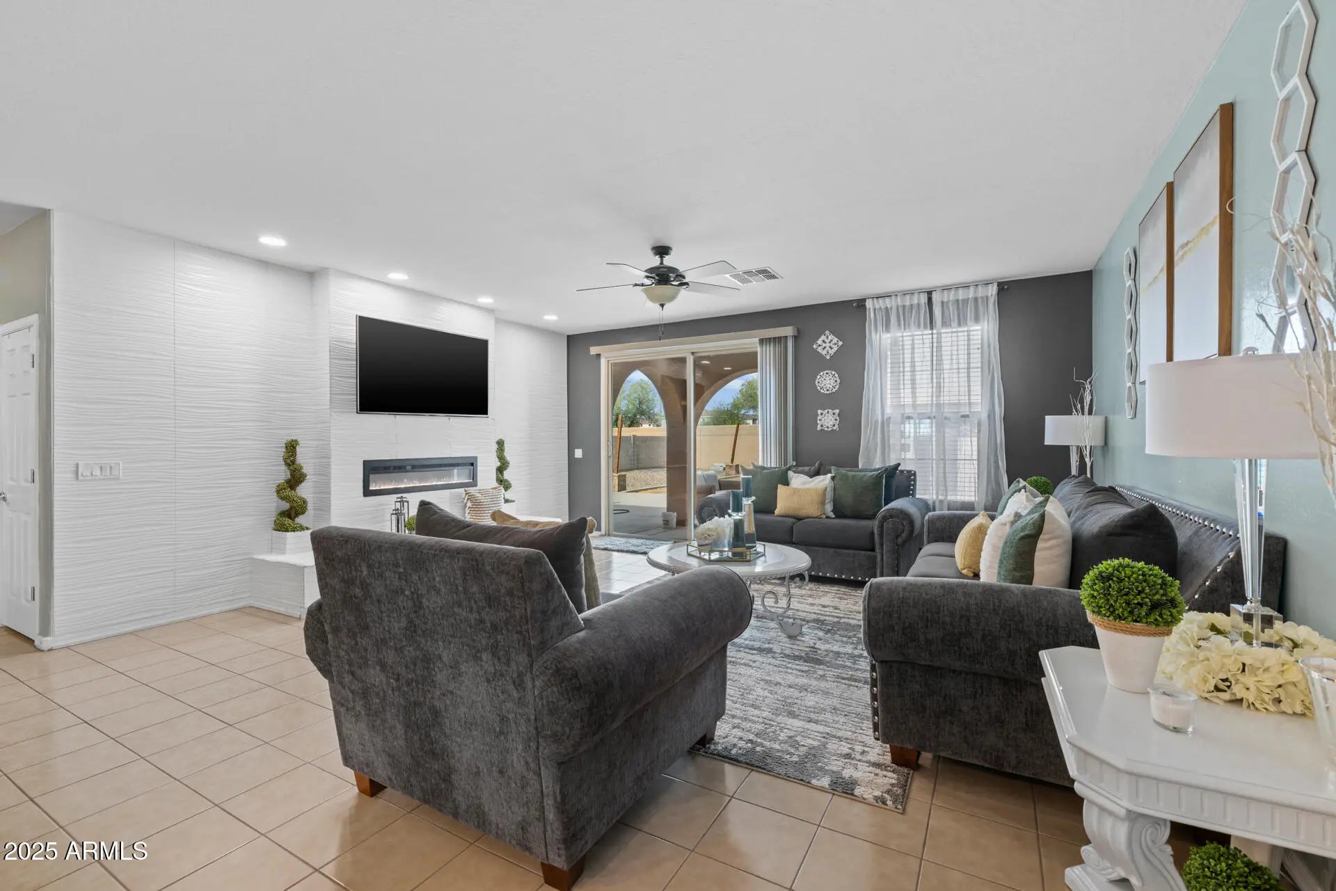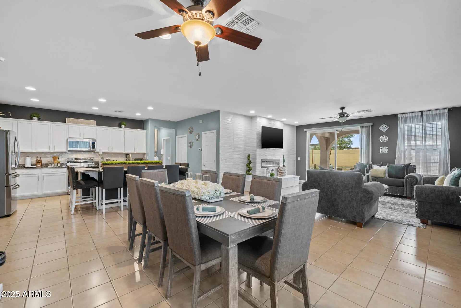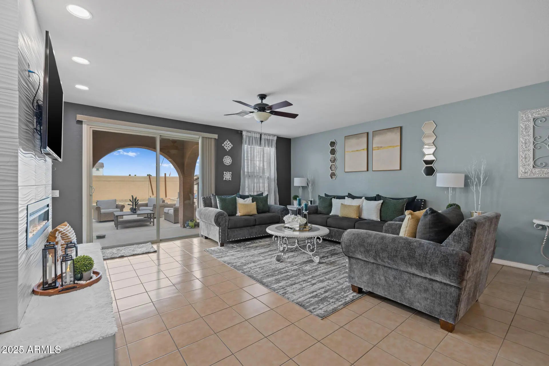 Located on an oversized homesite in the gated Tessera community, this original-owner home offers 4 bedrooms & 3 full baths in 1956 SqFt with an open great room layout. The kitchen has white cabinets, granite counters, tile backsplash, stainless appliances, and a large island with breakfast bar seating for 8. The great room has a custom feature wall with an electric fireplace and sliding doors that lead out to a big backyard with an extensive patio, a storage shed, and plenty of room to add a pool, if desired. The primary bedroom also has a feature wall with an electric fireplace and an en-suite bath with dual sinks, tub/shower combo, and a walk-in closet. One secondary bedroom also has an en-suite bath, perfect for guests! Other features include tile floors throughout (no carpet), and an oversized 2-car garage with an RV gate.