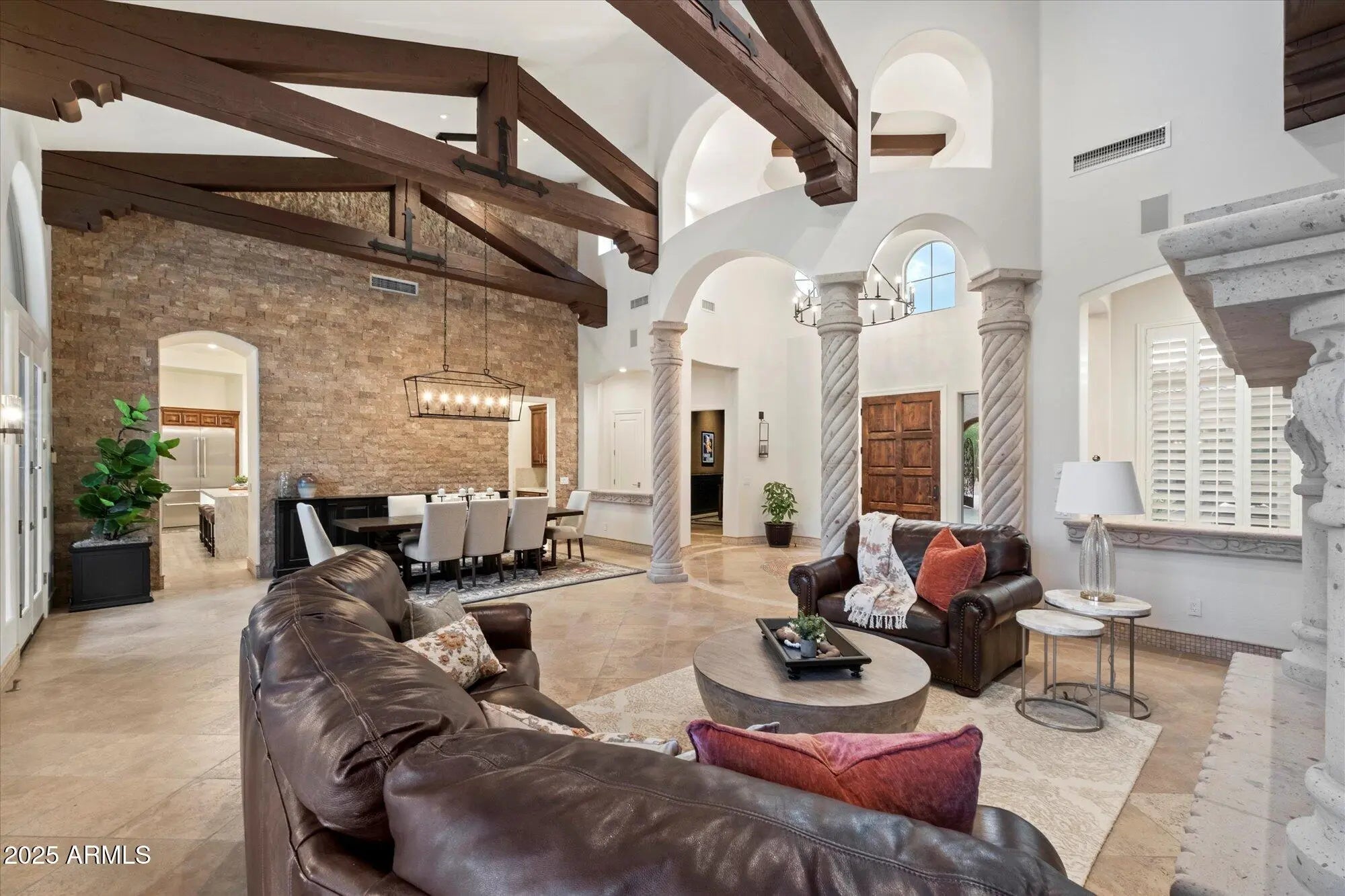 Experience elevated Sonoran Desert living in this completely remodeled, designer-upgraded, and fully furnished estate nestled within the prestigious Saguaro Estates of North Scottsdale. Every surface has been thoughtfully renovated inside and out, creating a pristine, like-new residence that blends timeless architecture with modern sophistication across more than 7,400 square feet. A private gated courtyard introduces soaring interiors with 21-foot vaulted ceilings, exposed wood beams, travertine flooring, and Cantera stone details. The chef's kitchen is a true centerpiece, featuring Taj Mahal quartzite countertops, a full Thermador appliance suite, dual islands with sinks and dishwashers, custom alder cabinetry, and a walk-in pantry. Entertainment spaces include a wet bar, billiards room, and private movie theater. Outdoors, enjoy a resort-style backyard with expansive covered patios, fireplaces, built-in BBQ, PebbleTec pool and spa, travertine decking, and a pool bath. The luxurious primary suite offers a private retreat with fireplace, spa-inspired bath, dual walk-in closets, and exercise room. Additional highlights include an attached guest house, en-suite guest bedrooms, executive office, upgraded lighting and sound systems, and air-conditioned four-car garages with EV outlets.