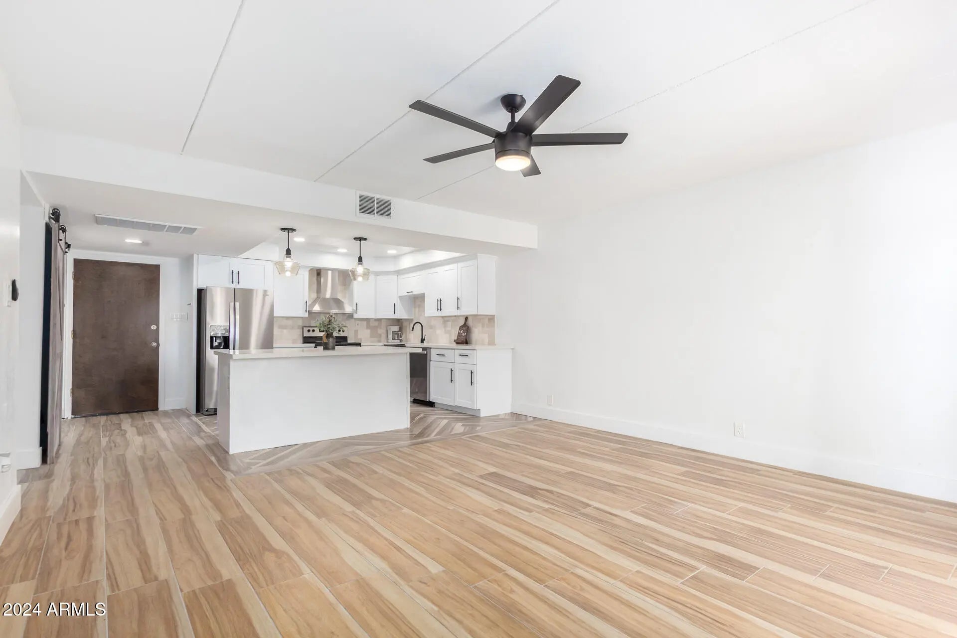 Beautiful ''lock & leave'' ground-level unit, in a highly sought after area, near downtown Scottsdale. Upon entry you'll notice the bright open layout. The updated kitchen has a large island, lots of white cabinetry, new recessed & pendant lighting, travertine backsplash & stainless-steel appliances. This home has large ceiling fans, plantation shutters, and a soft palette that promotes an inviting vibe. Discover the large primary bedroom offering a trendy barn door to the ensuite with a large walk-in shower and spacious walk-in closet. Wide sliding glass doors, provide a seamless connection to the back patio, creating an easy flow for indoor-outdoor living. Great views and lots of amenities in this gated community.