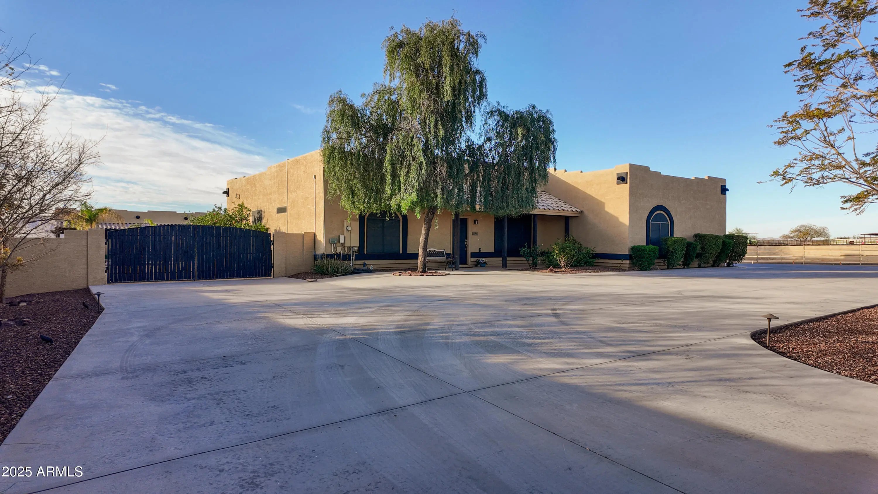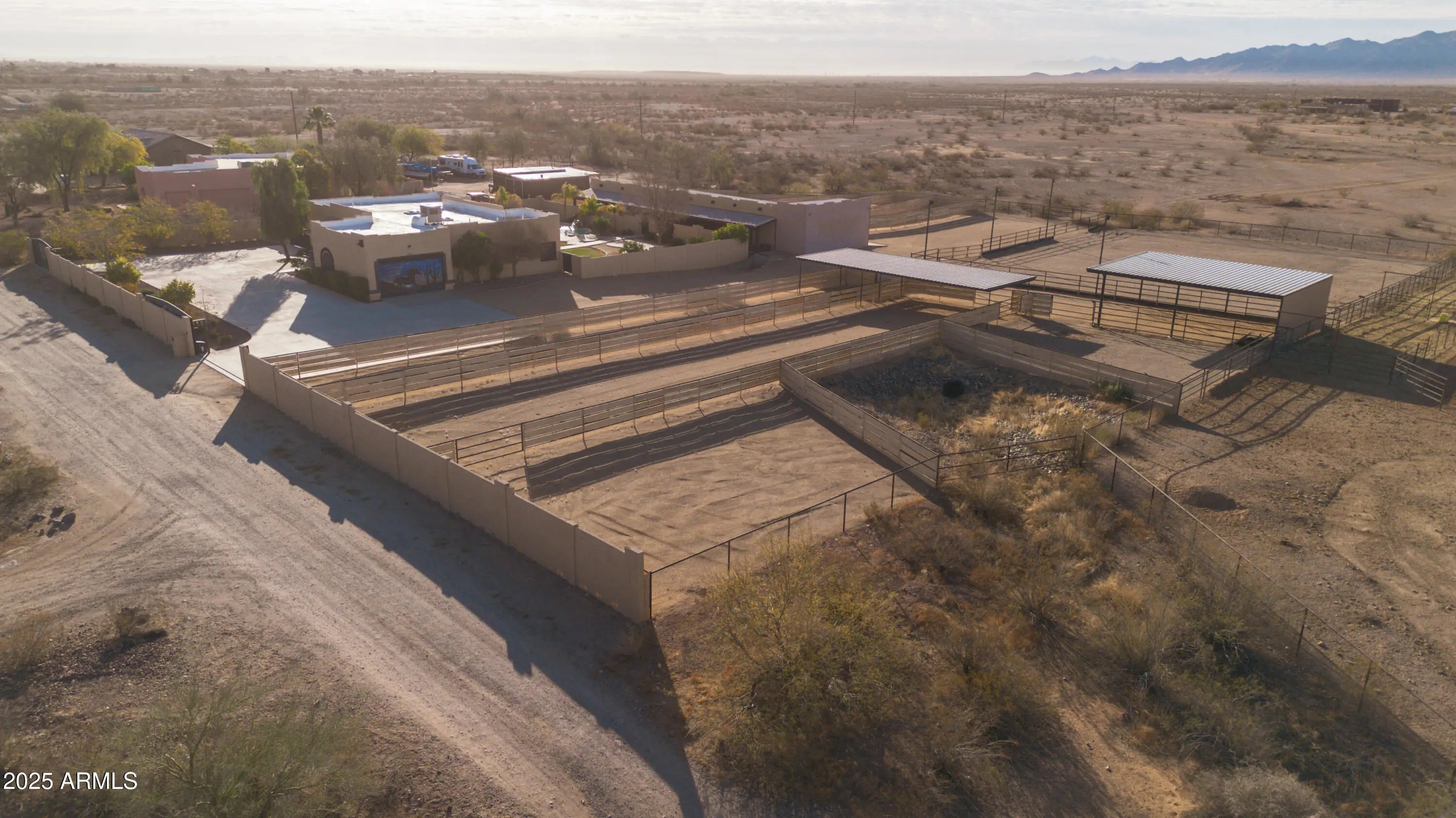 Stunning horse property in Wittmann. Warm up arena, it's not regulation size, it is 110x110 on 1.97 acres, This incredible horse property is on a private road and is fully fenced with automatic gates. It is 2100 square ft. 4 Bedrooms, 2 full bathrooms. Gorgeous backyard with a heated pool that features a rock waterfall. Sky lights. All appliances stay with the property. The entire property is beautifully landscaped with desert bushes and trees, including over 18 citrus trees. Four 20x20 covered stalls that each have a run.Stalls have water and fans for the summer. 3 additional runs with lean-to shades. Barn fits a squeeze of hay. The tack room has electricity, sink, feed bin, and saddle racks. Covered Parking, Rv hook-up near the east side of the house.