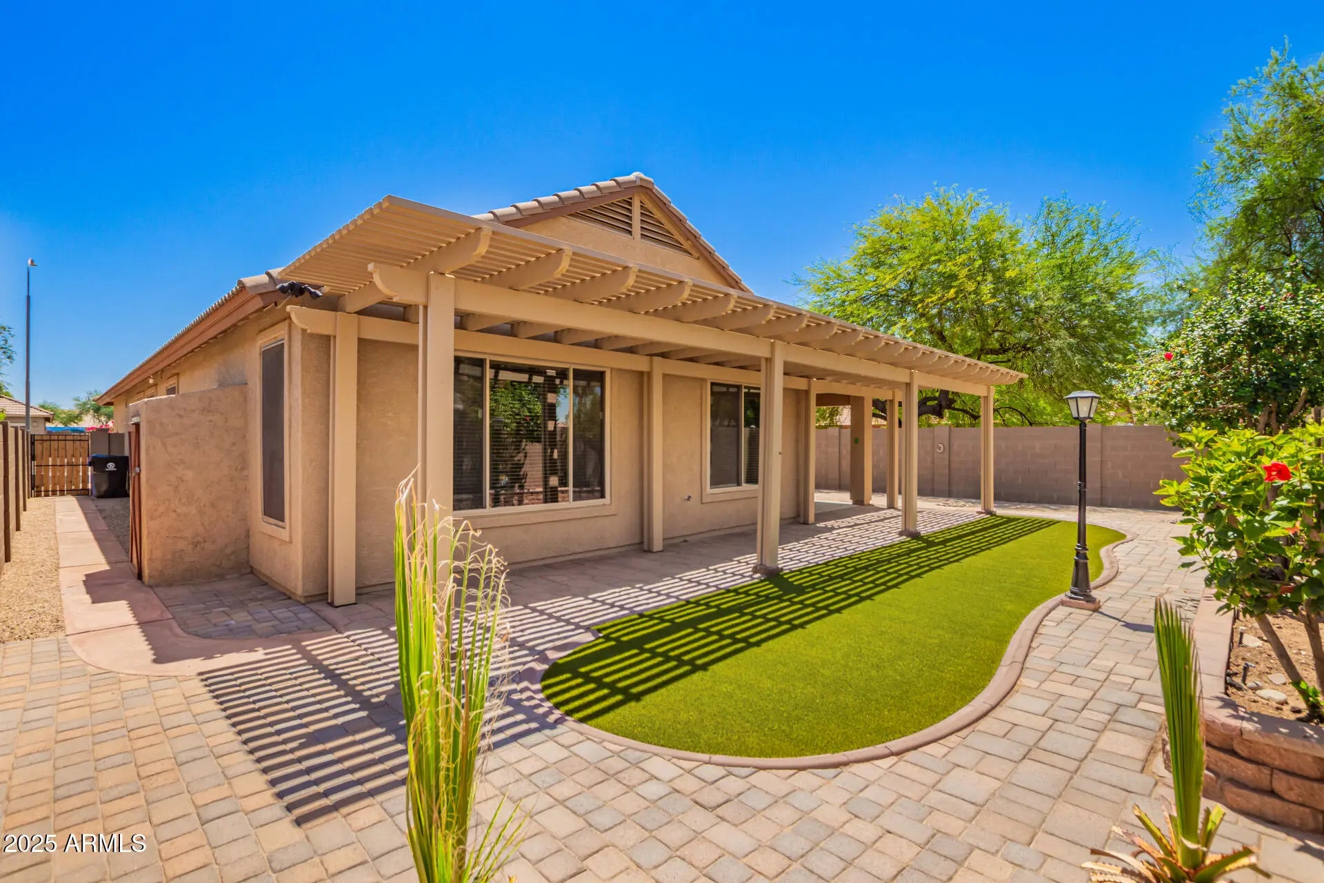 You'll love this beautifully maintained 3-bedroom, 2-bath home located in the highly sought-after Garden Trails neighborhood. This home features numerous upgrades, including granite countertops and stainless steel appliances in the kitchen, highlighted by a premium GE Profile dual-fuel range. Upgraded windows in the Master Bedroom, Dining room, Kitchen and Den with a transferrable warranty. Upgraded patio door installed. Two security doors, front and back, with gorgeous details. Step outside to a backyard designed for relaxation. A stunning pergola shades the extended patio while also providing artificial turf, elegant pavers, and a vibrant flower bed. RV gates provide easy access to the backyard—perfect for storing recreational vehicles or additional outdoor equipment.
