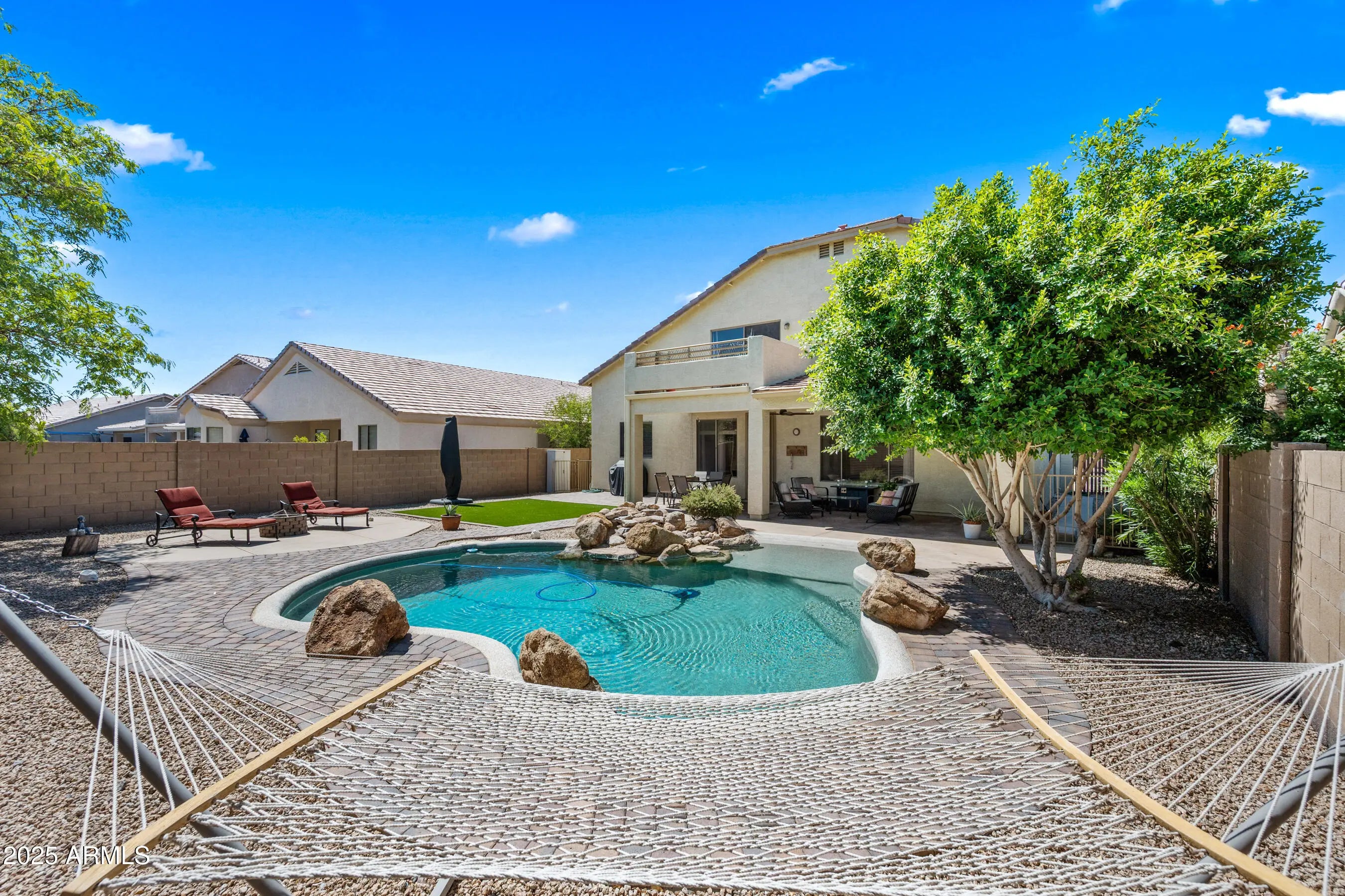 Welcome to this stunning home in Litchfield Park's sought-after Dreaming Summit community, designed with entertaining in mind! This spacious open floor plan features a 3-car garage with abundant storage, this home truly has it all. Step inside to soaring vaulted ceilings that lead you into the elegant formal living and dining area. The kitchen is equipped with rich espresso cabinetry, stainless steel appliances, and sleek composite countertops. An added bonus of this home is a full bedroom and bathroom downstairs, perfect for guests or multigenerational living. The laundry room offers extra storage. The upstairs bedrooms are large and master bedroom has a balcony ideal for stargazing or relaxing Arizona evenings. The backyard is an entertainer's dream with a few sitting areas, and an inviting custom pool with relaxing waterfall. Owner also extended pavers from patio and added mechanical sunshades. The large backyard has a beautiful lush tree that provides lots of shade over the pool and artificial turf for easy maintenance. There's also plenty of side yard space for added privacy. Located near shopping, dining, and Luke Air Force Base, this home is a must-see!