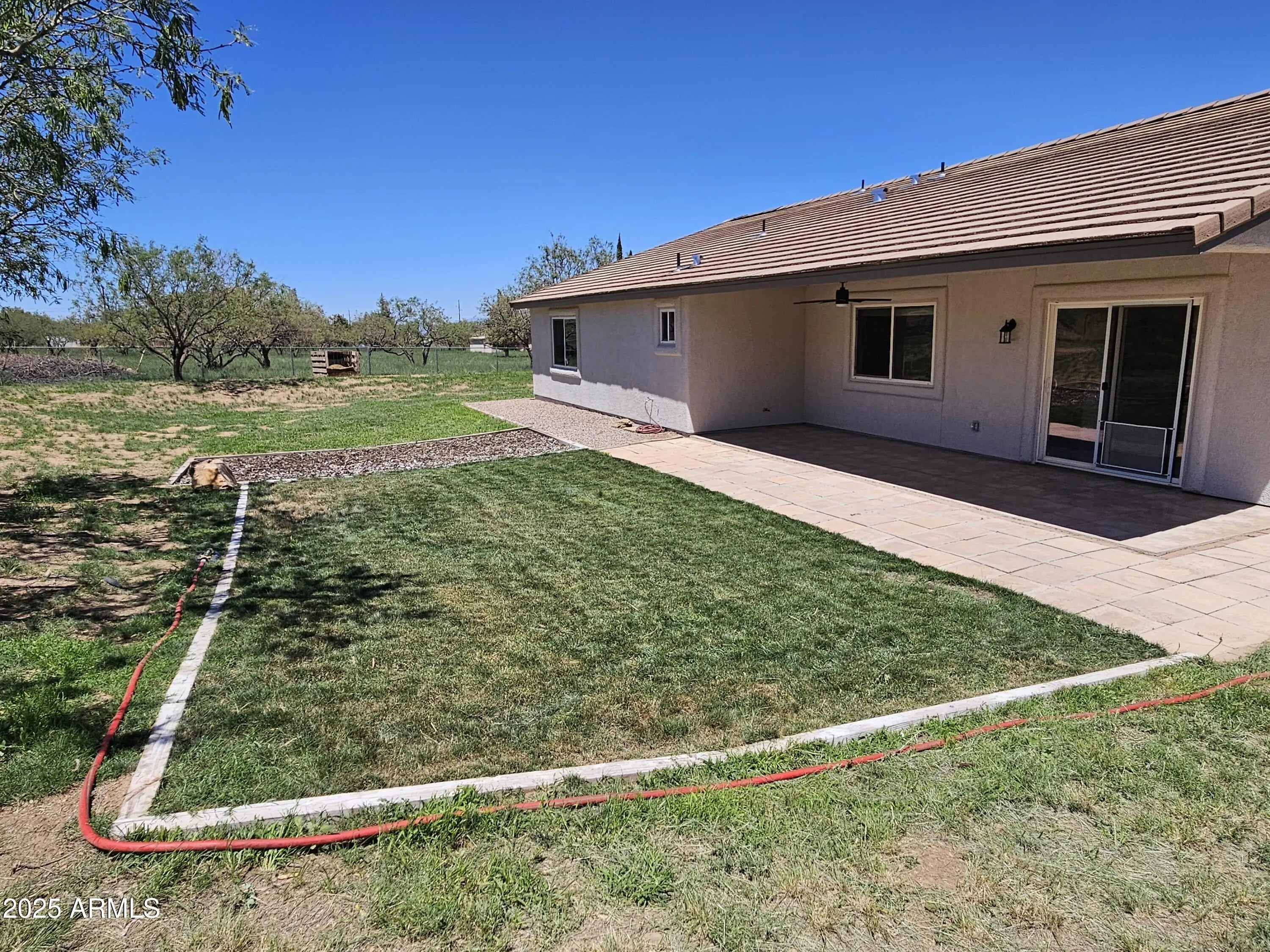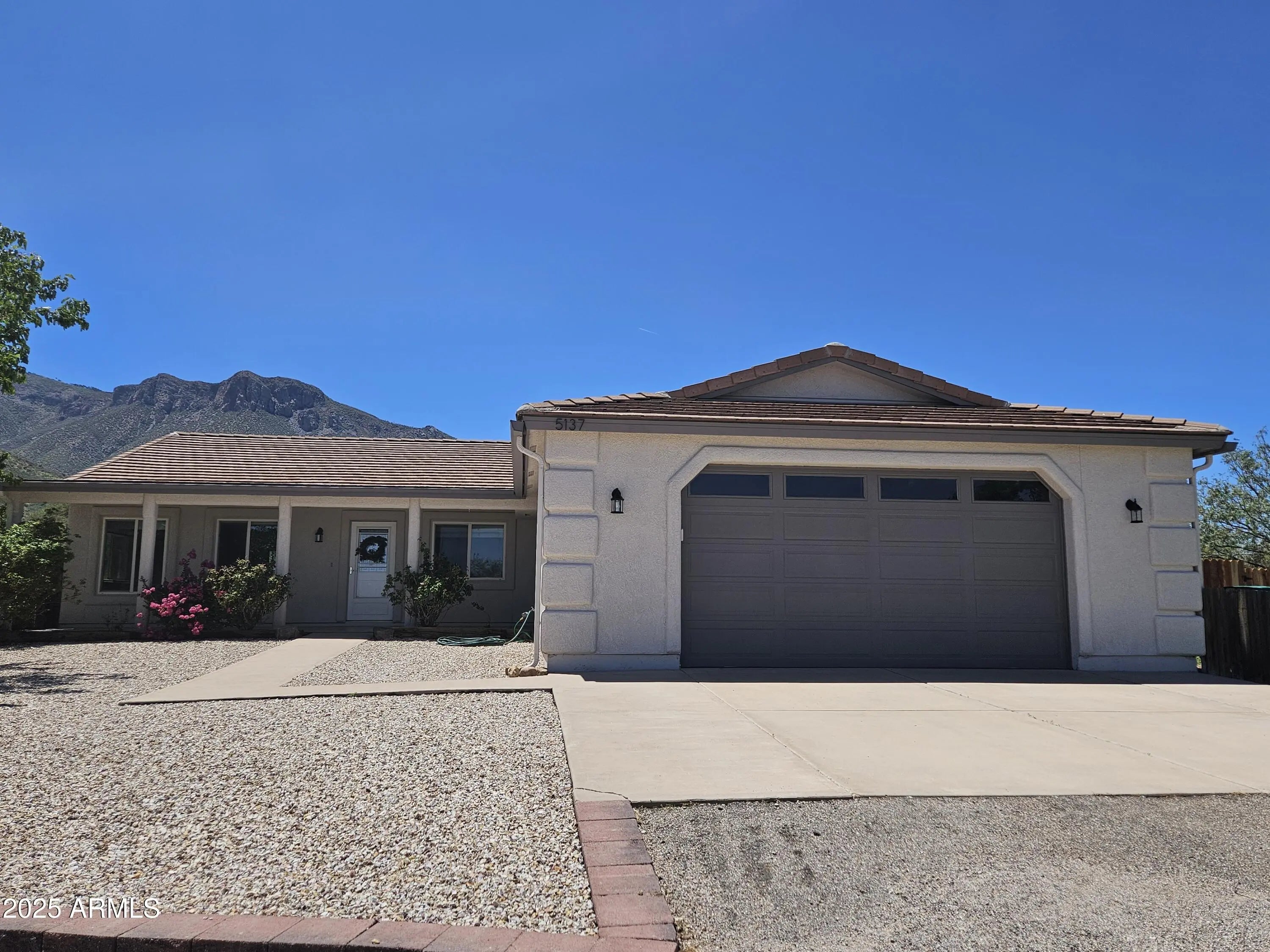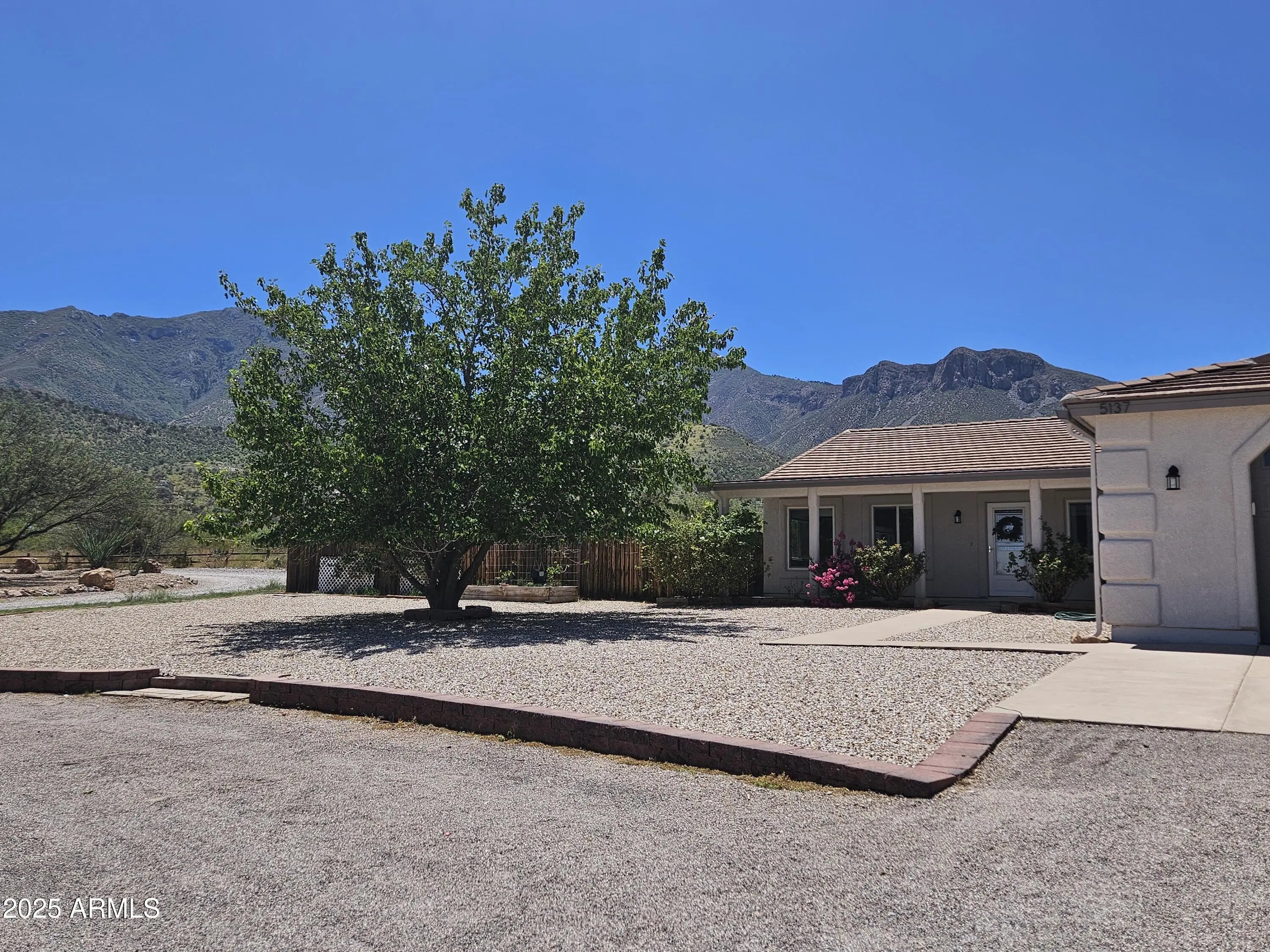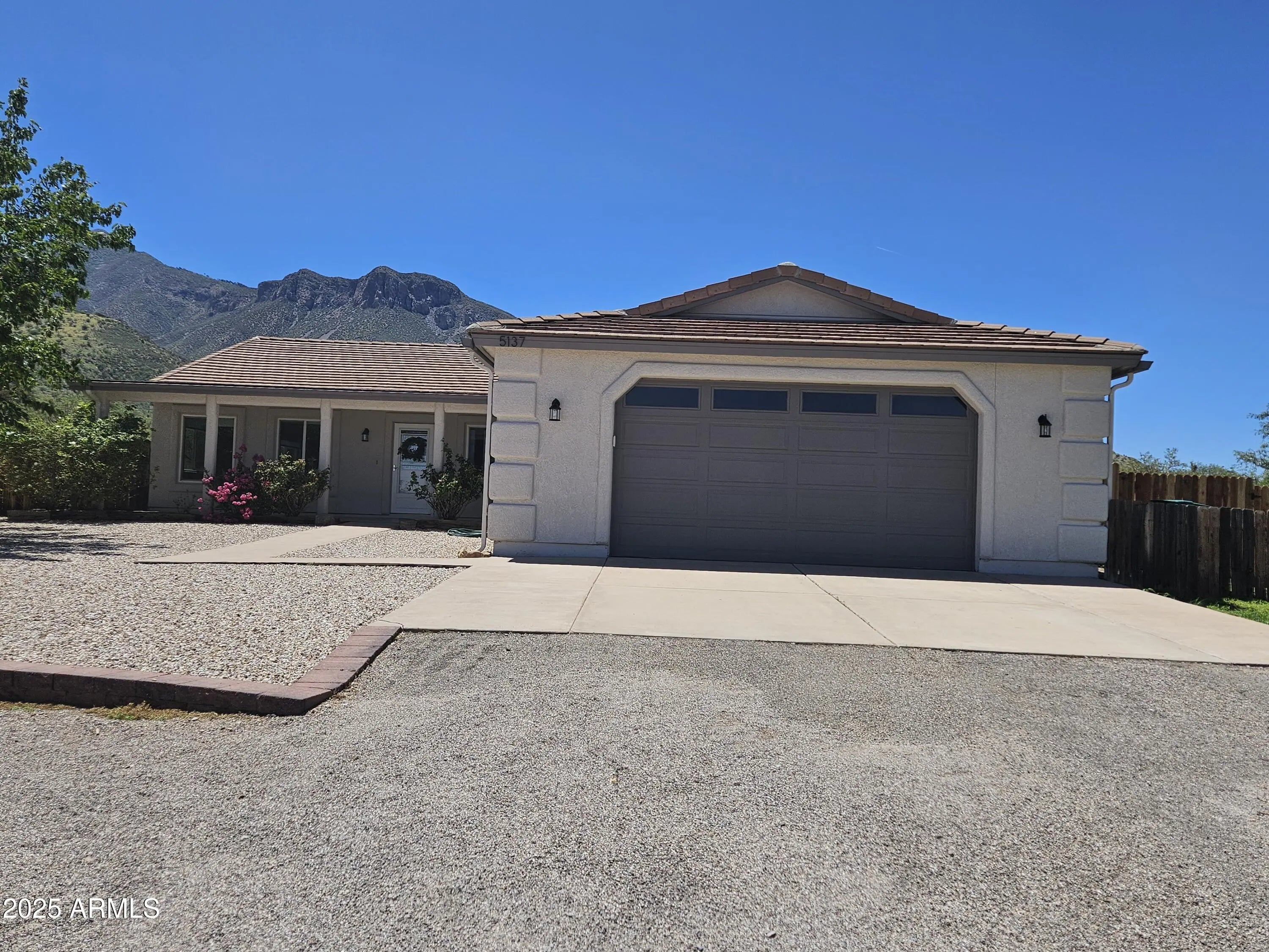 A move-in ready 3 bedroom 2 bath home. The bedrooms and den are extra-large and welcoming. The primary bedroom closet was converted to an office with built-in desk and shelves. Additional closets were installed offering ample closet and dresser/storage space. The laundry room has lots of storage, a deep sink, and a built-in drying rack. Enjoy an Arizona sunset over the Huachuca Mountains from your west facing covered patio. 1.1 acres offers you a garden plot, a fire pit area, a storage shed, and room for a pool. A 2 1/2 car extended garage with built-in storage cabinets and a roll up door on the side. Cement tile roof. Fresh paint inside and outside, 2025. Kitchen updated with quartz countertops and new appliances in 2018. New flooring throughout 2018. Dual pane windows were resealed and recharged, 2025
