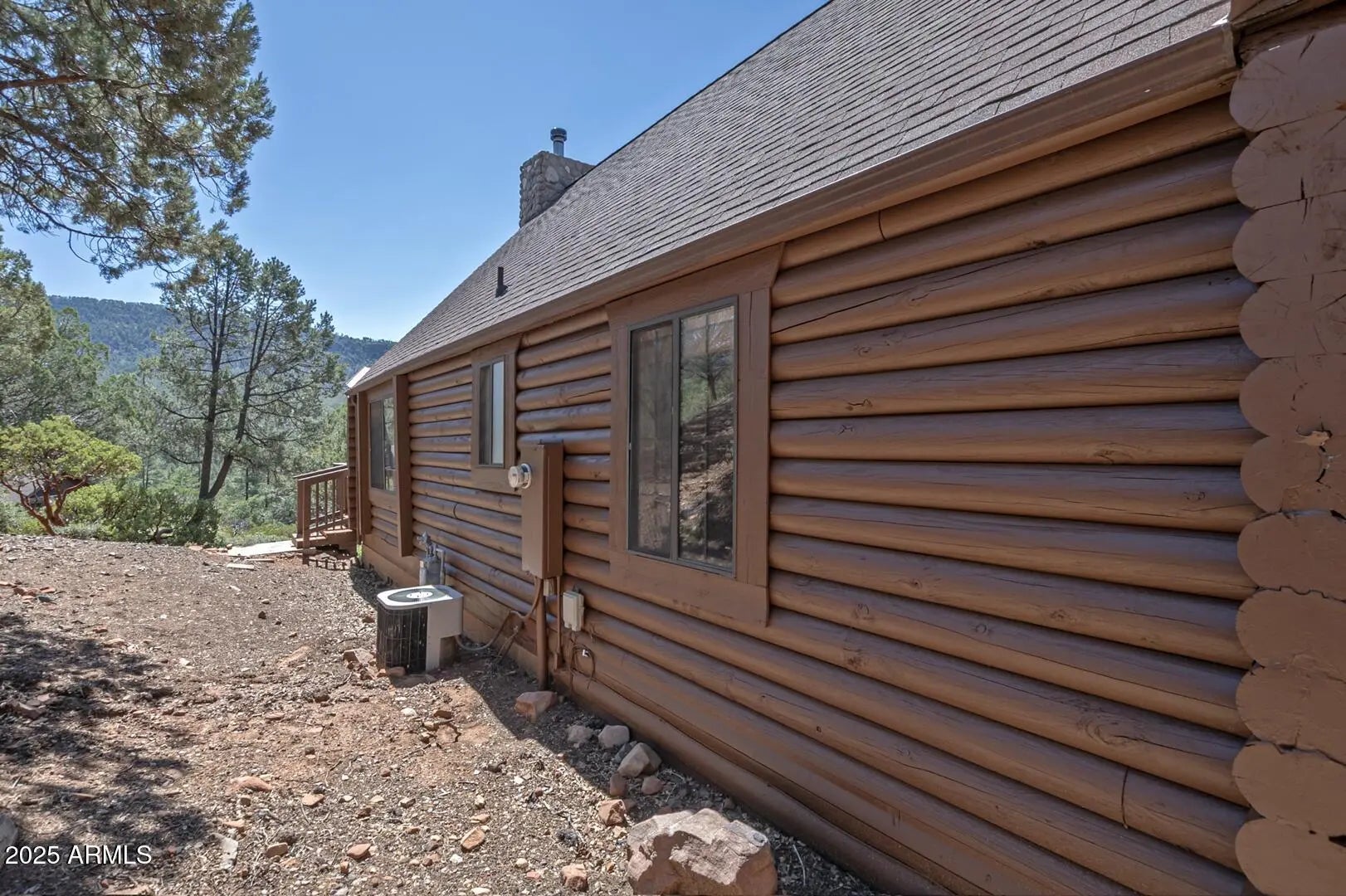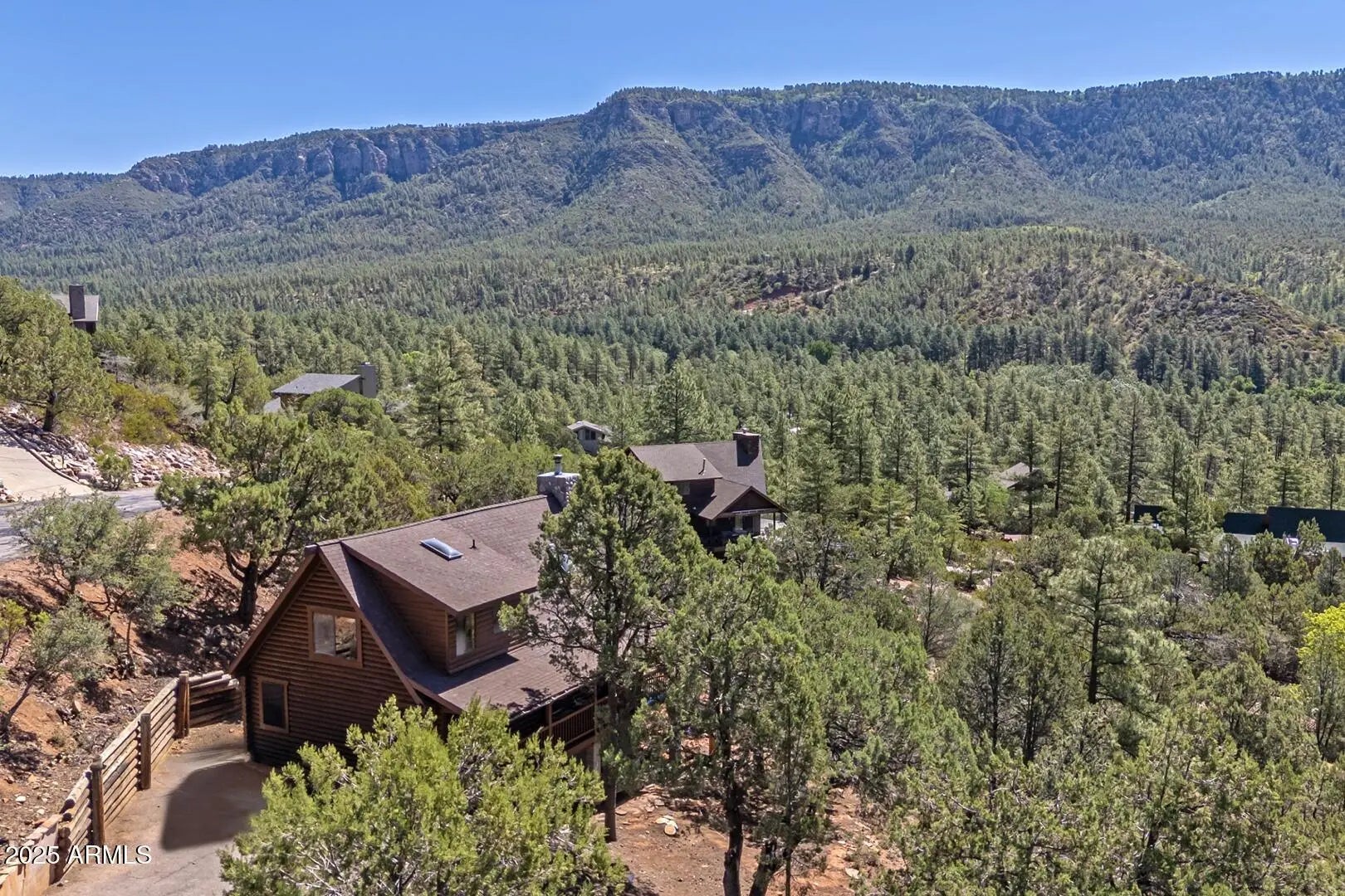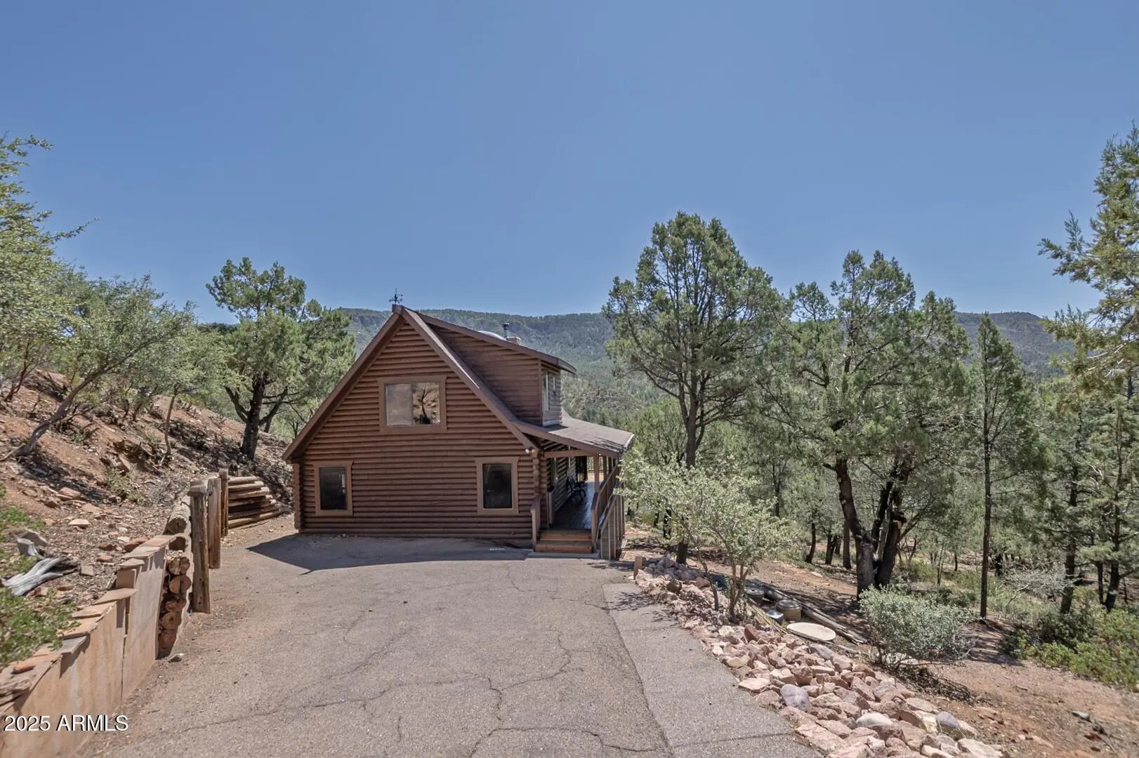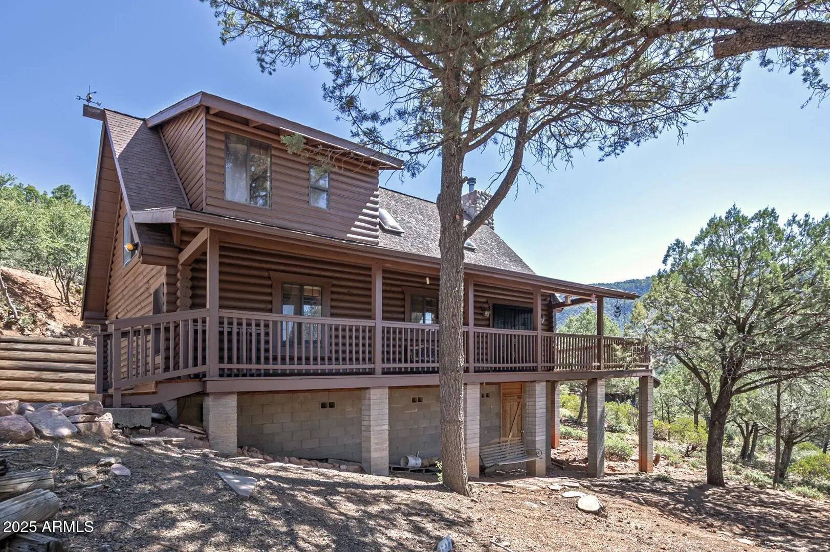 Welcome to cool summer nights,sitting on your front porch with panoramic views of the Mogollon Rim. Nestled in the small community of Pine.This Log cabin sits on two lots and offers a lot of privacy. Enter into the cabin is a wood fireplace as the focal point with stone and full log to the ceiling. There are views from every window. Tongue and groove vaulted ceiling is a nice contrast to the full logs. Island seating in the kitchen with large pantry. Two bedrooms and a full bath off of the kitchen. The large loft upstairs offers an overflow for guests or workout. There is a small desk and a 3/4 bath. The semi wrap around deck offers views of the Mogollon Rim and the East deck, enjoy the morning sunrises. The outside, the house and deck were stained/painted June 2025. New deck support beams and new steps May 2025. The lot was firewised in April and is compliant with the HOA.