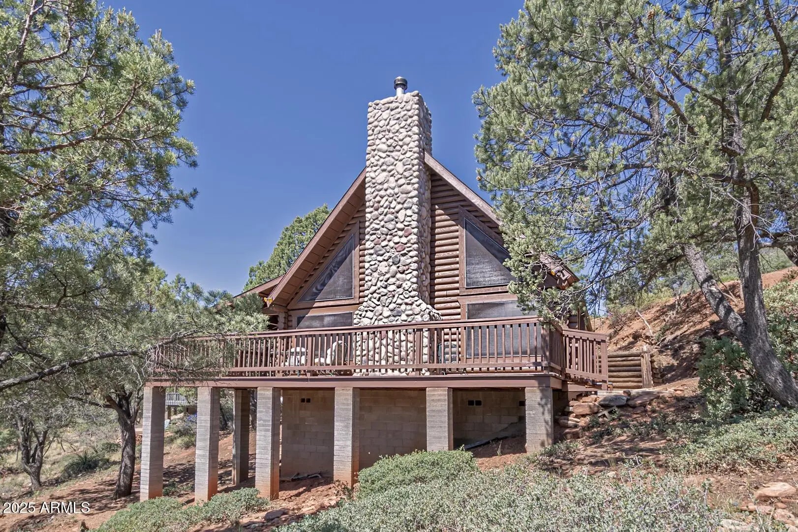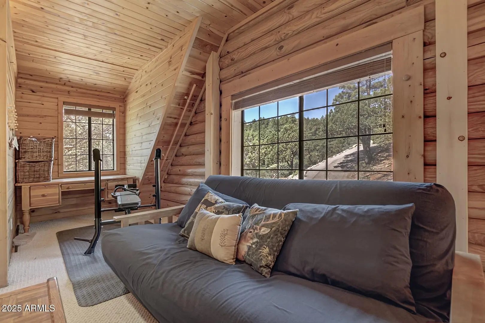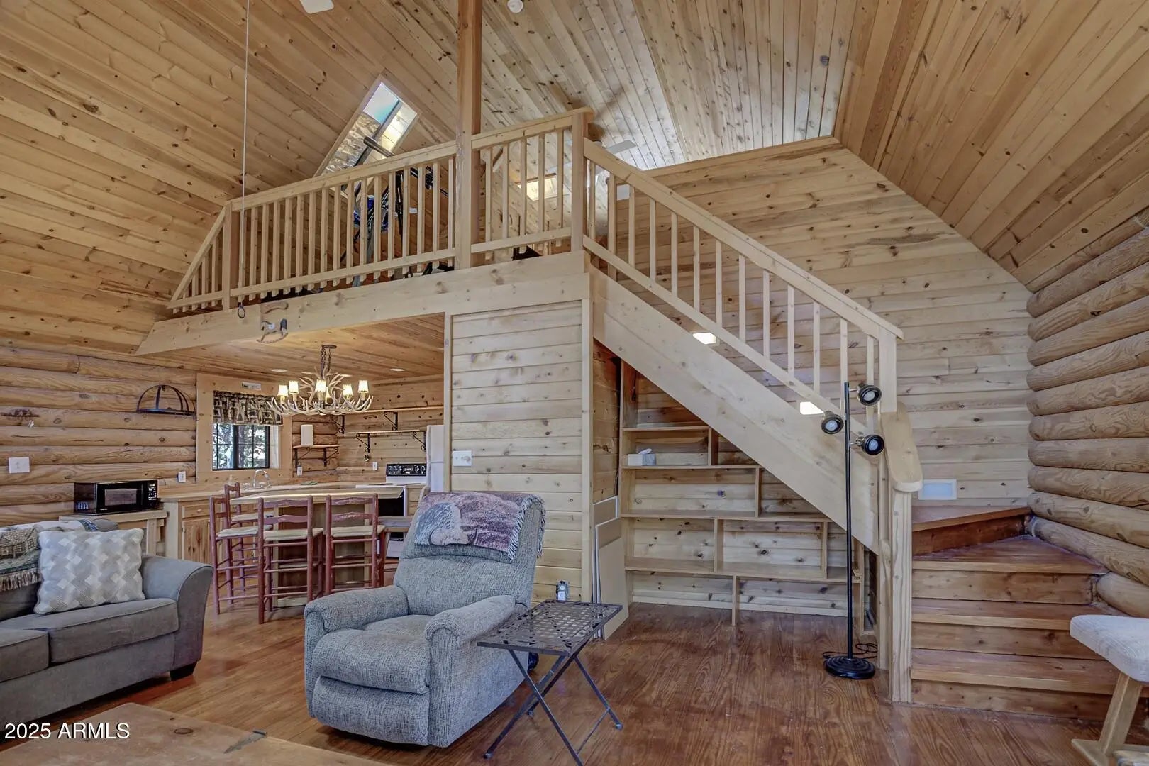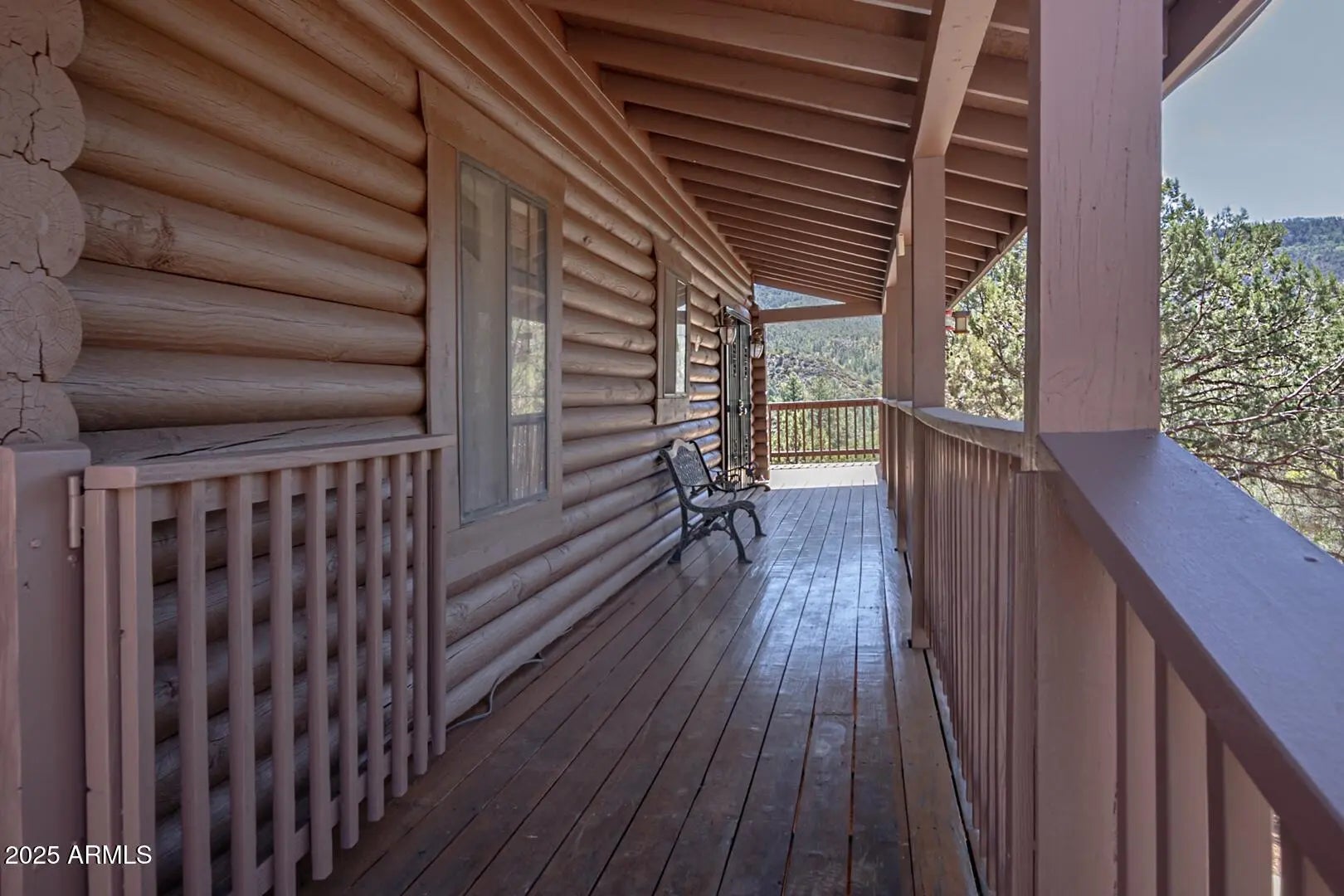 Welcome to cool summer nights,sitting on your front porch with panoramic views of the Mogollon Rim. Nestled in the small community of Pine.This Log cabin sits on two lots and offers a lot of privacy. Enter into the cabin is a wood fireplace as the focal point with stone and full log to the ceiling. There are views from every window. Tongue and groove vaulted ceiling is a nice contrast to the full logs. Island seating in the kitchen with large pantry. Two bedrooms and a full bath off of the kitchen. The large loft upstairs offers an overflow for guests or workout. There is a small desk and a 3/4 bath. The semi wrap around deck offers views of the Mogollon Rim and the East deck, enjoy the morning sunrises. The outside, the house and deck were stained/painted June 2025. New deck support beams and new steps May 2025. The lot was firewised in April and is compliant with the HOA.