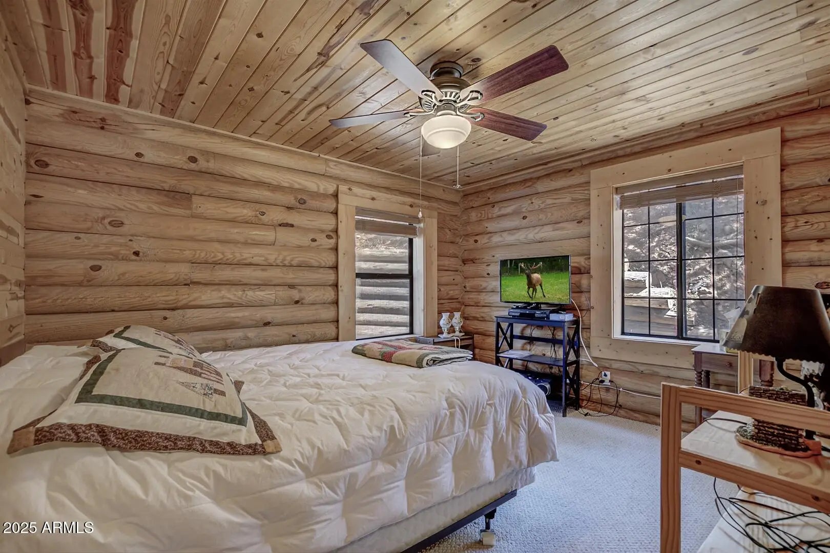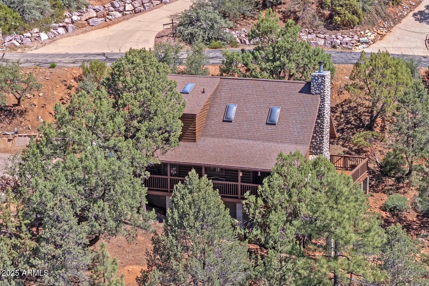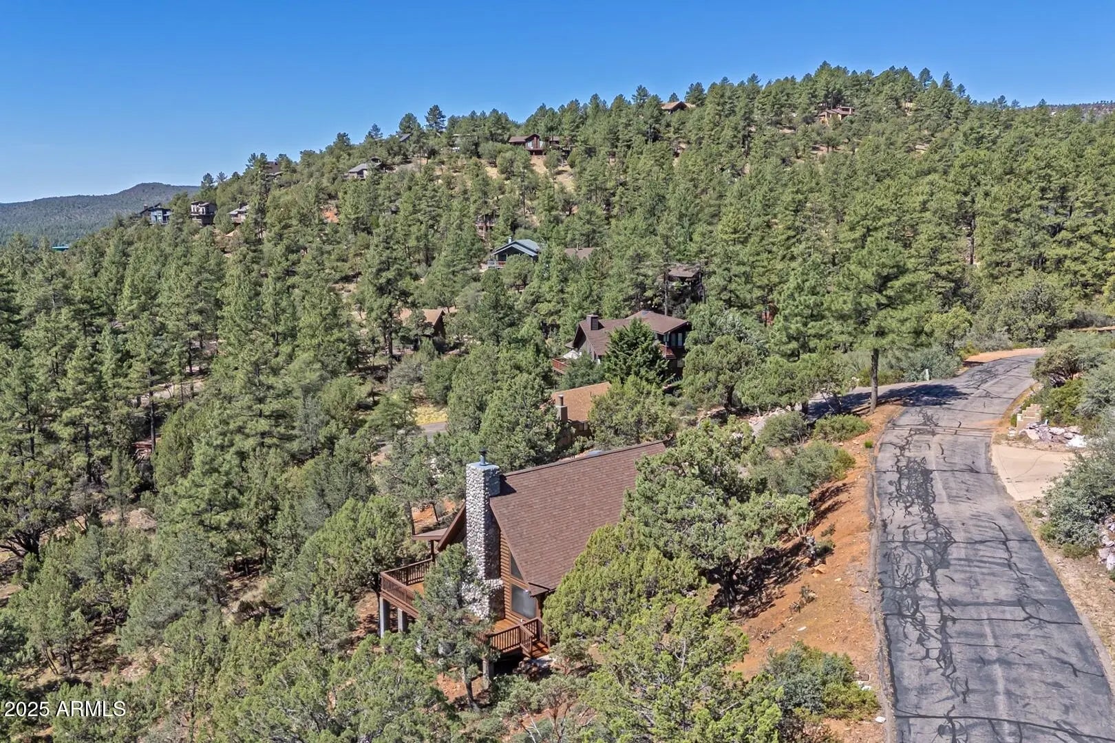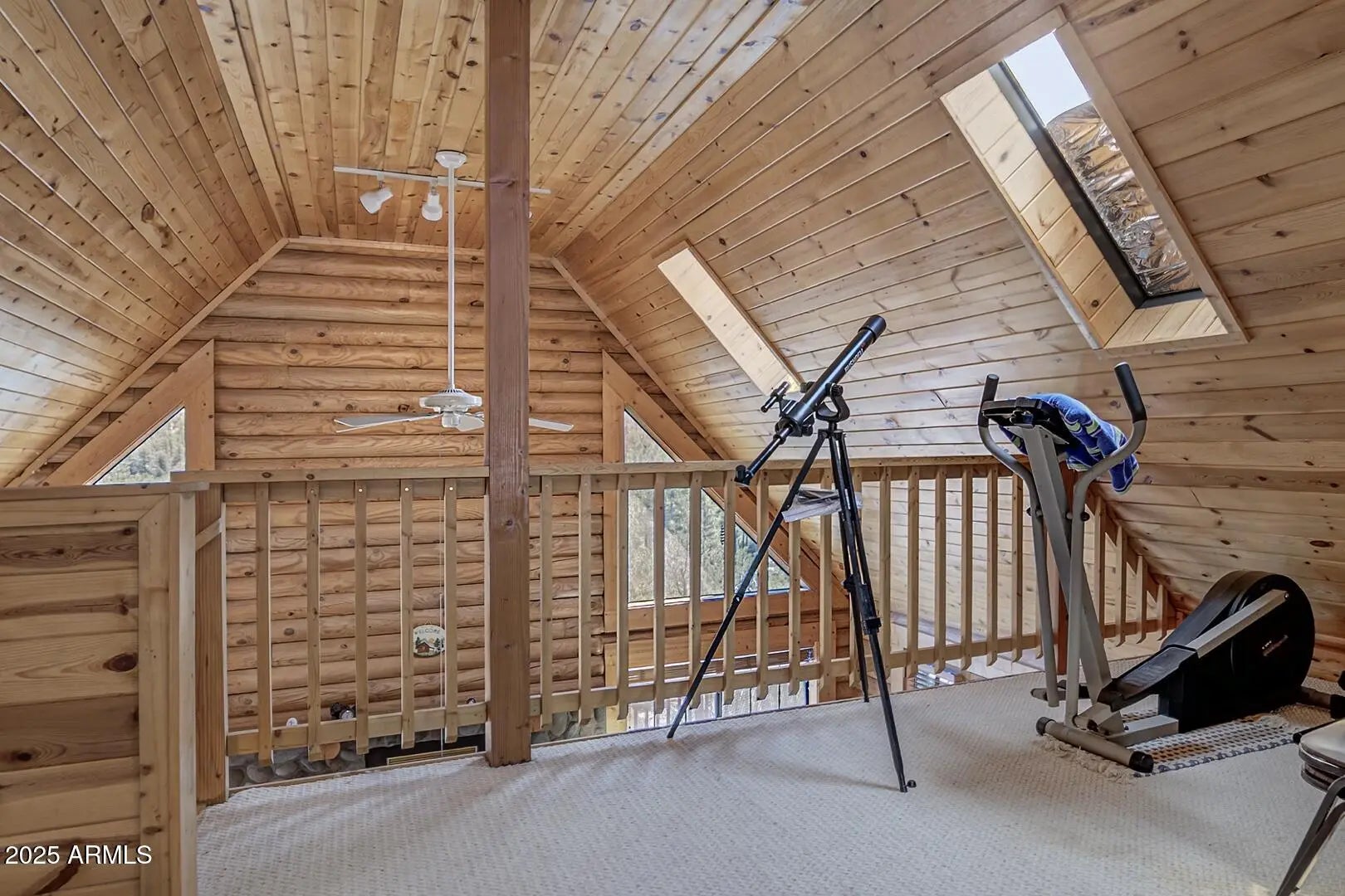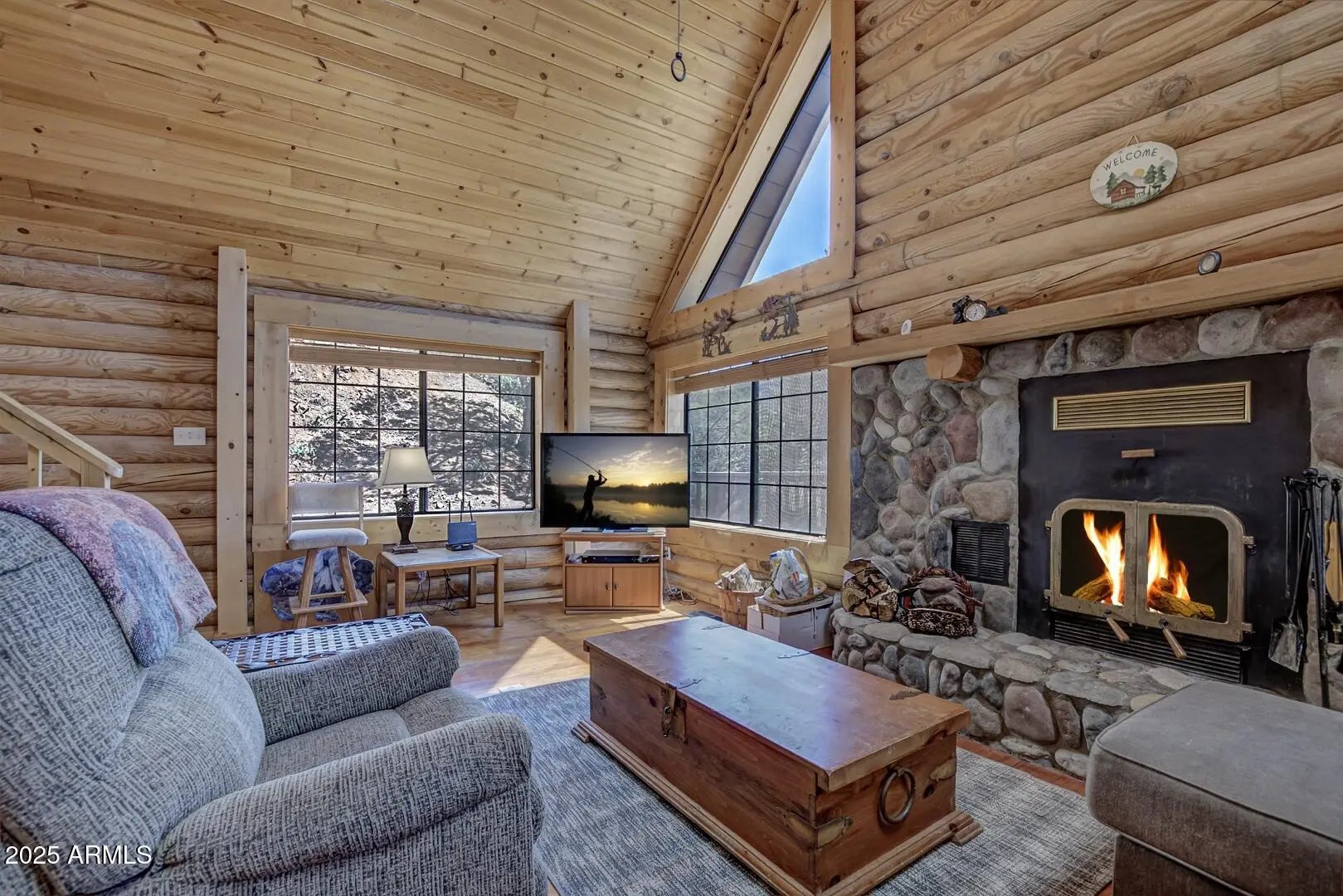 Welcome to cool summer nights,sitting on your front porch with panoramic views of the Mogollon Rim. Nestled in the small community of Pine.This Log cabin sits on two lots and offers a lot of privacy. Enter into the cabin is a wood fireplace as the focal point with stone and full log to the ceiling. There are views from every window. Tongue and groove vaulted ceiling is a nice contrast to the full logs. Island seating in the kitchen with large pantry. Two bedrooms and a full bath off of the kitchen. The large loft upstairs offers an overflow for guests or workout. There is a small desk and a 3/4 bath. The semi wrap around deck offers views of the Mogollon Rim and the East deck, enjoy the morning sunrises. The outside, the house and deck were stained/painted June 2025. New deck support beams and new steps May 2025. The lot was firewised in April and is compliant with the HOA.
