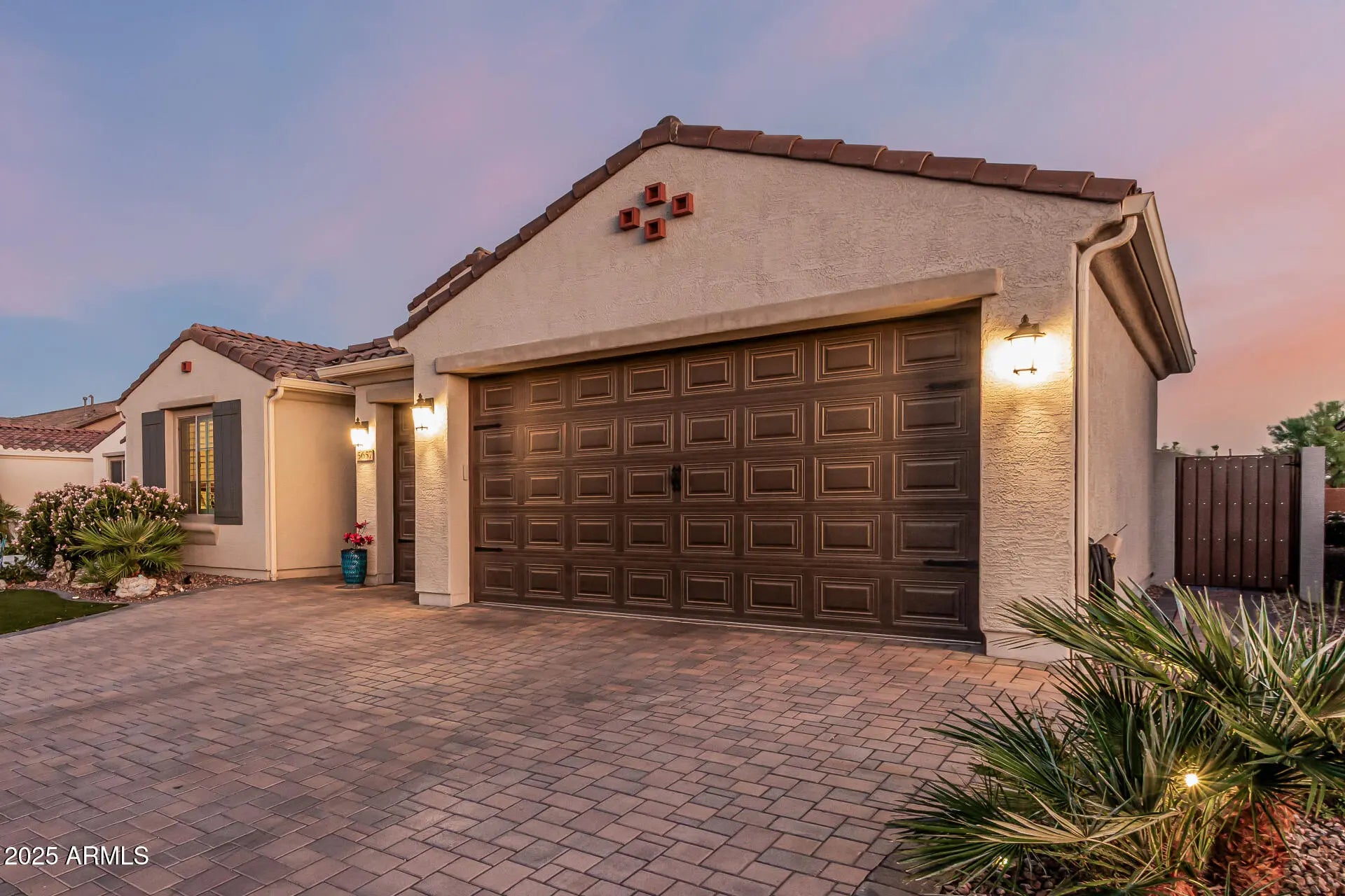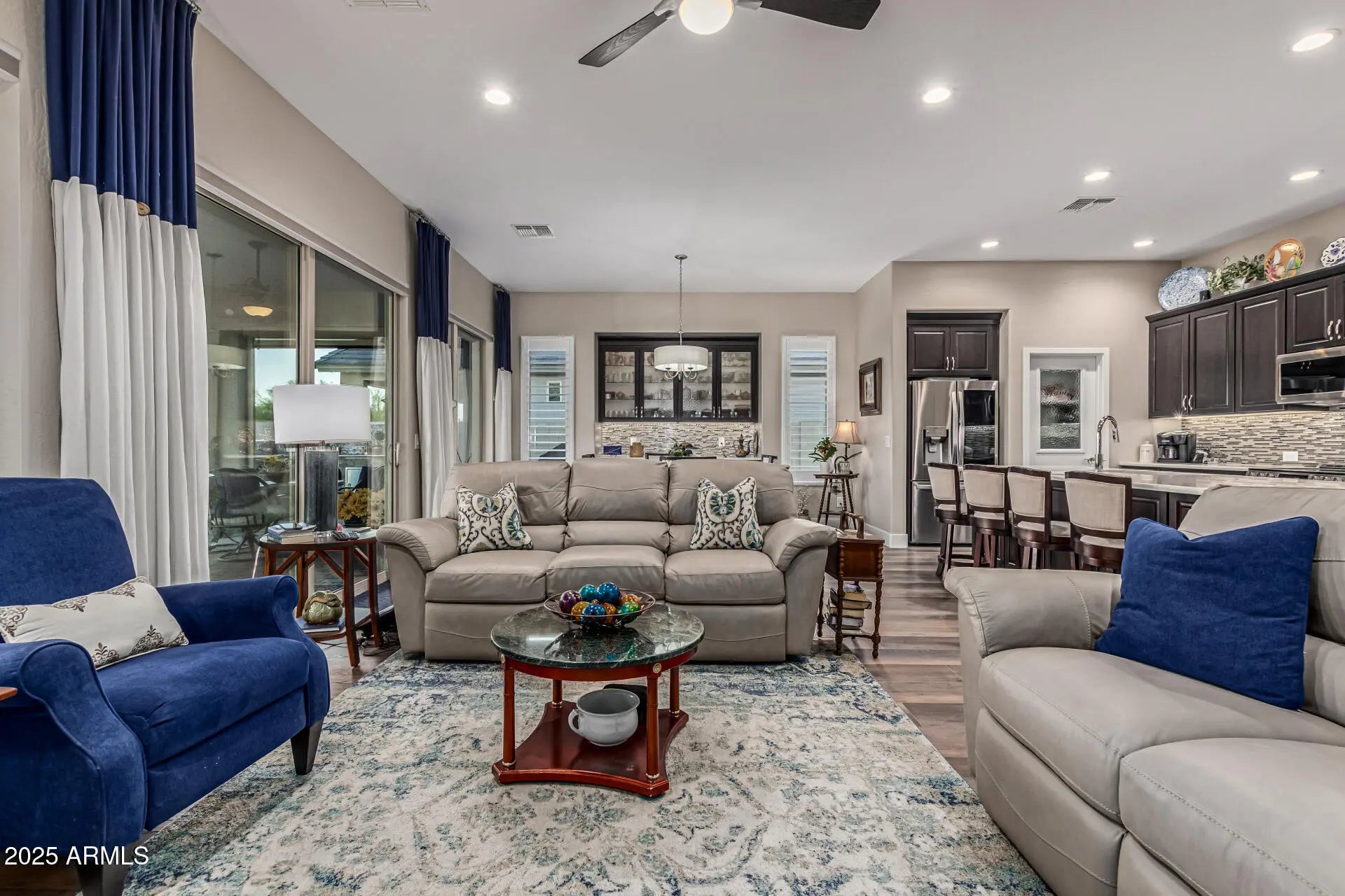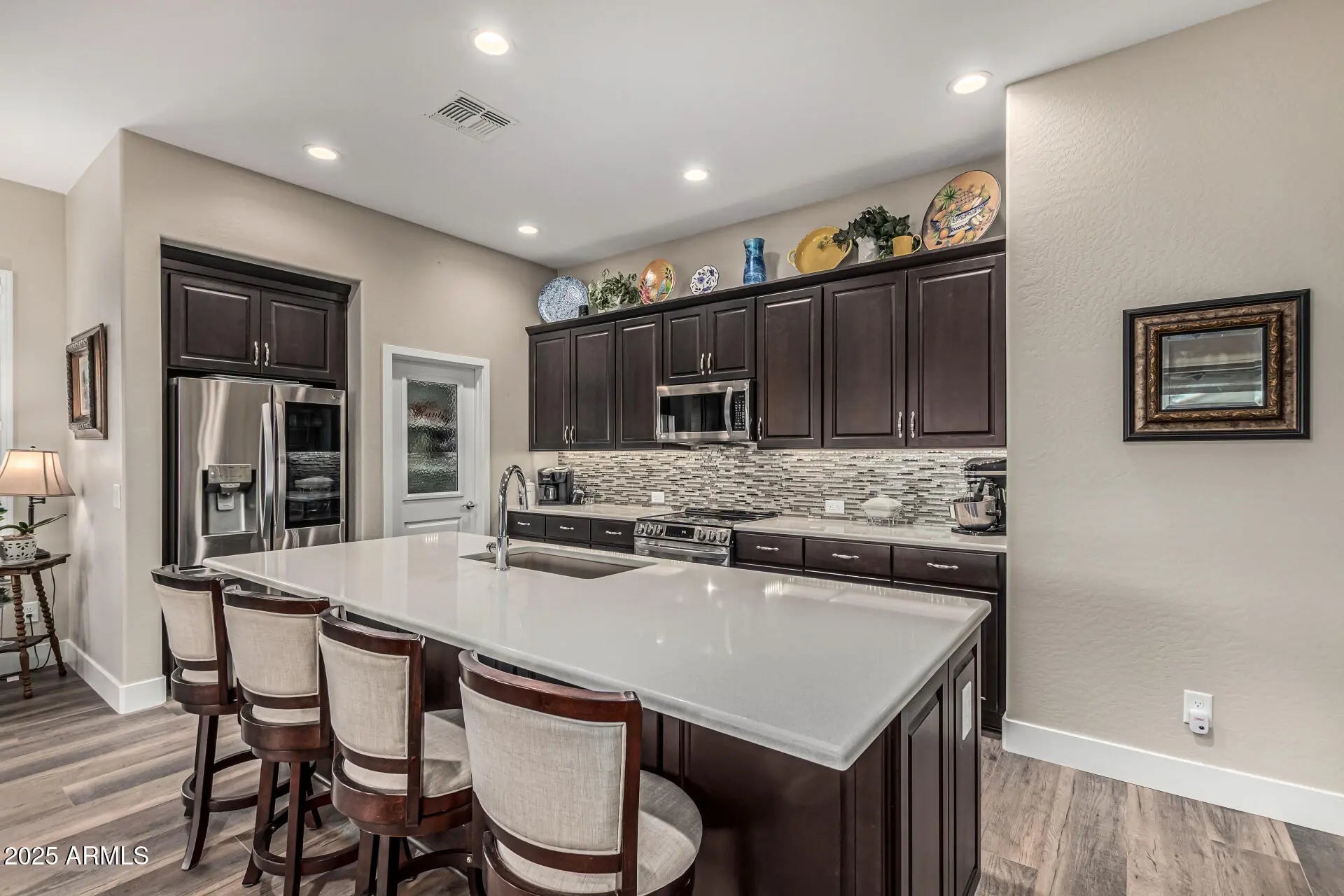 Welcome to your dream home in the Robson Ranch at even a better PRICE! This almost-new REVA model is packed with upgrades and charm, starting with larger 2.5-car garage, paver driveway, inviting curb appeal with custom glass door. Inside, you'll love the custom wood-look floors, plantation shutters, and bright, open great room. The kitchen is a total showstopper boasting LG ThinQ stainless appliances, Quartz counters, mosaic tile backsplash, a center island with breakfast bar, walk-in pantry, and chic Expresso cabinetry. Dining room cabinets, built-in Alcove. Spacious primary bedroom featuring walk-in shower and large walk-in closet. There's a sunny den ready for your office or hobby. The Guest Suite is perfect for your extra family. Laundry room has upper/lower cabinets. This is it! Outdoors, you'll find Covered Paver Patio with 3 Solar Remote Screens, 2 Dual-Fans, mounted TV, plus a custom built-in BROIL KING BBQ kitchen, lots of green turf, and a large pergola with a swing that's just waiting for AZ sunsets. Enjoy the mature landscaping and outdoor lighting. There is nothing for you to do but enjoy this lifestyle! Sellers are on the move, and this beauty is priced to sell fast. Take advantage of over $200k in upgrades and improvements! No waiting, no building, just start living the good life today! List of all upgrades and improvements is in Documents.