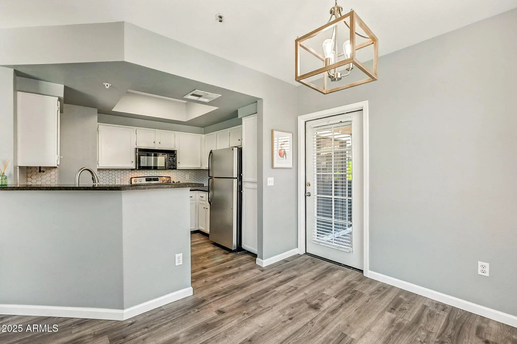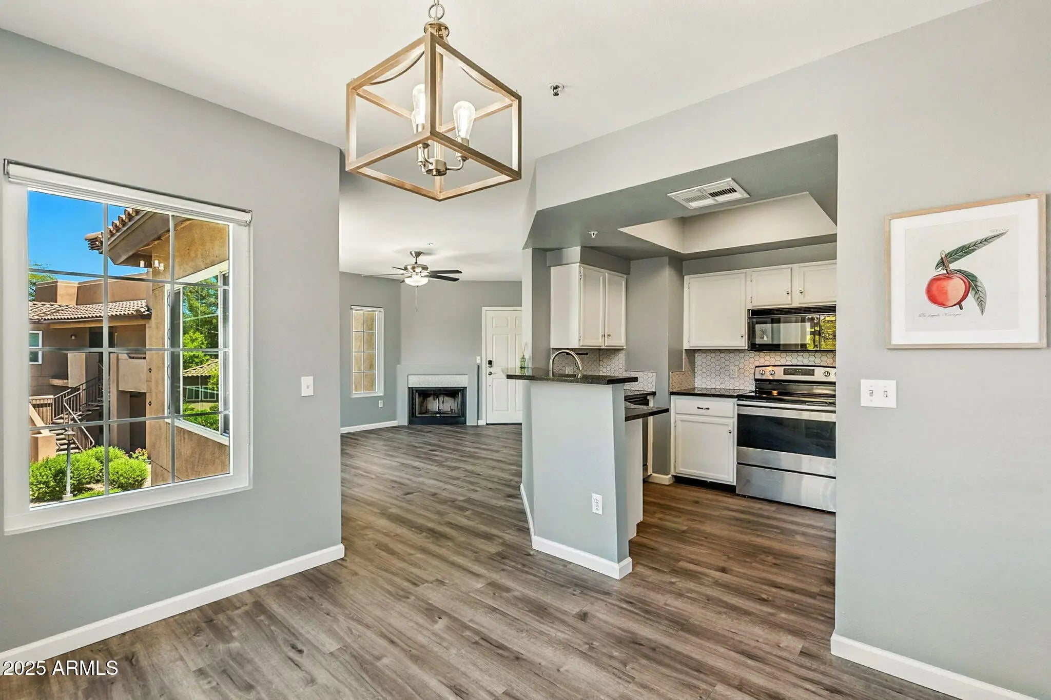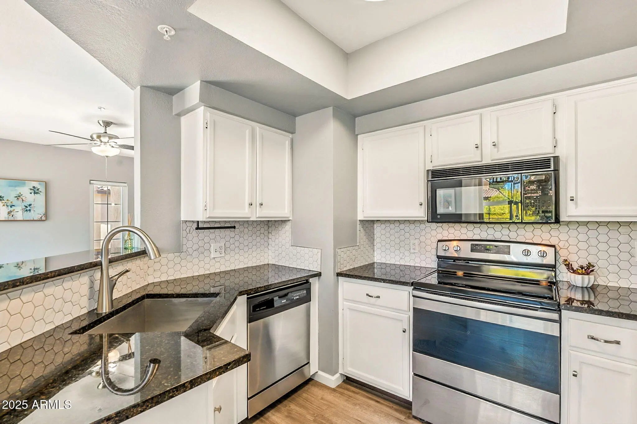 This home is Poolside! Updated 2 bedroom unit with a garage! This light and bright home has been thoughtfully designed throughout with updated paint, new baseboards, luxury vinyl plank floors, dual pane windows and so much more. The kitchen features granite countertops, custom backsplash, and stainless steel appliances. Large covered patio with views! The community is complete with heated pool, spa, club house, tennis courts and BBQ's! Conveniently located close to all that Scottsdale has to offer.