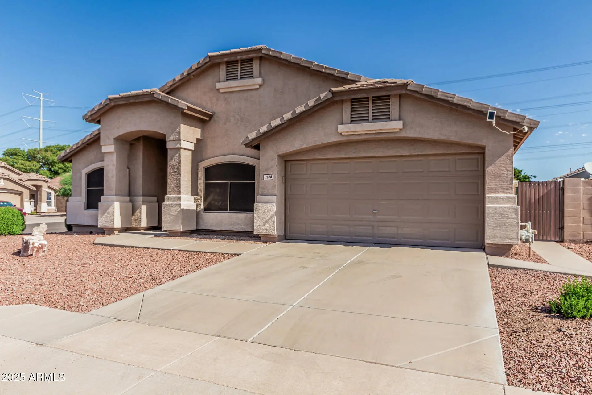 Welcome to your new home nestled in the desirable Meridian Pointe neighborhood of East Mesa! This inviting three-bedroom, two-bathroom home offers comfortable living and convenient location. As you enter the home, you'll be greeted by vaulted ceilings and a bright and light living room. The kitchen and dining area has ample counter space, stainless steel appliances and walk-in pantry. The heart of the home is a cozy family room with fireplace to relax and unwind. The primary bedroom is very spacious with an exit door to the back patio and an ensuite bathroom with double vanities and plenty of closet space. The backyard has a manicured lawn with landscape pavers and rock. Great East Mesa location close to shopping, dining and access to freeways!