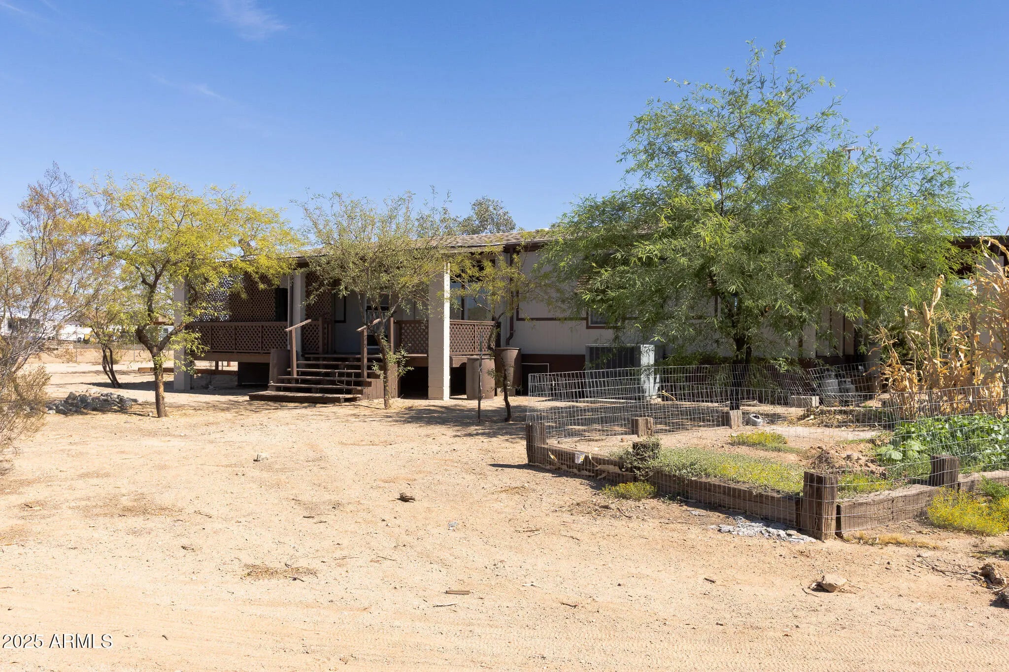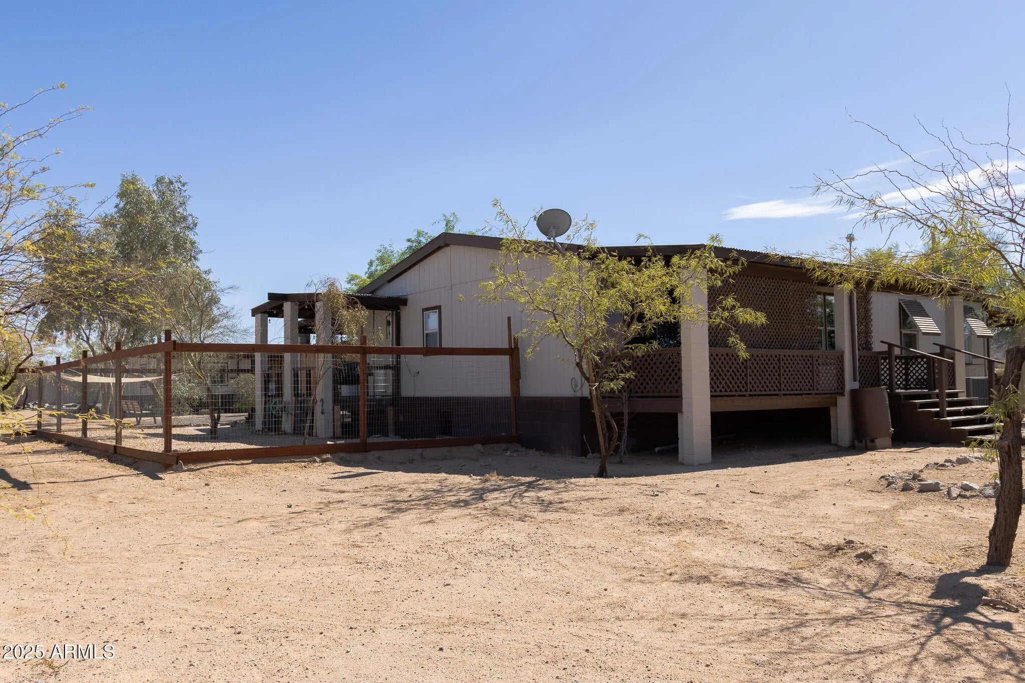 Don't miss your chance to own this rare gem - spacious 2004 Palm Harbor home tucked away on over one acre, with privacy and serene desert living. Open, revitalized interior (2022) Step inside from your covered deck into an open-concept layout featuring gray plank tile flooring and vaulted ceilings. Modern kitchen upgrades - cook and entertain with soft-close gray shaker cabinets paired with quartz countertops. Convenient laundry and family space - The thoughtfully engineered flow places the laundry just off the kitchen, and the adjoining eat-in kitchen and family room are ideal for gatherings. Primary suite with its own patio access, walk-in closet and 3/4 bath. Versatile Extra Bedrooms - A large 2nd bedroom plus a third room used as a bedroom. Stylish Full Bath Remodel (2022) - Enjoy a refreshed, contemporary full bath with modern finishes. Expansive Outdoor Features - Over 1 acre fenced lot, offering endless possibilities - features a garden, dog run, covered parking, RV parking and storage garage. This beautifully updated Palm Harbor home (55 x 32) combines privacy, modern conforts and prime Queen Creek positioning. Enjoy a peaceful rural setting with easy access to new infrastrucutre, shopping, dining and the booming job market in Pinal County. BRAND NEW AC INSTALLED 8/15/2025