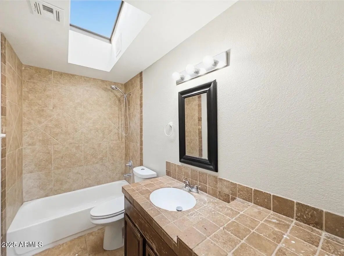 This inviting 3-bedroom, 2-bath home offers 1,453 square feet with an open layout, tile flooring throughout, and a kitchen featuring a practical island. Bathrooms include a skylight, walk-in shower, and a full tub/shower combo. Walk-in closets and a washer and dryer add convenience. The backyard, enclosed by a block fence, provides privacy and space to relax.