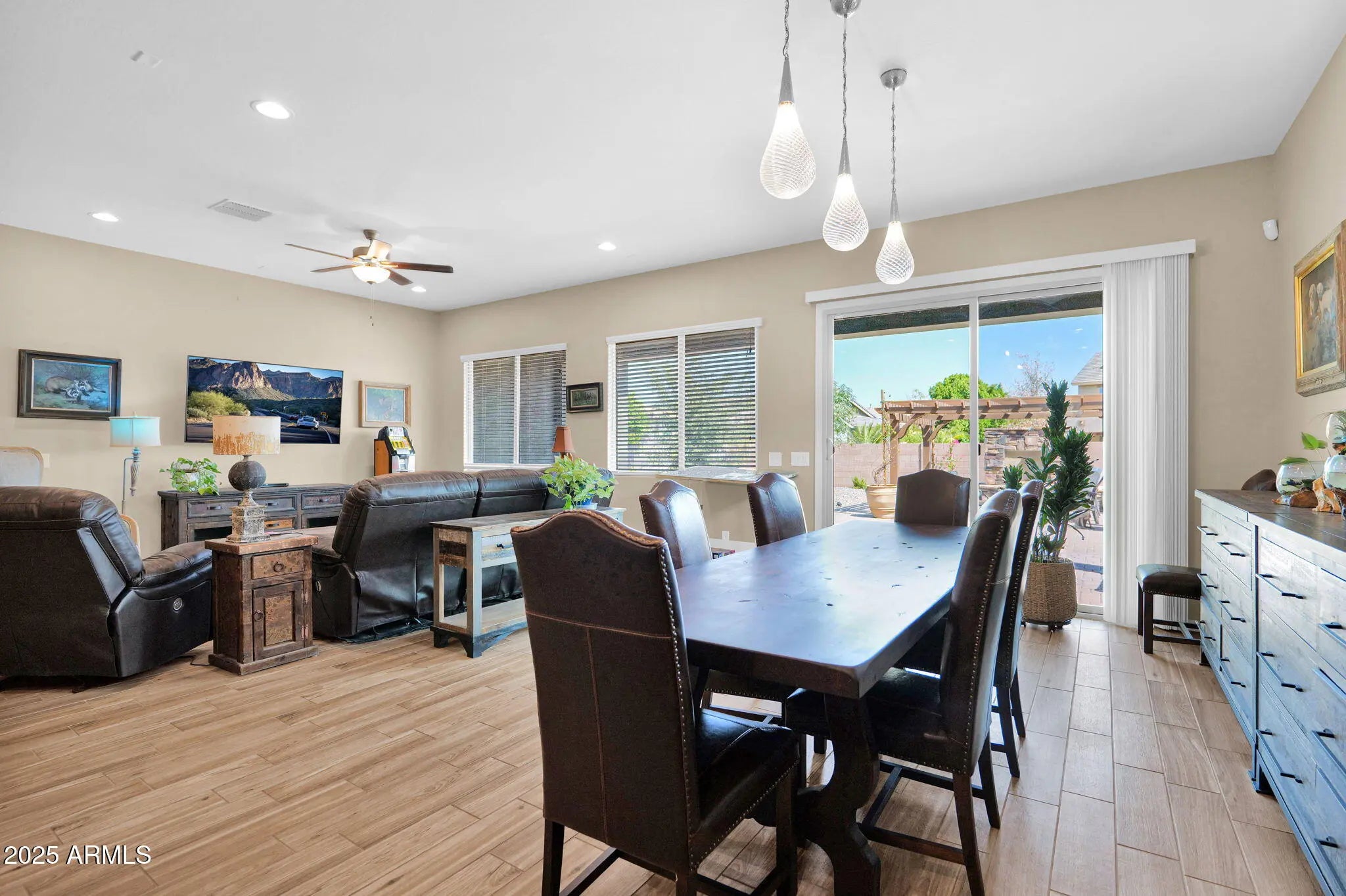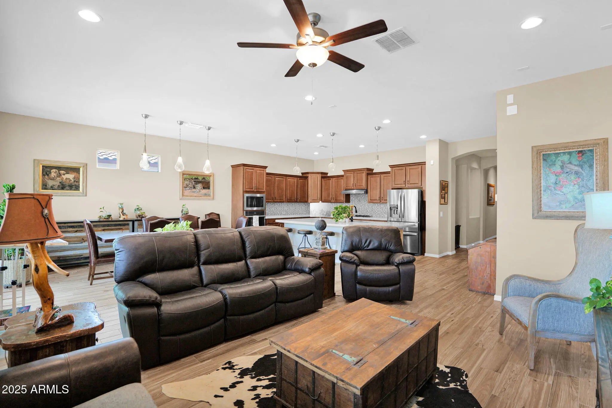 Welcome to this beautifully designed 4 bedroom,3 bath home with a flex room, offering 2,525 sq.ft. of single-level living in ideal condition. Located on an expansive lot with north-south exposure, this home combines style, space and functionality. Step inside to find 10 ft ceilings elegant wood-look tile floors and an open concept layout perfect for modern living. The gourmet kitchen features stainless steel appliances, a gas cooktop and large island that flows seamlessly into the great room- ideal for entertaining. The split floor plan includes a private primary suite & 3 additional bedrooms, plus a versatile flex room perfect for an office/gym/playroom. A professionally landscaped backyard with custom fireplace & plenty of room for outdoor dining or relaxing is absolutely beautiful. Additional highlights include : RV gate with extended parking behind the gate; paver driveway; Extra wide side yard on both sides of house. Immaculate move-in condition.