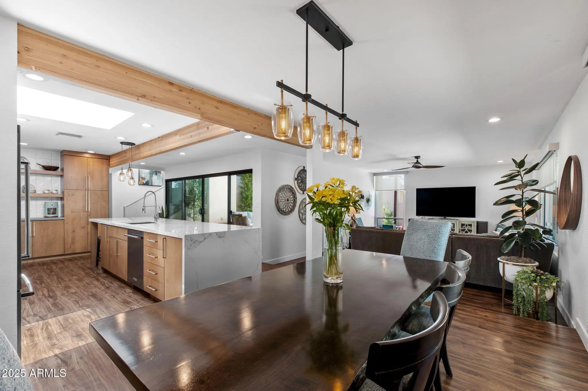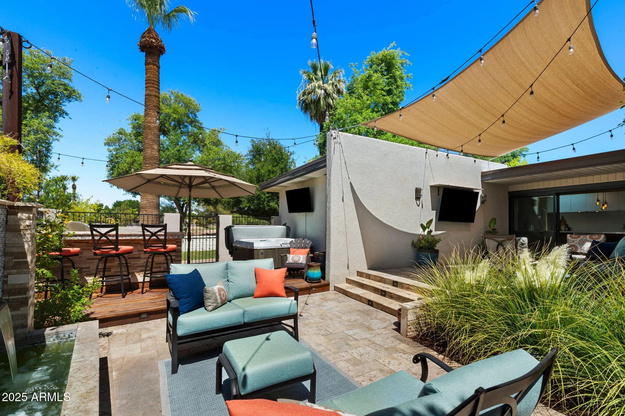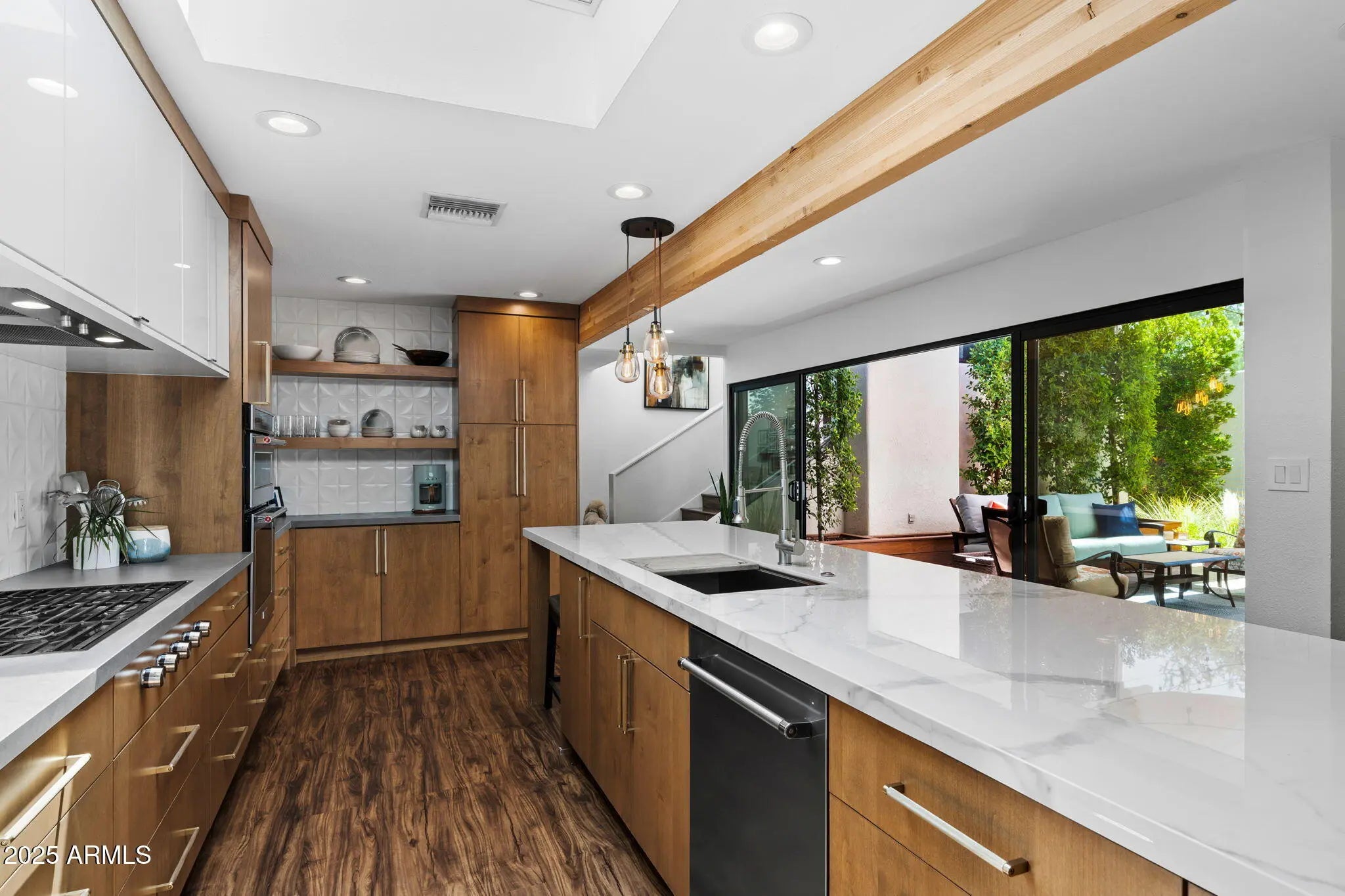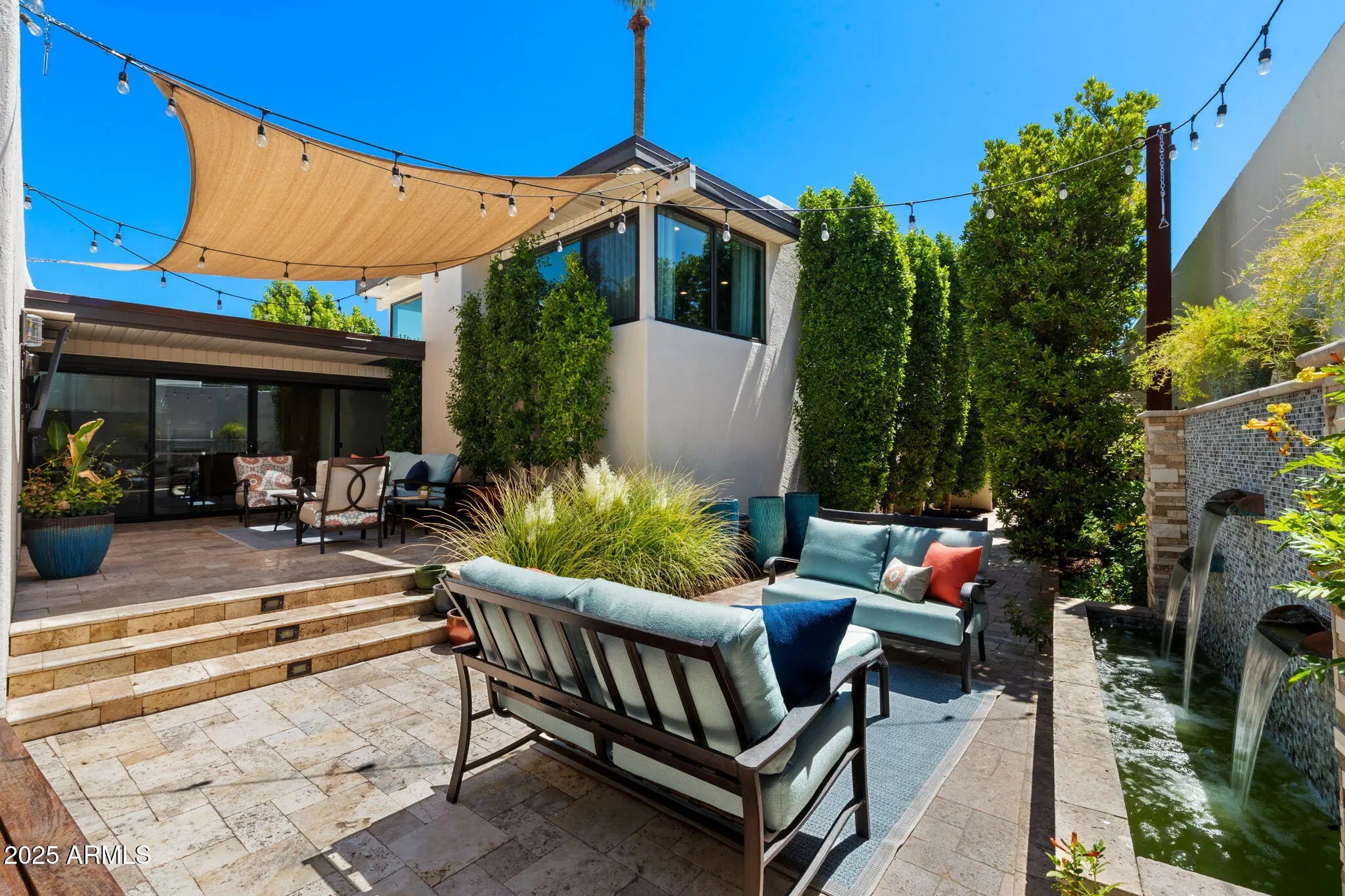 Welcome to an exceptional retreat nestled in the heart of Arcadia Green, one of the area's most coveted mid-century modern communities. This fully renovated residence blends architectural integrity with contemporary sophistication, offering an entertainer's dream and a chef's haven in one elegant package. Step inside to discover seamless indoor-outdoor living, where expansive sliders open to a lush courtyard featuring an outdoor fountain wall, a fully equipped natural gas BBQ, refrigerator and entertainment zone, and a spa for year-round relaxation, all framed by Italian travertine flooring and Brazilian hardwood decking. The chef's kitchen is a true centerpiece: flush gas Wolf cooktop, custom Alderwood cabinetry is continuous throughout the kitchen, dining, and bath, and show-stopping lighting details that elevate every culinary moment. Porcelain countertops, designer fixtures, and high-end KitchenAid appliances complete the space, while a sunroof-style skylight bathes the room in natural light. With the ability to comfortably seat 35 guests, this home was designed to host. Whether an intimate dinner or a grand celebration. Every inch has been thoughtfully curated, from custom light fixtures to the Delta Trinsic bath fixtures, back-lit mirrors and elegant planter boxes. The primary suite features double closets, while the secondary bedrooms offer walk-ins and balcony access. A large flex space makes a great home office or 4th bedroom. All windows have been replaced and include custom interior roller blinds. The new electrical panel and plumbing add peace of mind. The laundry room includes extra storage, and the 8'x8' garage storage room ensures space for everything. Additional highlights include: Energy-efficient cinder block construction Professionally decorated with custom Bassett furniture (available for purchase) Professionally installed Rain Dial drip irrigation system for pots, planter box and landscaping Located within a rare clover-shaped community of four cul-de-sacs with abundant lush green space, a beautiful pool, spa, and mid-century club house. Access to top-rated schools