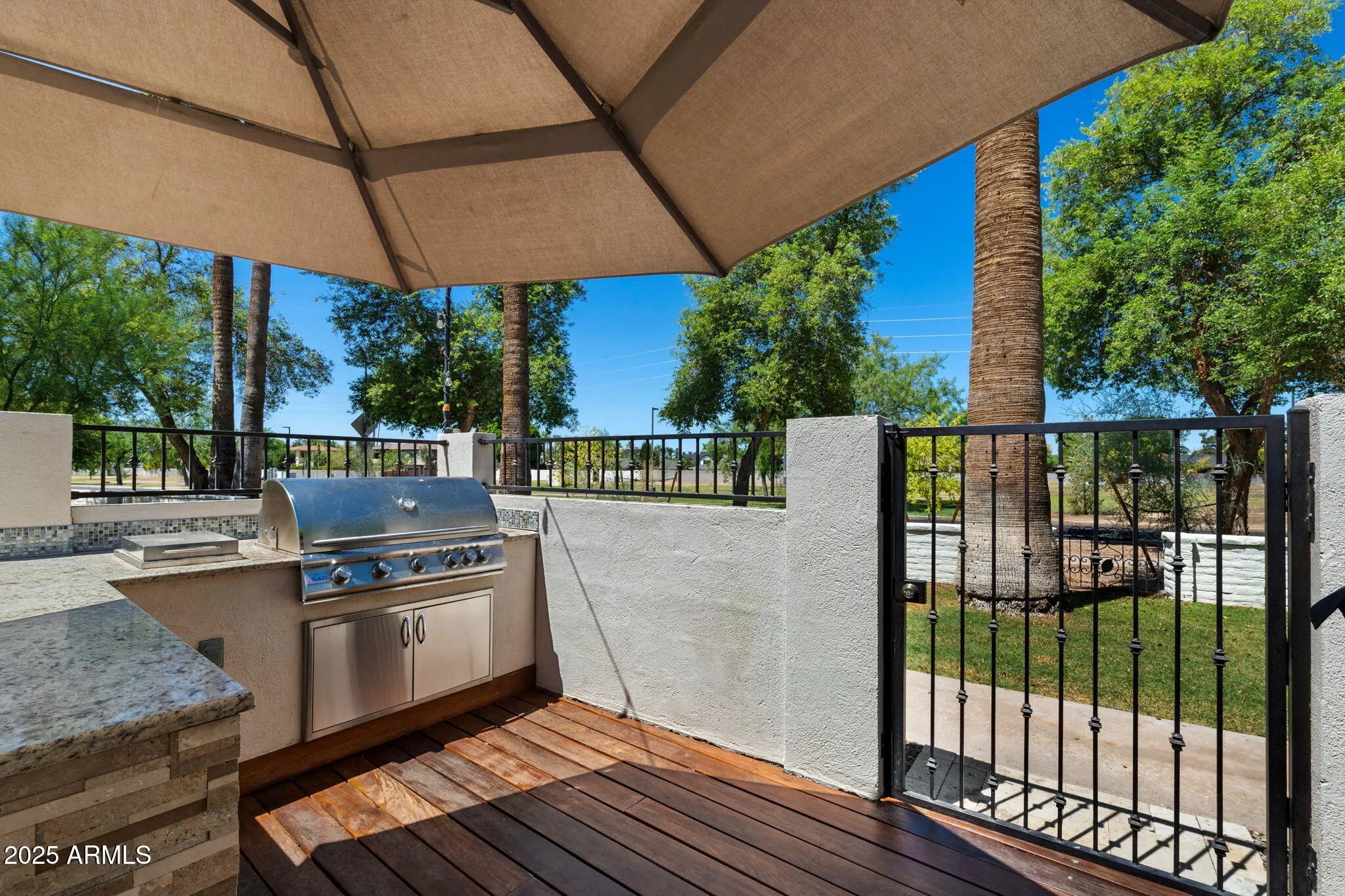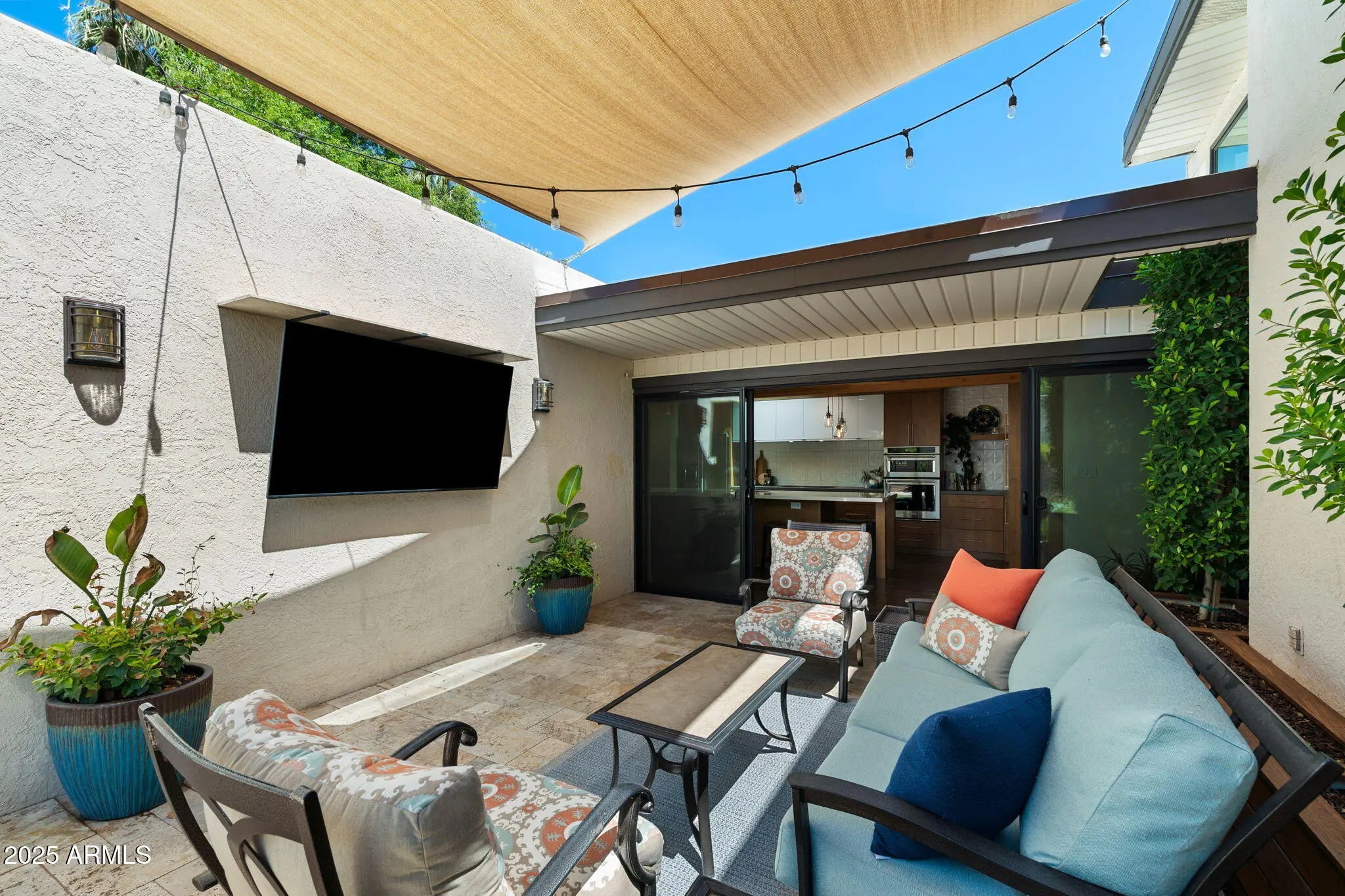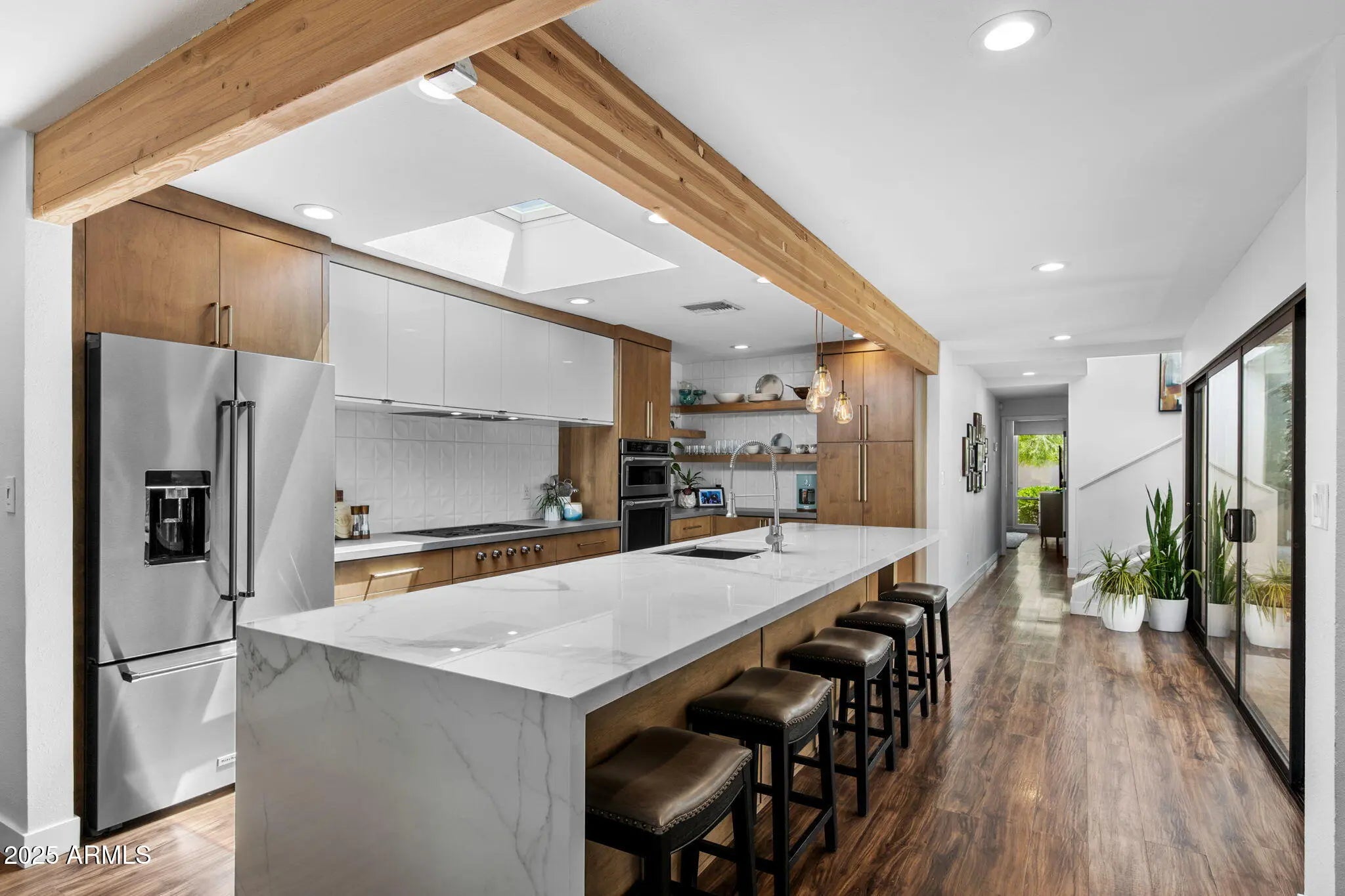 Welcome to an exceptional retreat nestled in the heart of Arcadia Green, one of the area's most coveted mid-century modern communities. This fully renovated residence blends architectural integrity with contemporary sophistication, offering an entertainer's dream and a chef's haven in one elegant package. Step inside to discover seamless indoor-outdoor living, where expansive sliders open to a lush courtyard featuring an outdoor fountain wall, a fully equipped natural gas BBQ, refrigerator and entertainment zone, and a spa for year-round relaxation, all framed by Italian travertine flooring and Brazilian hardwood decking. The chef's kitchen is a true centerpiece: flush gas Wolf cooktop, custom Alderwood cabinetry is continuous throughout the kitchen, dining, and bath, and show-stopping lighting details that elevate every culinary moment. Porcelain countertops, designer fixtures, and high-end KitchenAid appliances complete the space, while a sunroof-style skylight bathes the room in natural light. With the ability to comfortably seat 35 guests, this home was designed to host. Whether an intimate dinner or a grand celebration. Every inch has been thoughtfully curated, from custom light fixtures to the Delta Trinsic bath fixtures, back-lit mirrors and elegant planter boxes. The primary suite features double closets, while the secondary bedrooms offer walk-ins and balcony access. A large flex space makes a great home office or 4th bedroom. All windows have been replaced and include custom interior roller blinds. The new electrical panel and plumbing add peace of mind. The laundry room includes extra storage, and the 8'x8' garage storage room ensures space for everything. Additional highlights include: Energy-efficient cinder block construction Professionally decorated with custom Bassett furniture (available for purchase) Professionally installed Rain Dial drip irrigation system for pots, planter box and landscaping Located within a rare clover-shaped community of four cul-de-sacs with abundant lush green space, a beautiful pool, spa, and mid-century club house. Access to top-rated schools