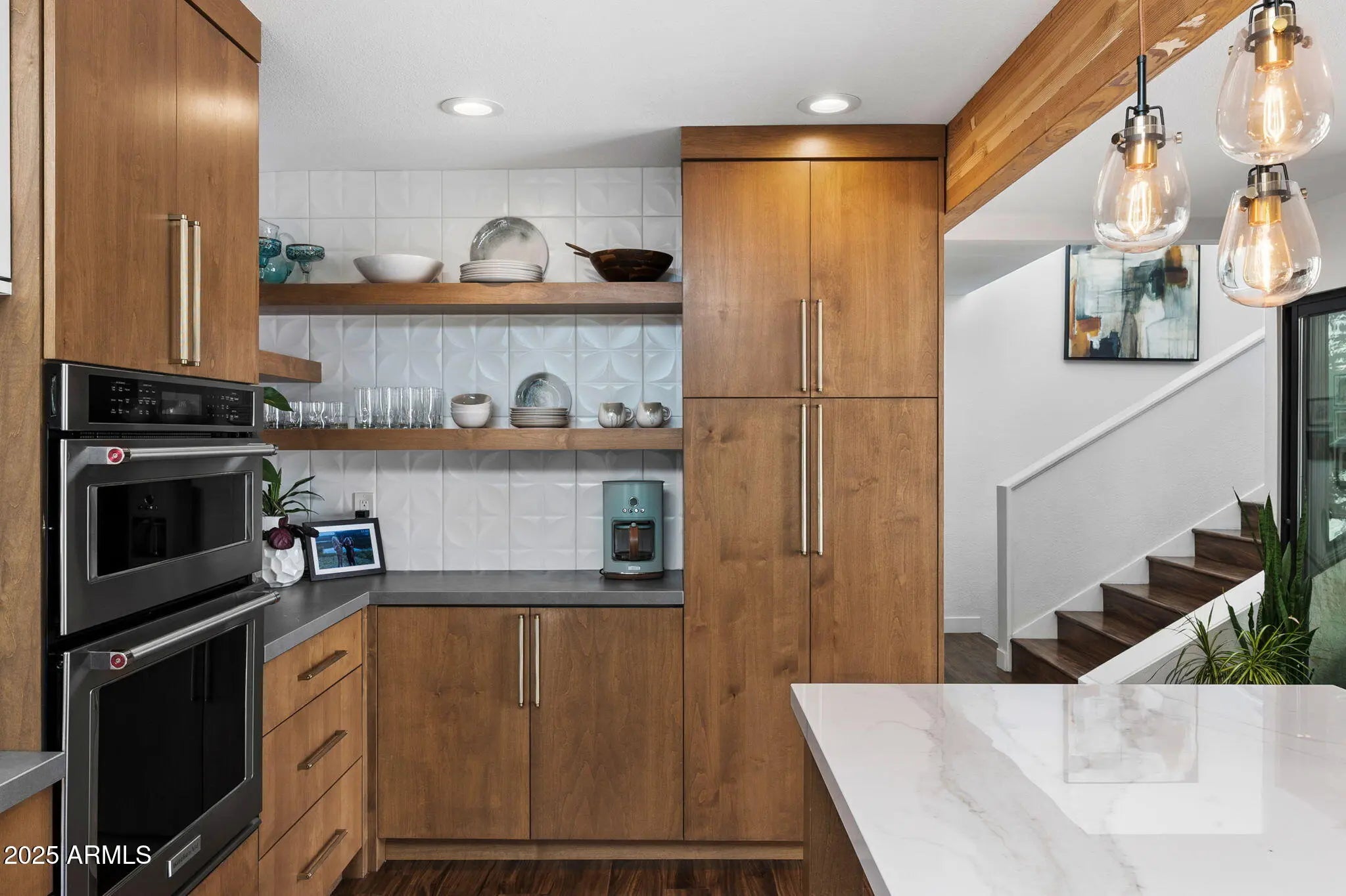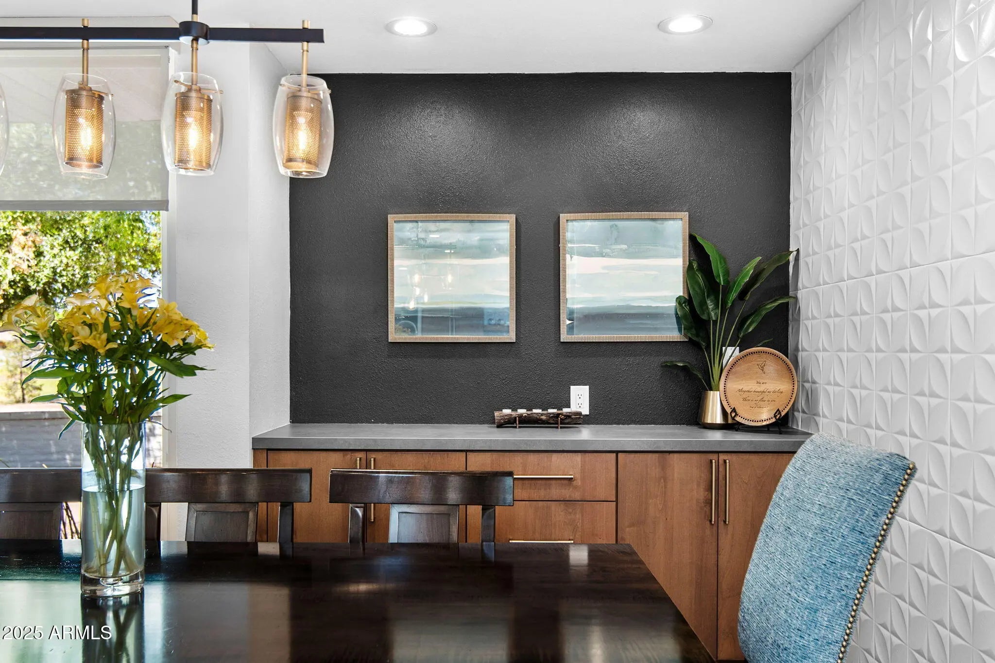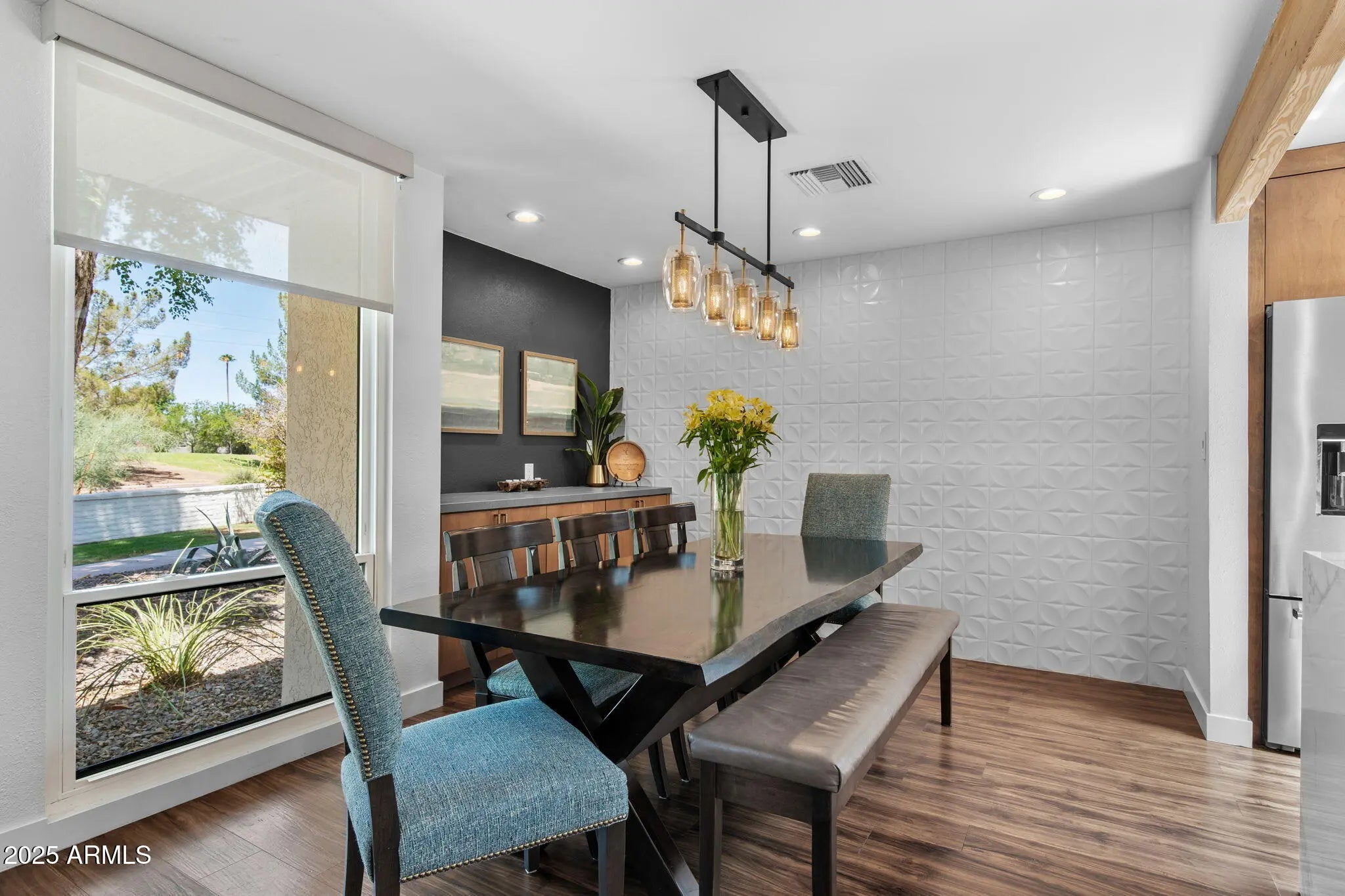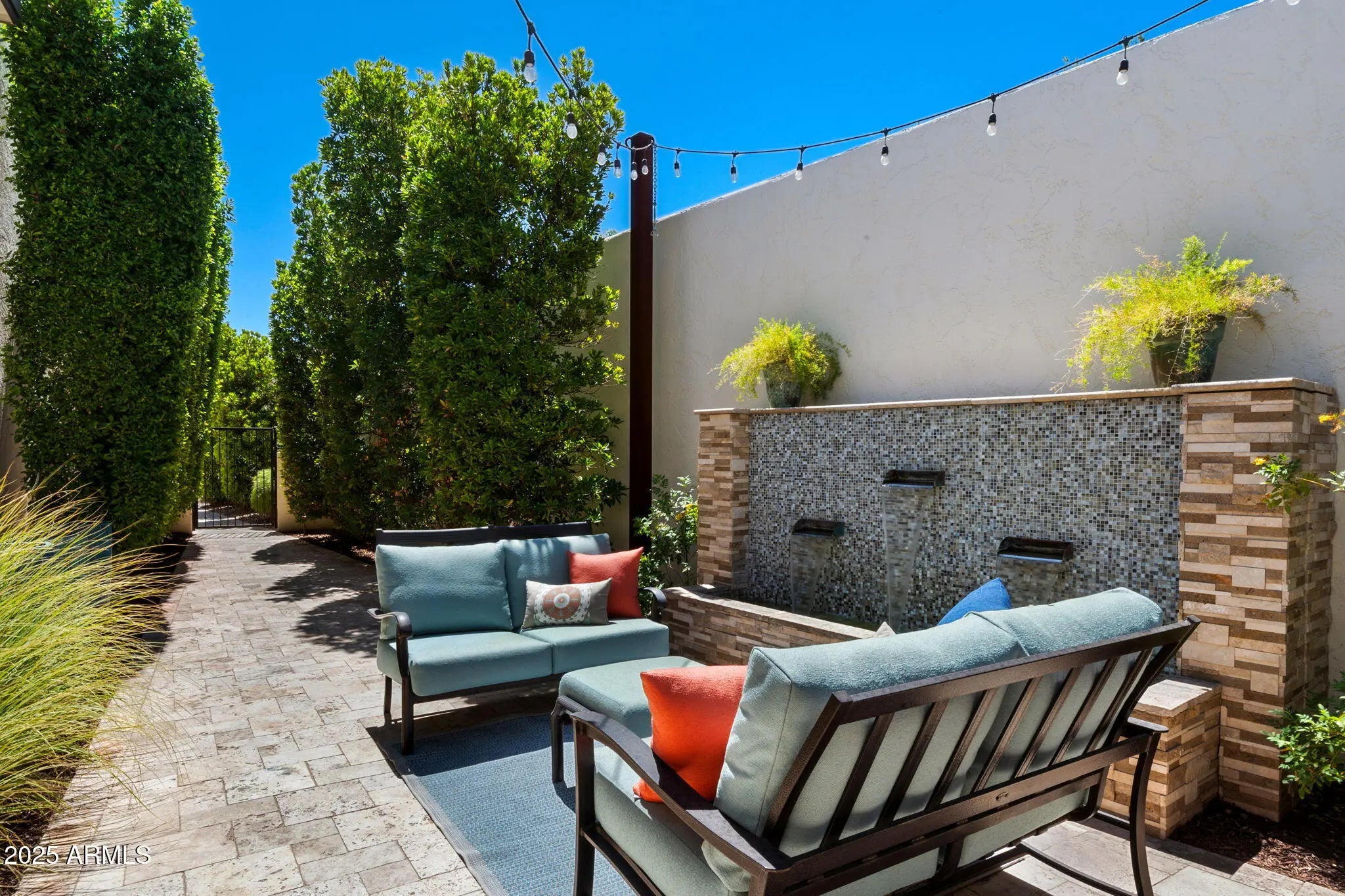 Welcome to an exceptional retreat nestled in the heart of Arcadia Green, one of the area's most coveted mid-century modern communities. This fully renovated residence blends architectural integrity with contemporary sophistication, offering an entertainer's dream and a chef's haven in one elegant package. Step inside to discover seamless indoor-outdoor living, where expansive sliders open to a lush courtyard featuring an outdoor fountain wall, a fully equipped natural gas BBQ, refrigerator and entertainment zone, and a spa for year-round relaxation, all framed by Italian travertine flooring and Brazilian hardwood decking. The chef's kitchen is a true centerpiece: flush gas Wolf cooktop, custom Alderwood cabinetry is continuous throughout the kitchen, dining, and bath, and show-stopping lighting details that elevate every culinary moment. Porcelain countertops, designer fixtures, and high-end KitchenAid appliances complete the space, while a sunroof-style skylight bathes the room in natural light. With the ability to comfortably seat 35 guests, this home was designed to host. Whether an intimate dinner or a grand celebration. Every inch has been thoughtfully curated, from custom light fixtures to the Delta Trinsic bath fixtures, back-lit mirrors and elegant planter boxes. The primary suite features double closets, while the secondary bedrooms offer walk-ins and balcony access. A large flex space makes a great home office or 4th bedroom. All windows have been replaced and include custom interior roller blinds. The new electrical panel and plumbing add peace of mind. The laundry room includes extra storage, and the 8'x8' garage storage room ensures space for everything. Additional highlights include: Energy-efficient cinder block construction Professionally decorated with custom Bassett furniture (available for purchase) Professionally installed Rain Dial drip irrigation system for pots, planter box and landscaping Located within a rare clover-shaped community of four cul-de-sacs with abundant lush green space, a beautiful pool, spa, and mid-century club house. Access to top-rated schools