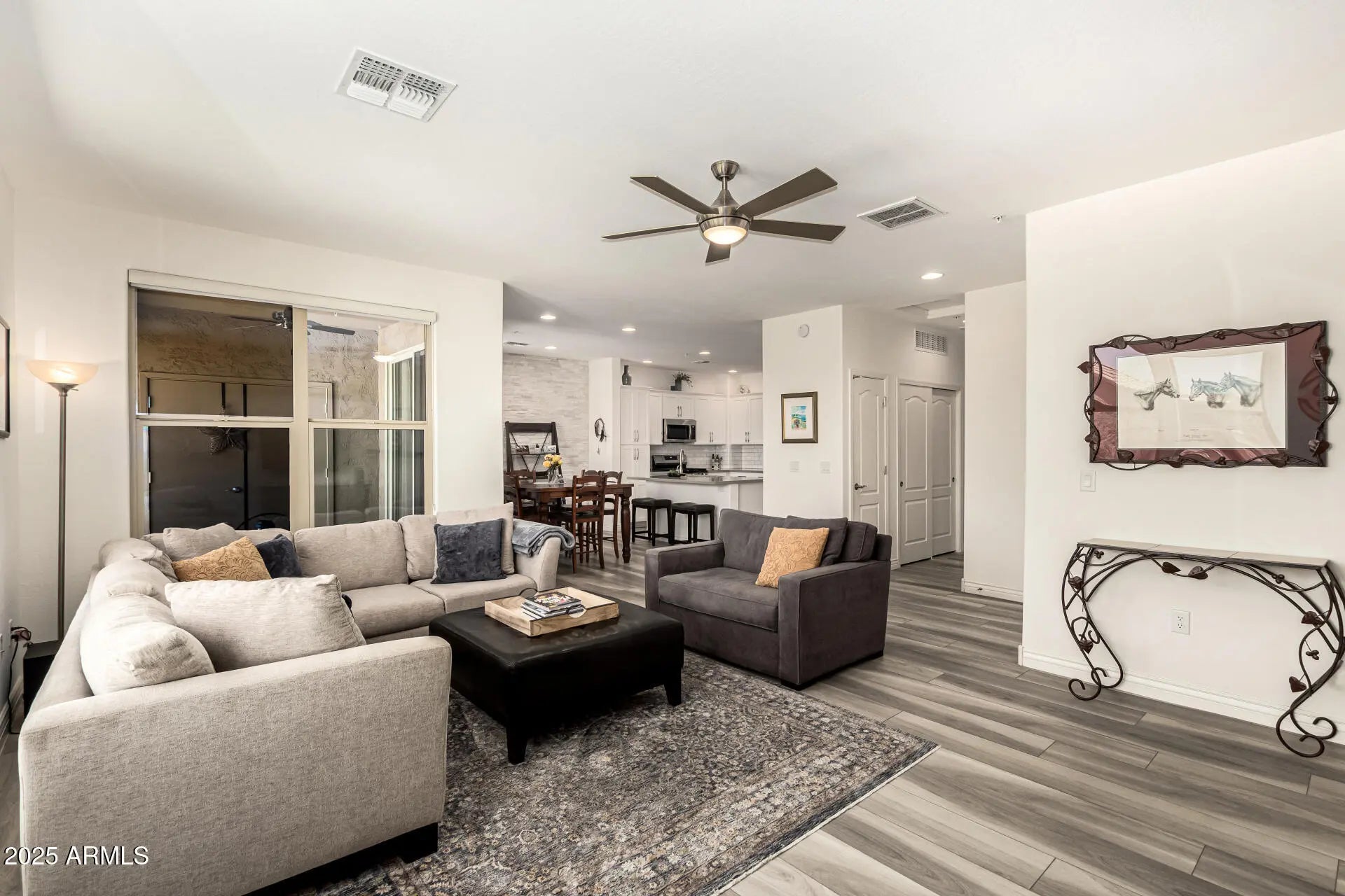Love the outdoors? Live minutes from mountain hiking and biking trails. This is it! Looks like new and is move in ready! This beautiful 2 bed, 2 bath condo features quartz kitchen counters, stainless appliances, a newer upgraded gas range, and stylish two-tone paint. The open concept layout offers a spacious great room with abundant natural light. Private patio with a ceiling fan and whole house water purification system. Enjoy north/south exposure in a gated community with pool, spa, gym, and built in BBQs, plus access to a master-planned community center with additional pool, tennis, pickleball, basketball, lawn bowling, cornhole, horseshoes, park and more! Located near TSMC, Gore, Norterra, Fry's Marketplace, dining plus easy freeway access and nearby hiking/biking trails.