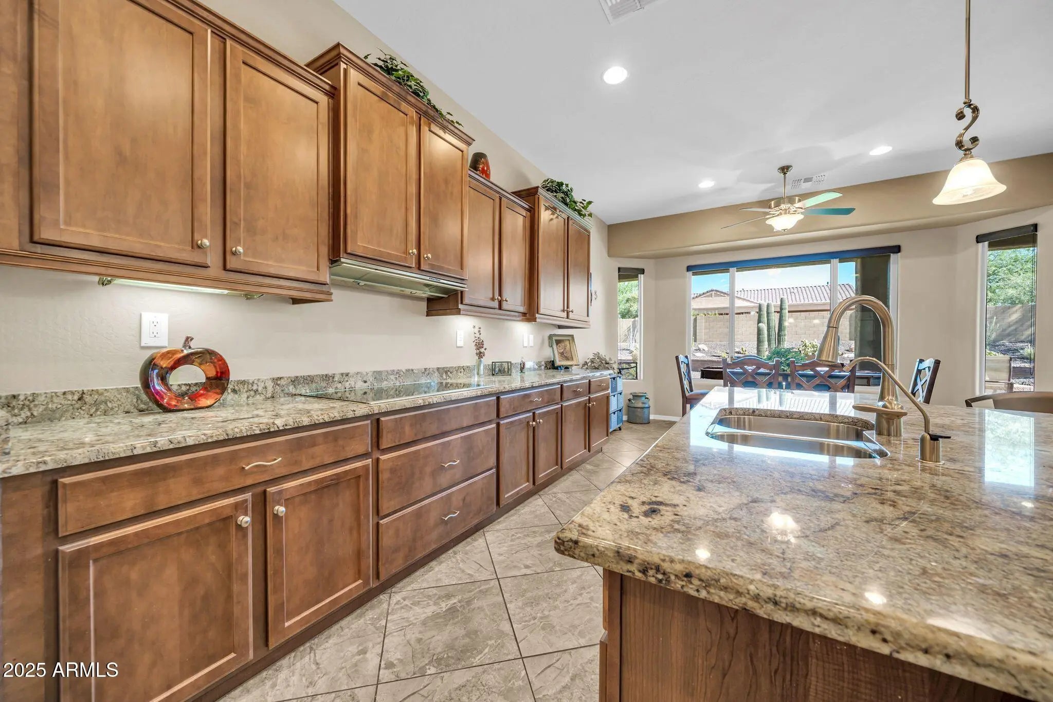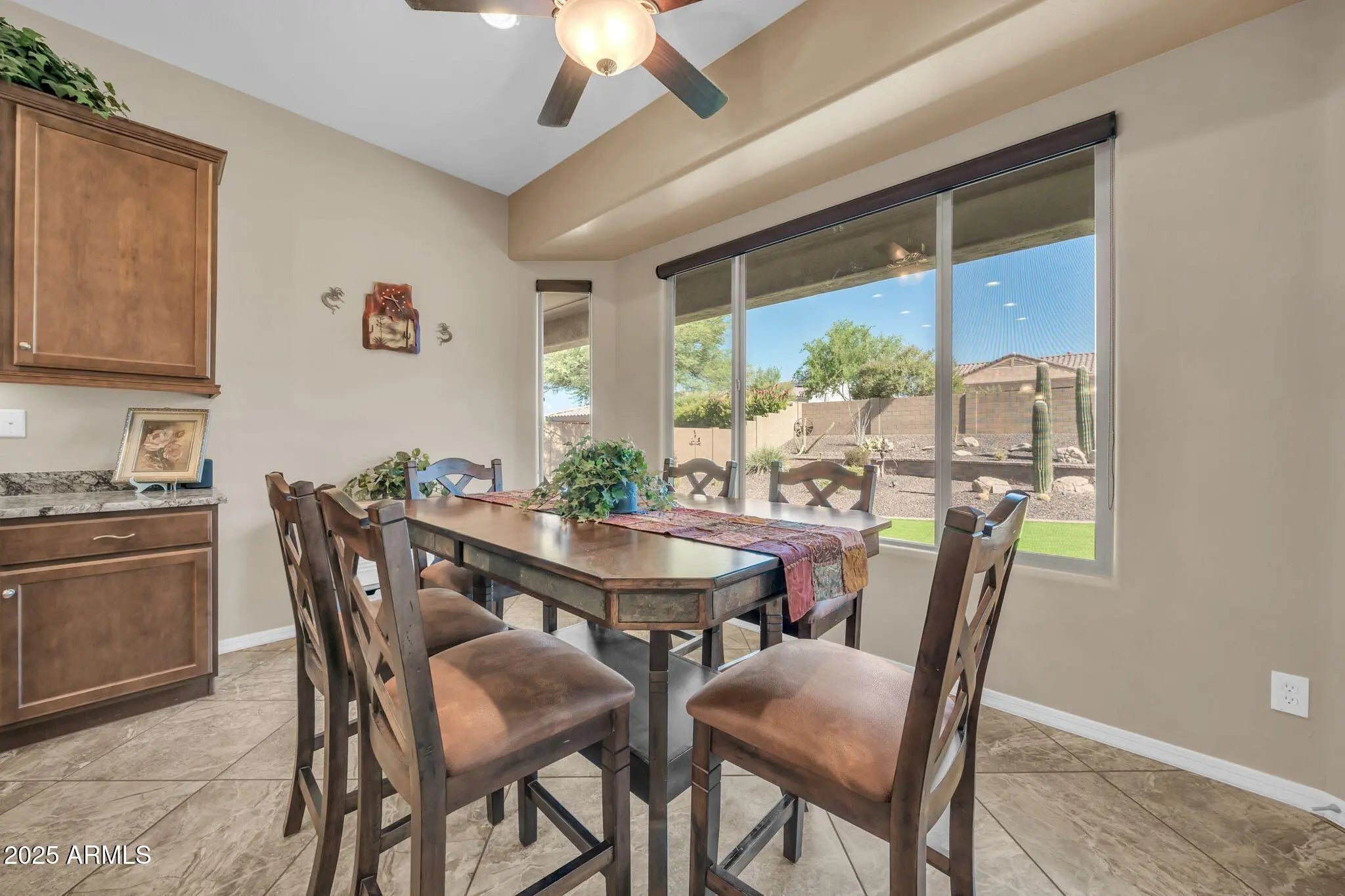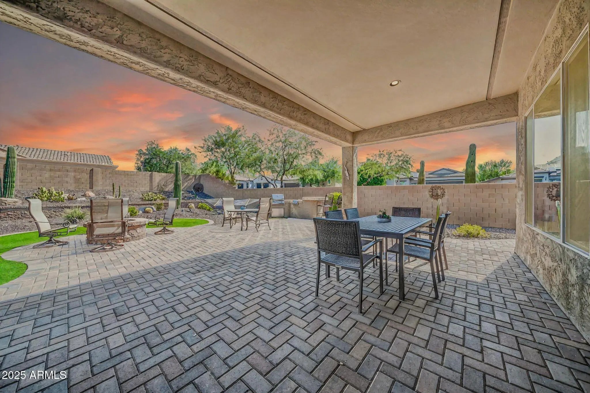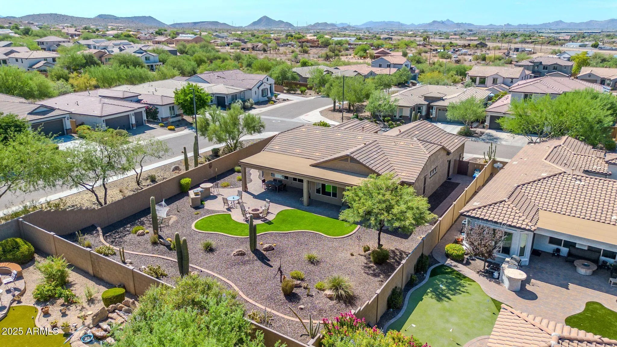 Welcome to this stunning single-level home nestled on an oversized corner lot, surrounded by all of breathtaking desert landscape that Arizona has to offer. From the moment you arrive, you'll appreciate the award-worthy curb appeal and exceptional pride of ownership throughout. This open concept home features soaring high ceilings and abundant natural lighting throughout which creates a luxury, yet inviting ambiance that truly sets this home apart. The spacious split floor plan includes 3 bedrooms plus a versatile office space, ideal for remote work, hobbies, or a guest room. The oversized primary bedroom offers spectacular views of the backyard with an additional seating area to retreat. It offers an en suite bath equipped with dual sinks, a large walk-in shower, and private water closet. Even the most discerning buyer will appreciate the enormous walk-in closet with built-in storage. The heart of the home is the entertainer's kitchen, boasting extended cabinets, ample counter space, a large island with seating, and built-in appliances perfect for culinary enthusiasts. The adjacent dining room showcases a picture-perfect view of the backyard through the upgraded, panoramic bay windows. Enjoy peace of mind with a brand new HVAC system (2025) and upgraded insulation for enhanced energy efficiency year-round! Featured in the backyard, you'll find an impressive selection of Arizona's most coveted desert landscaping. Other notable updates include the artificial grass, a paver pathway throughout, built-in BBQ grill & cooktop, built-in fire pit, and an expansive covered patio that extends across the entire length of the home! The impressive 3 car garage includes a 4 ft extension, seemingly unlimited storage, epoxy flooring, and access directly to the backyard. This one-of-a-kind property offers the ideal blend of luxury, comfort, and practicality, all within the desirable Fireside at Norterra neighborhood. Be sure to visit the community center to be blown away by the state of the art amenities!