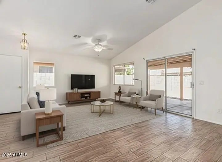 Come see this charming 3-bedroom home in the sought-after Wildflower Ranch! Nestled in a quiet cul-de-sac with an inviting curb appeal, featuring a manicured landscape and a 2-car garage! Discover the spacious interior, showcasing wood-look tile flooring, soaring vaulted ceilings, arched passageways, abundant natural light, and neutral paint. The well-appointed kitchen boasts track lights, spacious cabinetry, ample counter space, and a gas range. All 3 bedrooms feature carpet flooring for added comfort. The primary retreat has two walk-in closets and a full ensuite with double sinks. Enjoy your morning coffee under the covered patio and add your personal touch to the low-maintenance backyard to create your perfect oasis! Don't miss out on this move-in ready home!