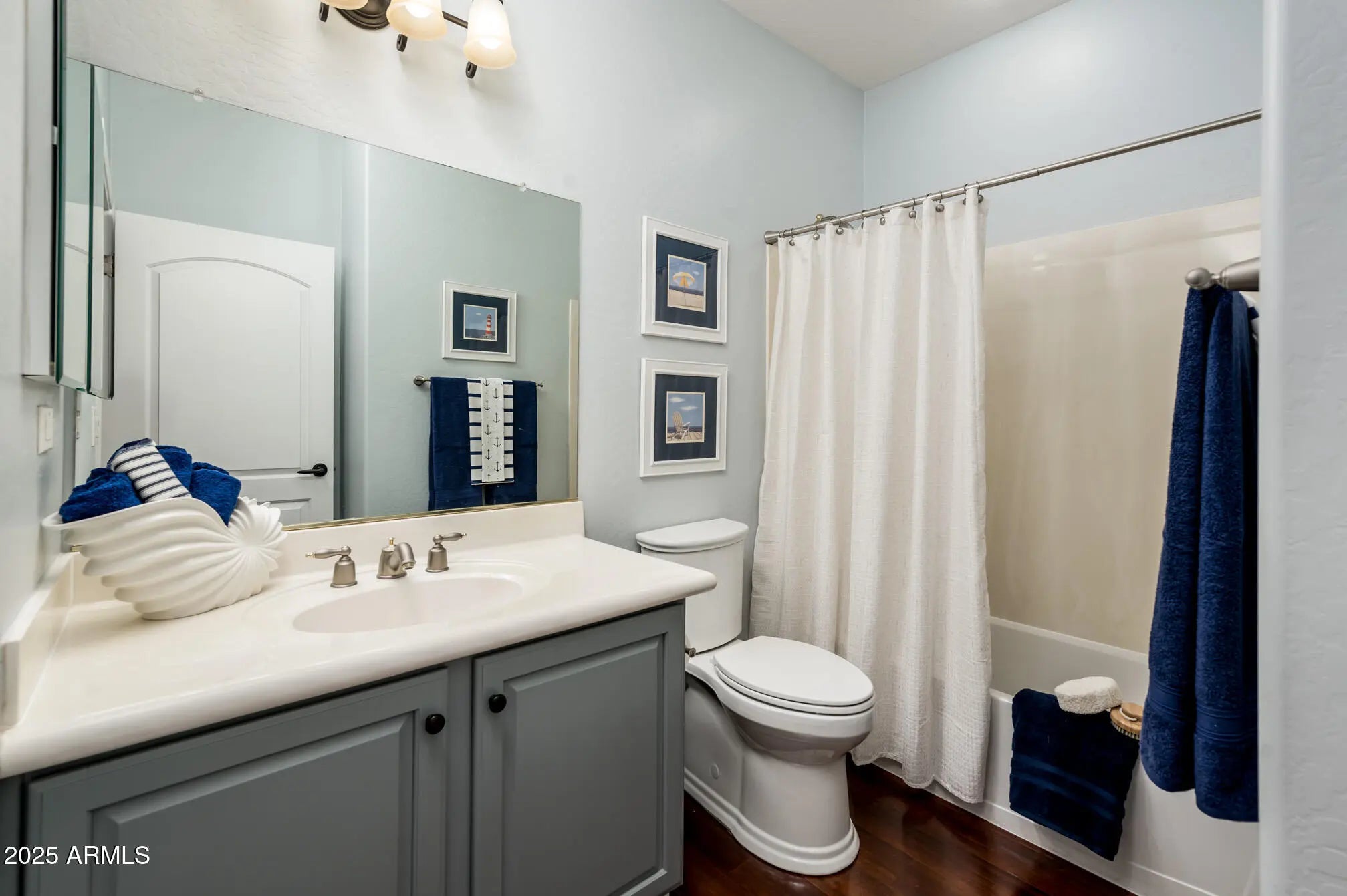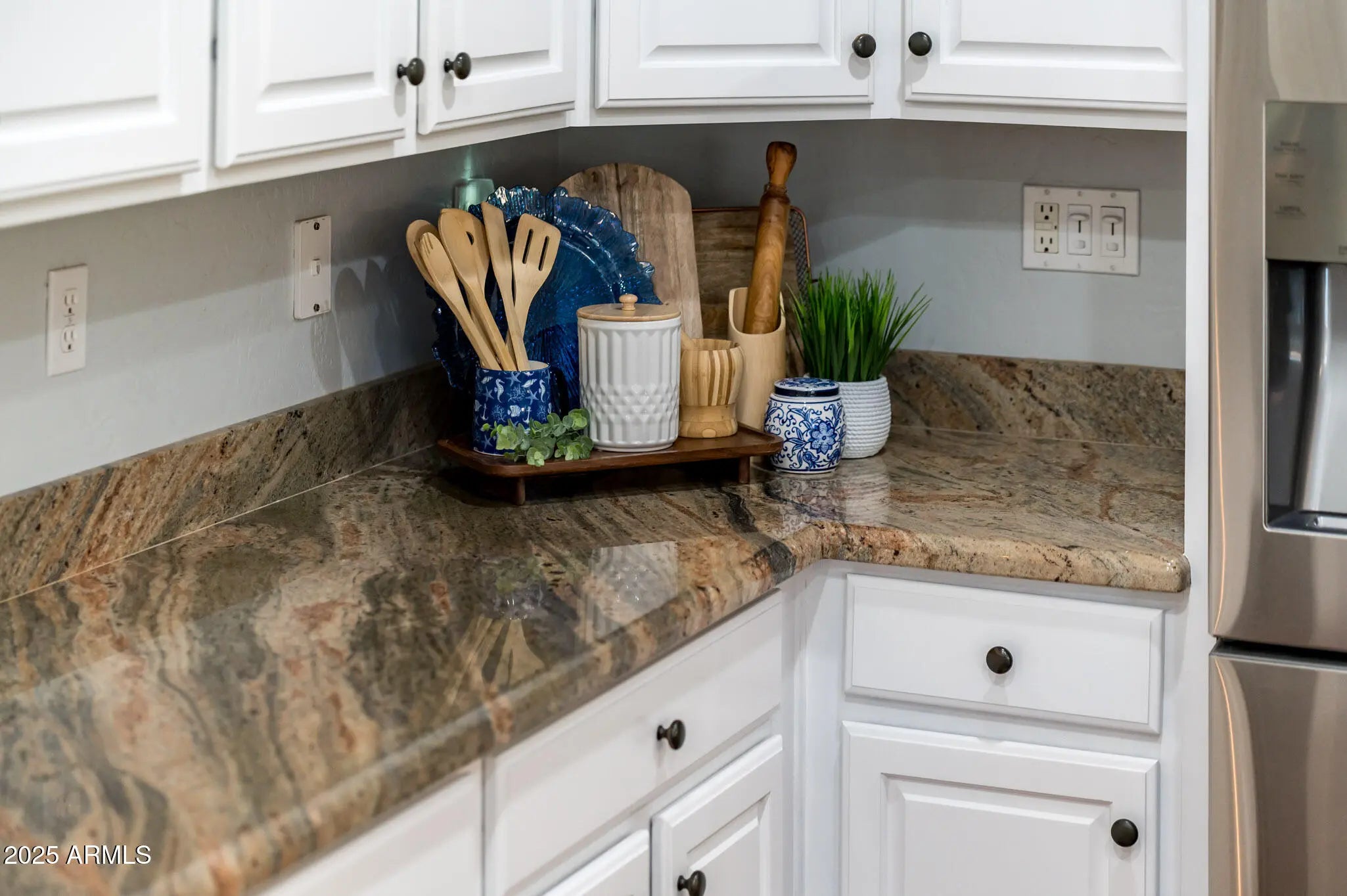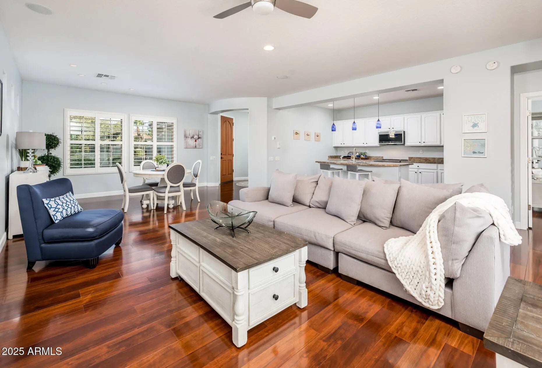 Quietly tucked within Corte Bella's most desirable interior section, far from the hum of Loop 303 and El Mirage Road, this updated San Marco model re-emerges after being missed during the busy snowbird season. Offering a fresh canvas of high-end upgrades and timeless design, this home deserves a second look from discerning buyers seeking style, space, and community charm. From the moment you enter, you're greeted by newly installed luxury wide-plank laminate flooring that spans the entire home, grounded by crisp, modern baseboards. The flooring provides both warmth and durability, perfectly complementing the freshly repainted walls finished in a designer-neutral palette. Tasteful white plantation shutters throughout ensure both light control and cohesive elegance. The kitchen was updated in 2024, showcasing a suite of stainless steel appliances including a premium induction cooktop, sleek microwave, refrigerator and whisper-quiet dishwasher. Granite countertops provide ample workspace and visual richness, while refinished white cabinetry and upgraded fixtures complete the magazine-worthy aesthetic. Designed as a personal haven, the primary bedroom offers generous dimensions with room for a cozy sitting area or productivity nook. Its ensuite bath includes double vanities, refinished cabinetry, a walk-in shower, and a separate toilet room, all thoughtfully appointed for comfort and functionality. This model is favored for its larger-than-average guest bedroom and a versatile den space, perfect for a home office, hobby area, or additional sleeping quarters. Closets and cabinetry throughout provide abundant storage for seasonal items, golf gear, or hosting supplies. One of the standout features is the 2.5-car garage offering additional square footage for a golf cart, workshop zone, or extra storage without compromising vehicle space. In addition to its aesthetic upgrades, the home has been carefully maintained, including: Roof check completed 2025, New hot water heater installed in 2021, Water softener replaced in 2024, Irrigation system upgraded to PVC in 2021,HVAC system and furnace are regularly serviced and in excellent condition. Well-appointed. Well-maintained. Well worth a second look. This San Marco gem offers refined living with every convenience already in place.