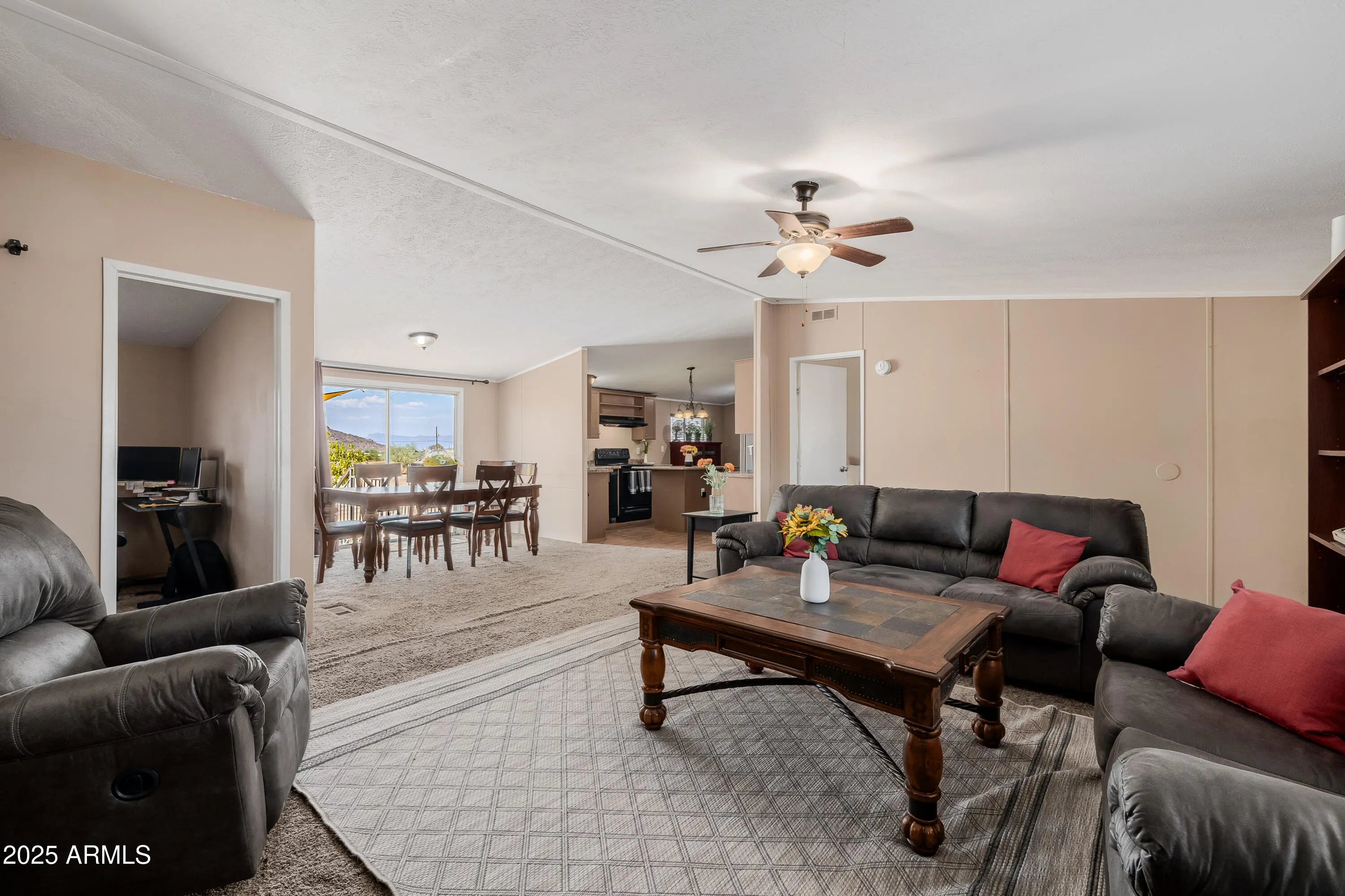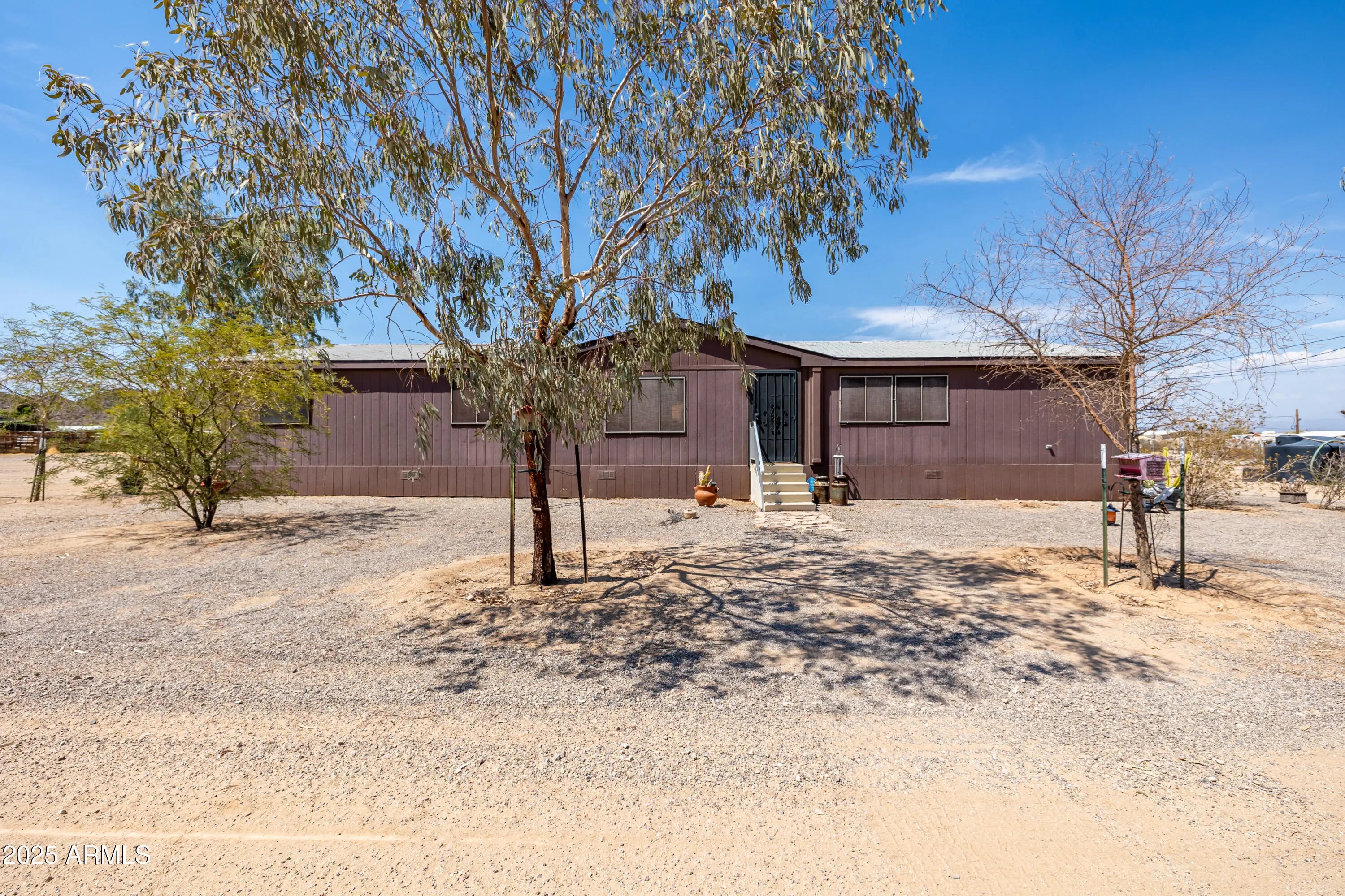 Welcome to your own slice of desert paradise! This beautiful Champion home sits proudly on 2.3 acres of wide-open space with horse privileges, so go ahead—bring your four-legged friends! With 4 spacious bedrooms, a bonus room, and 2 baths, there's plenty of room for everyone to stretch out and enjoy the good life. Step inside and enjoy a light, airy floor plan, walk-in closets in every bedroom, and convenient inside laundry (because who wants to trek outside with laundry baskets?). This home is permanently affixed and ready to move in—no fuss, just freedom. Surrounded by the stunning San Tan Mountains, you'll enjoy breathtaking views and can walk to the State Park for hiking, horseback riding, or just soaking in the Arizona sunsets. You're only minutes from shopping and and surrounded by beautiful custom homes, so you get that peaceful rural vibe without giving up modern convenience. The property is fenced and animal-ready, so whether it's ponies, goats, or backyard chickens, this place is calling your name.