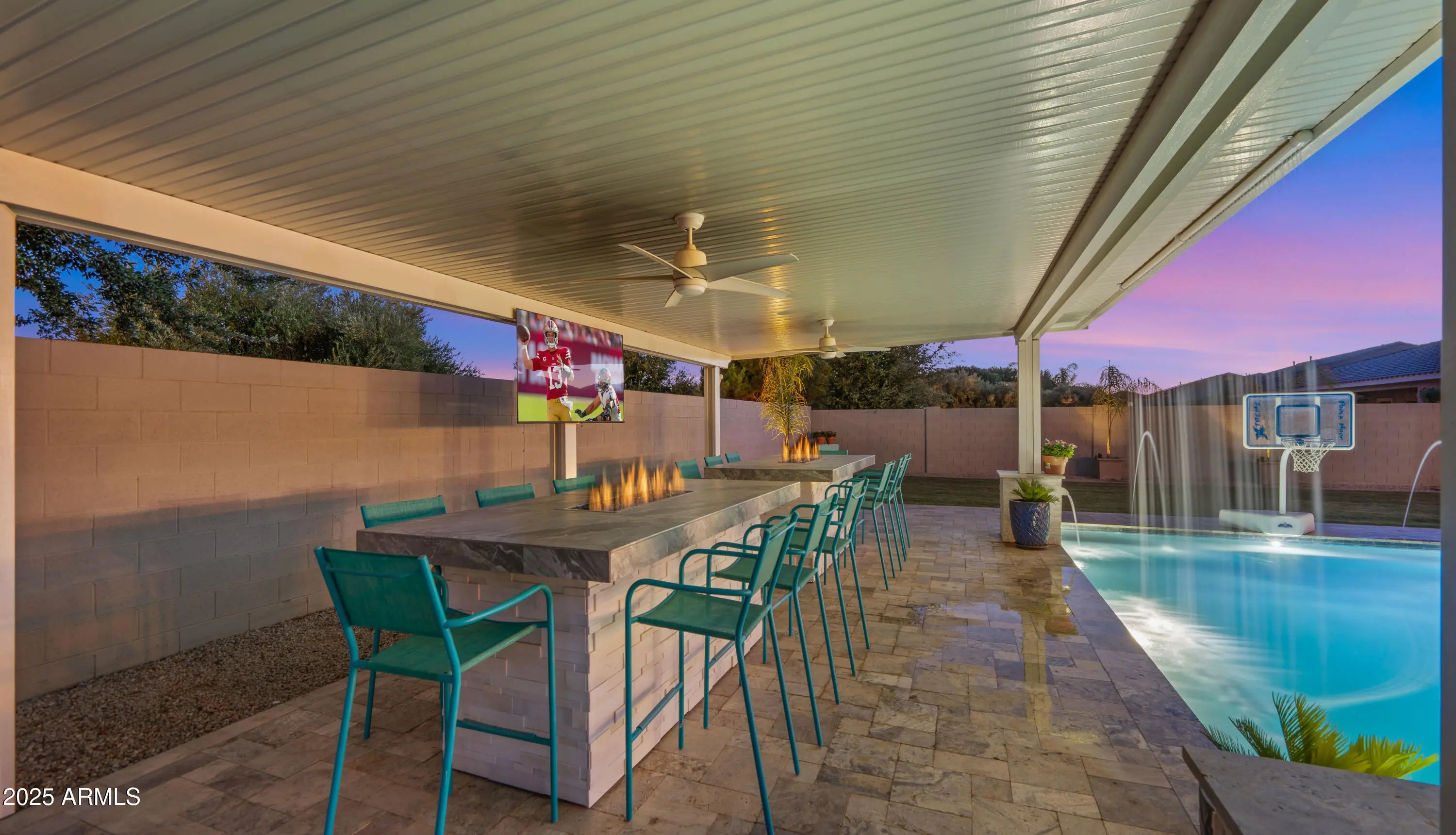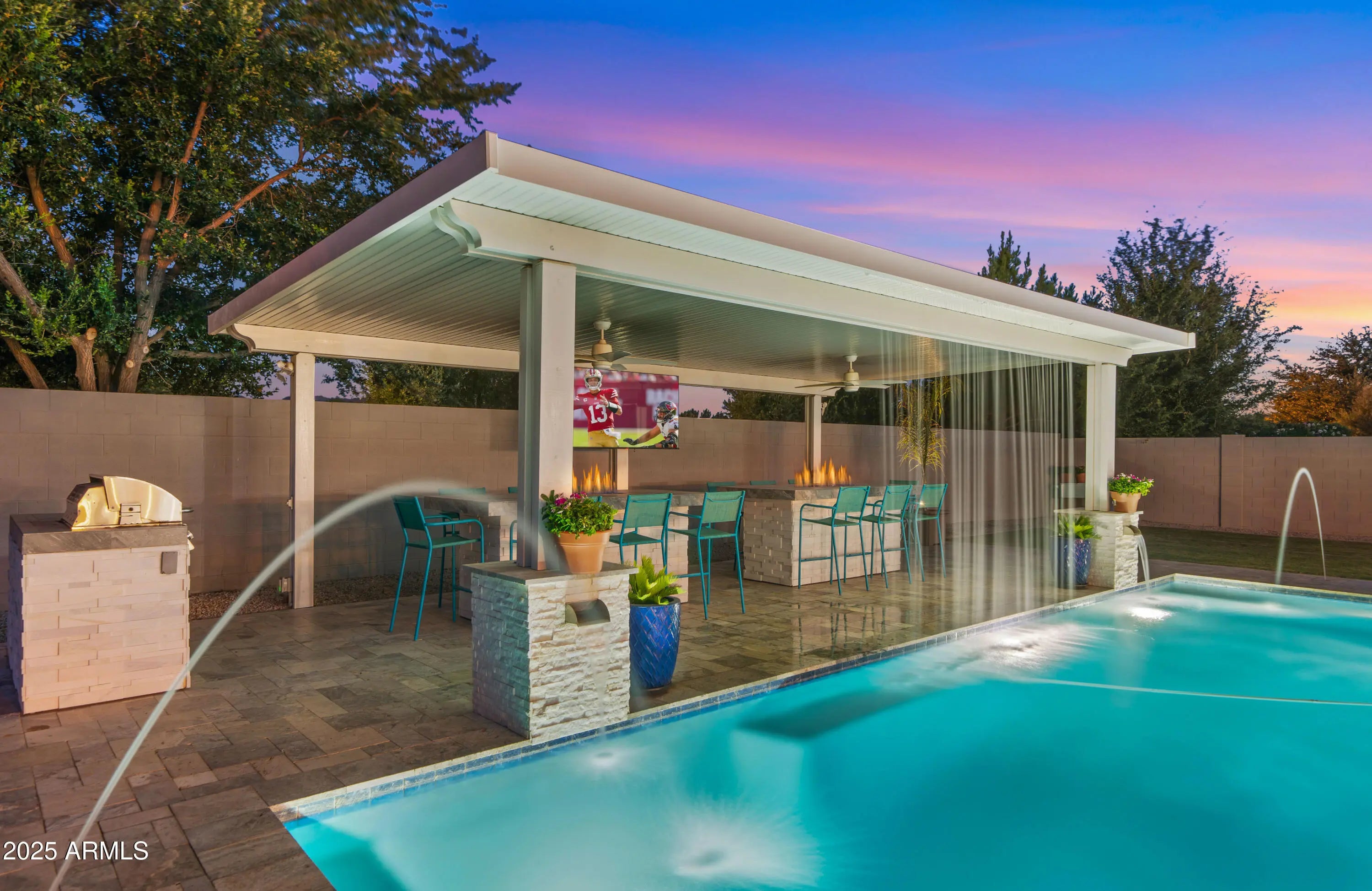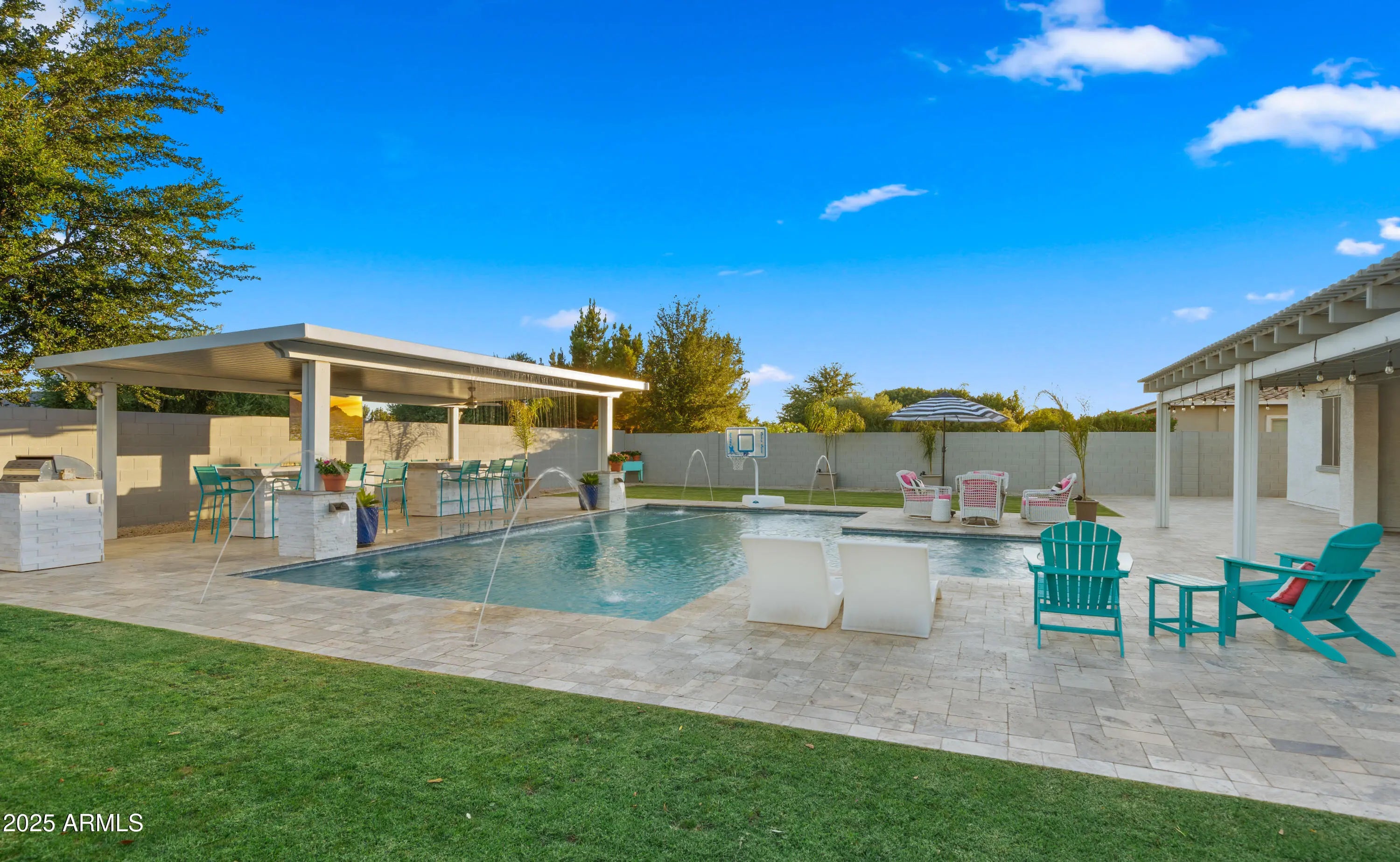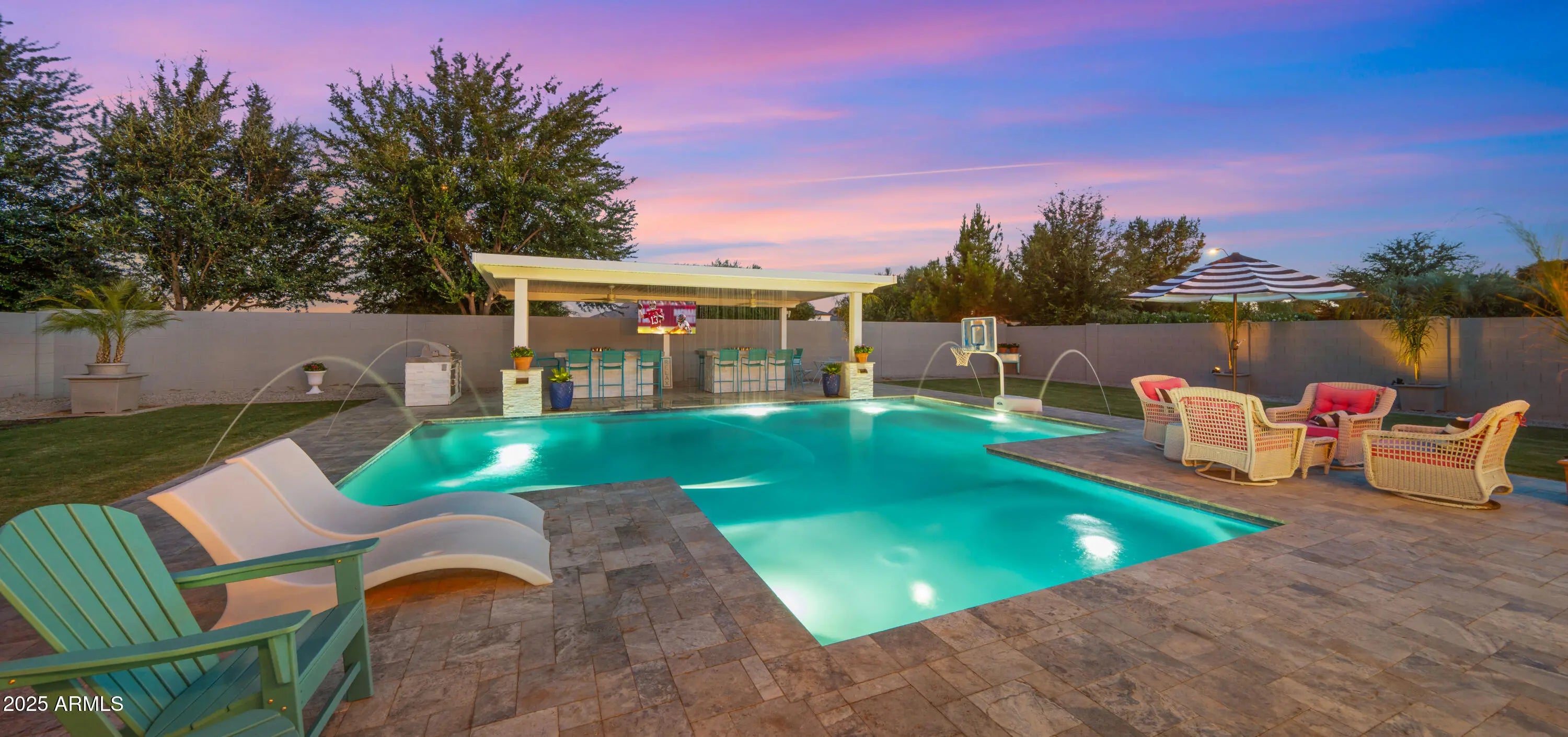It's HERE!!! Come home to your very own luxury estate in the highly sought after community of Hastings Farm, walking distance to thousands of sf of new retail, restaurants and entertainment! Available fully furnished, this single-level residence offers 3,626 sq ft of thoughtfully designed, open-concept interior living on a spacious 14,352 sq ft lot. Step outside to your brand new $300,000 backyard escape with a stunning new resort-style pool, multiple water features, an enormous poolside outdoor living room with BBQ, TV, and 2 enormous fire tables. An oversized covered patio space with dining, multiple TVs and extended roofline reaching the sparkling blue pool waters. This backyard belongs on the cover of a luxury magazine! Inside, you'll find a bright, modern layout featuring newly installed, modern flooring, granite countertops, a chef's kitchen with oversized island, walk-in pantry, built-in sports bar, and premium stainless-steel appliances perfect for hosting or enjoying everyday comforts. With 4 large bedrooms + a versatile flex room, 3 full bathrooms, and a 3-car garage, this home has room to live, work, and entertain in style. Tucked away in a quiet cul-de-sac with breathtaking mountain views, a fully fenced yard, and just minutes from top-rated schools, brand-new shopping, dining, and entertainment. Offered fully furnished, this turn-key home blends high-end finishes, recent interior and exterior upgrades, and unbeatable value. All that's missing is YOU!