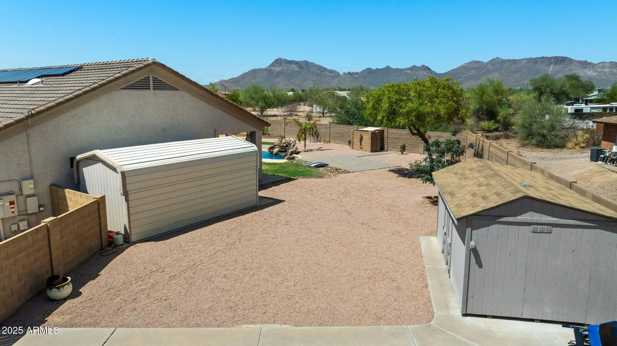 Beautiful 3 Bedroom PLUS Bonus Room Home with 2x6 construction, 3-Car Garage, RV Parking and almost a half an acre lot with Amazing views of Superstition Mountain. Prepare to be impressed by an Open and Spacious interior offering plenty of natural light, high ceilings, arched doorways, neutral tile floor & soft carpet in all the right places. The fabulous kitchen boasts wood cabinetry, SS appliances, large pantry, recessed lighting, & Island with breakfast bar. Primary bedroom includes an ensuite with dual sinks, walk-in closet & private access to the back patio. The oversized backyard with Large covered patio and Incredible Pool makes this truly an oasis designed for the ultimate in relaxation & entertainment! Side yard w/artificial turf-great for a large dog run! TWO Storage Sheds!