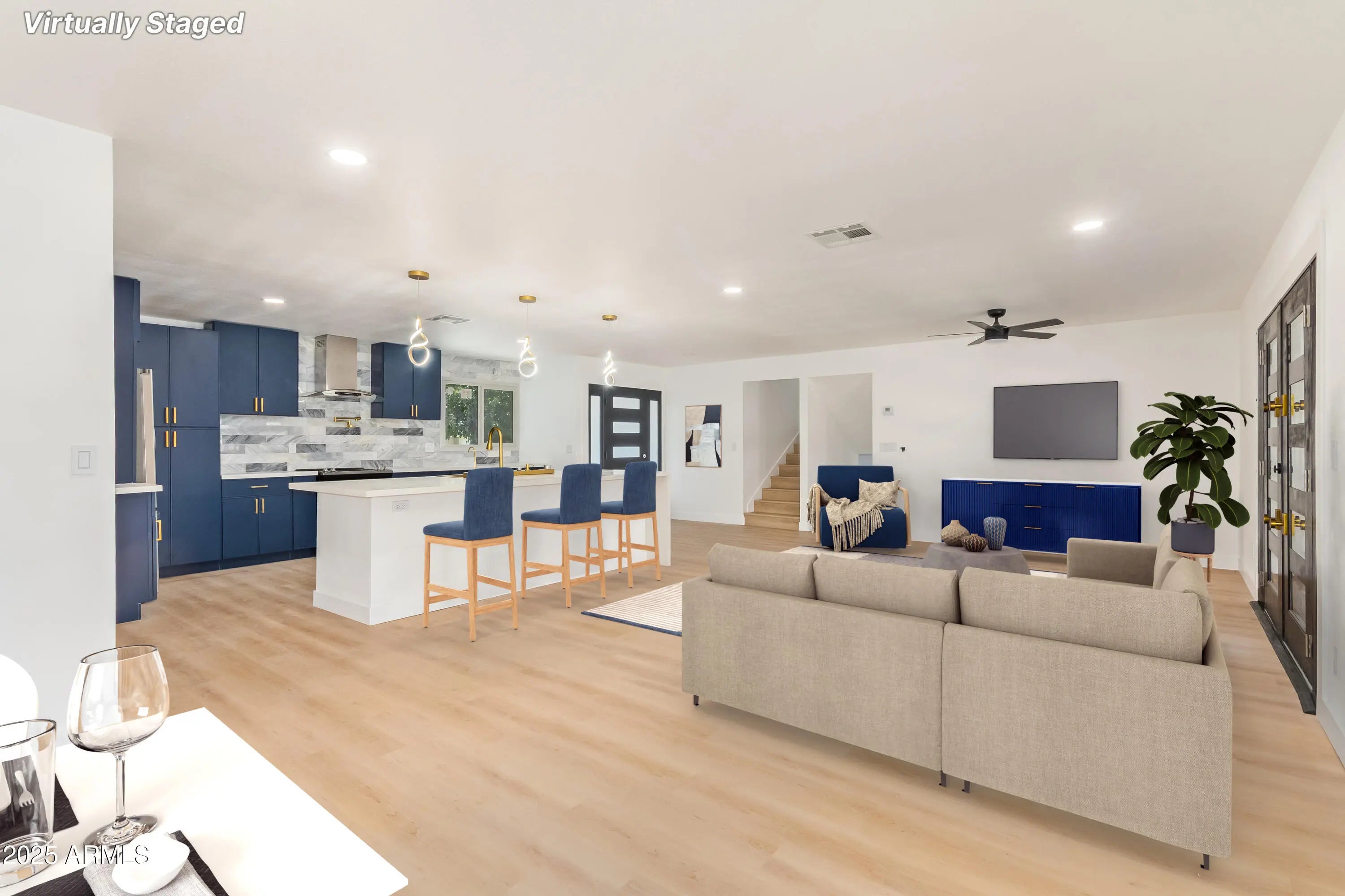 You'll love this BEAUTIFULLY REMODELED home with a SPARKLING POOL, located just minutes from Grand Canyon University and close to schools, shopping, dining, and freeway access! This stunning home blends modern upgrades with everyday comfort. Inside, enjoy fresh neutral tones, new ceiling fans, wood-look flooring, and abundant natural light. The spacious layout includes a versatile downstairs game/media room—ideal for entertaining or relaxing. The kitchen features stainless steel appliances, wine cooler, quartz counters, marble backsplash, blue cabinetry, and a waterfall island. The private main bedroom is downstairs with a walk-in closet and barn door. Enjoy a spacious, backyard with a covered patio, hot tub, and sparkling pool. Move-in ready!