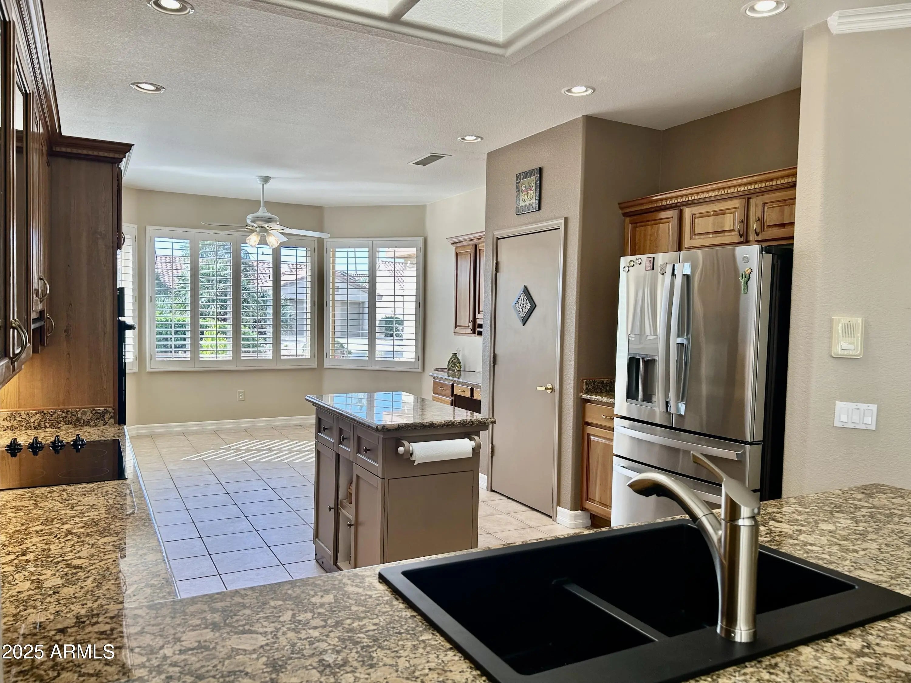 Mountain views from your flagstone front courtyard and Kitchen Bay windows. Two bedrooms plus a den. There is gas under the cooktop if you prefer to cook with gas. You'll love the refined details and warm elegance of natural cherrywood cabinetry, featuring pull-outs, in the kitchen, paired with granite countertops. The outdoor spaces are truly special, featuring natural flagstone patios in the front courtyard, the private covered patio, and an additional central patio—perfect for entertaining or relaxing in peaceful privacy. Inside, soaring 9-ft ceilings enhance the spacious feel, while crown molding adds a touch of sophistication in the family room. The water heater and heating/air conditioning system were updated in 2018. Low energy costs. Wheelchair and walker friendly. Accessible