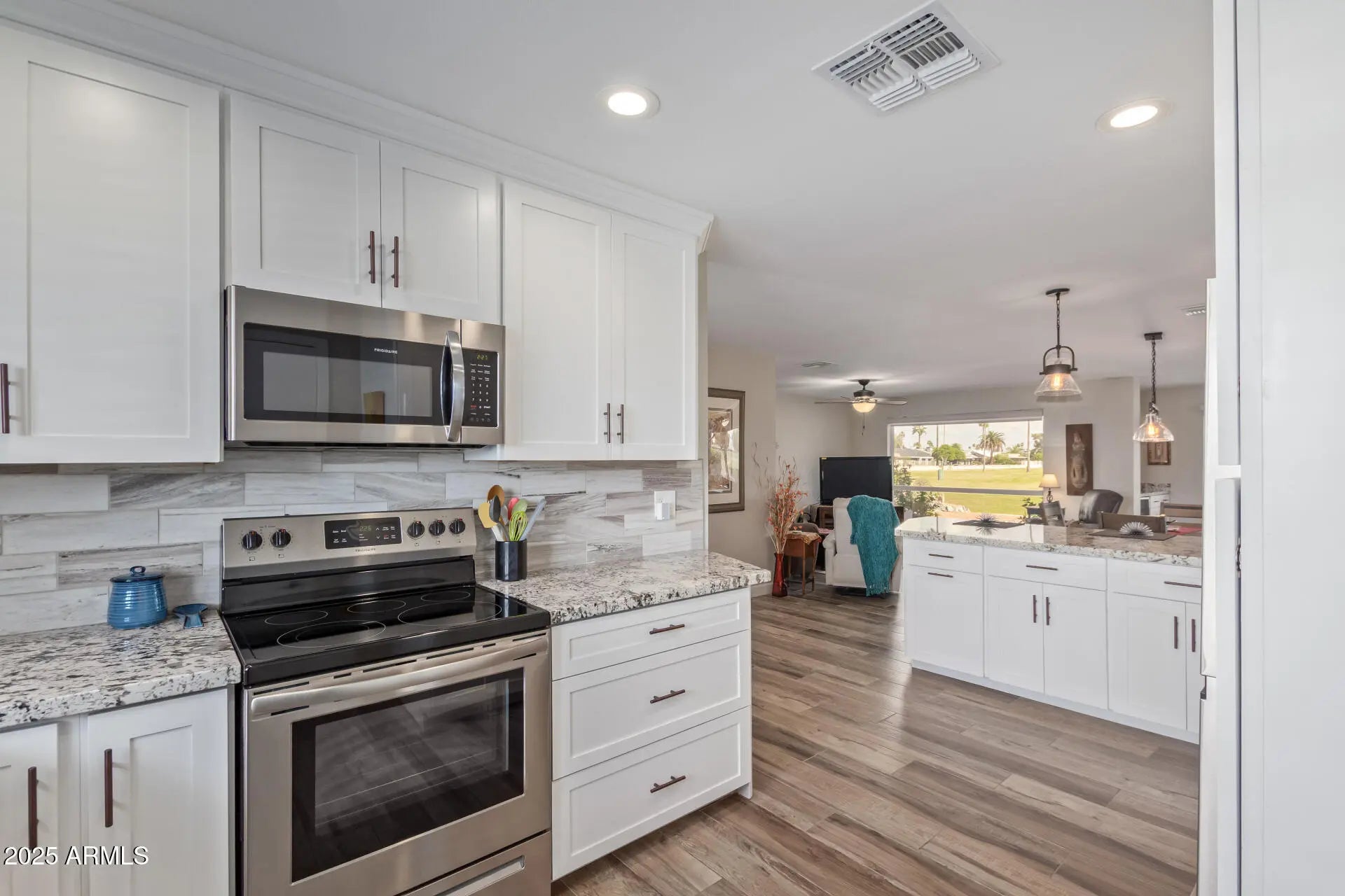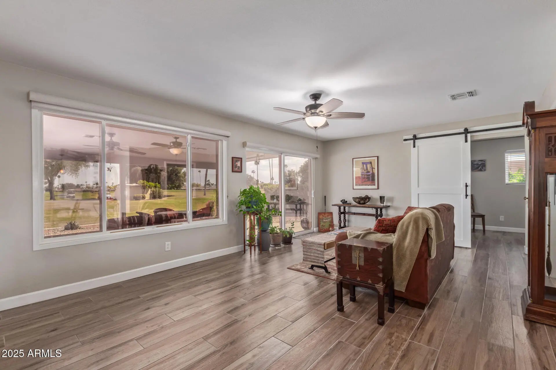 You don't want to miss this 3 bedroom home in Phase II of Sun City! This beautiful residence is a perfect balance of style & comfort, welcoming curb appeal, manicured landscape & a 2 car garage with epoxy flooring. Interior features an open floor plan with ceramic wood plank tile throughout, huge windows for plenty of natural light and great views. The modern kitchen displays recessed lights, custom shaker cabinetry for abundant storage, tile backsplash, granite countertops, breakfast bar & SS appliances. Cozy master suite has two walk-in closets and a bathroom with double sinks for convenience. Den is perfect for an office or craft room. Pluses: Sewer & water lines are up-to-date; Solar is owned outright. Pull out shelving through-out. Bar with built in wine cooler