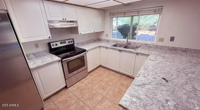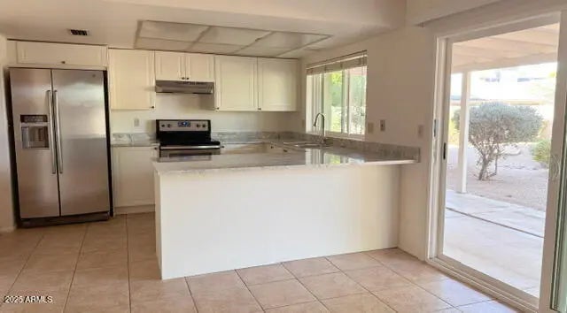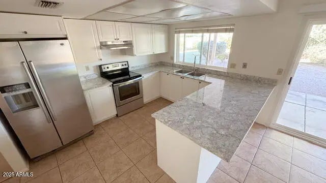 BRAND NEW KITCHEN just finished! Nice open plan with neutral colors on huge lot in cul-de-sac. Newer Low E windows/doors, U Shaped kitchen includes stainless/black appliances and breakfast bar, sunken living room, family room with tile fireplace. Tile everywhere but the bedrooms. Amazing North facing back yard with large covered patio. Shelving in garage and laundry too. Fridge is ''as-is'' courtesy only- owner will not fix/replace.