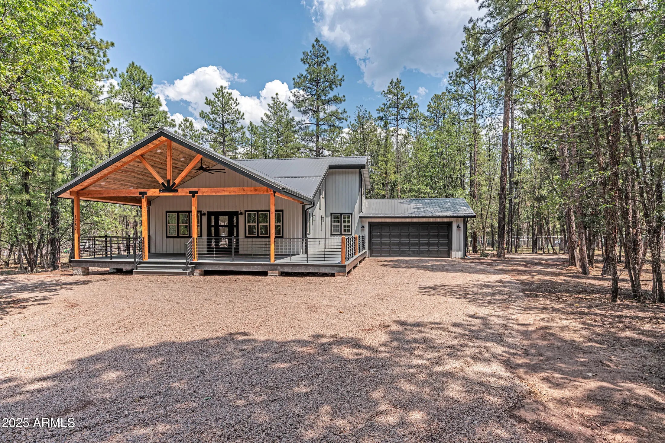 Enjoy essentially a brand-new home on a 1/2 ACRE lot tucked away in the pines near Woodland Lake. Fully renovated from the studs out. No HOA, no CCRs. NEW Firewise metal roof, siding, soffits and gutters. Gorgeous 800 plus sq ft deck (mostly covered) with tongue & groove blue pine ceiling, custom powder coated steel railings & TREX decking. No Expense spared w/NEW spray foam insulation, HVAC, solid core shaker doors, tankless water heater, ship lap accents, luxury vinyl plank floors & a redesigned layout with 4 bedrooms. The kitchen boasts quartz counters, 4x6 island, high-end appliances, pot filler, coffee bar, & two cabinet pantries. Spa-like bathrooms with tile surrounds, rain shower, & designer finishes. Milgard windows, fresh rock driveway, new septic Milgard windows, fresh rock driveway, new septic & much morethis home is truly move-in ready! Seller is a AZ licensed realtor.
