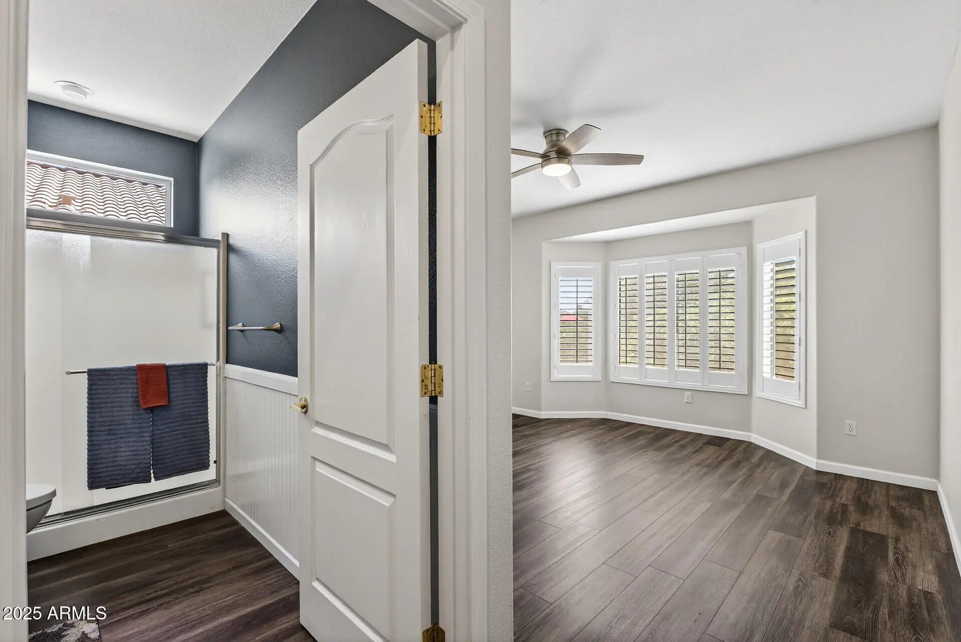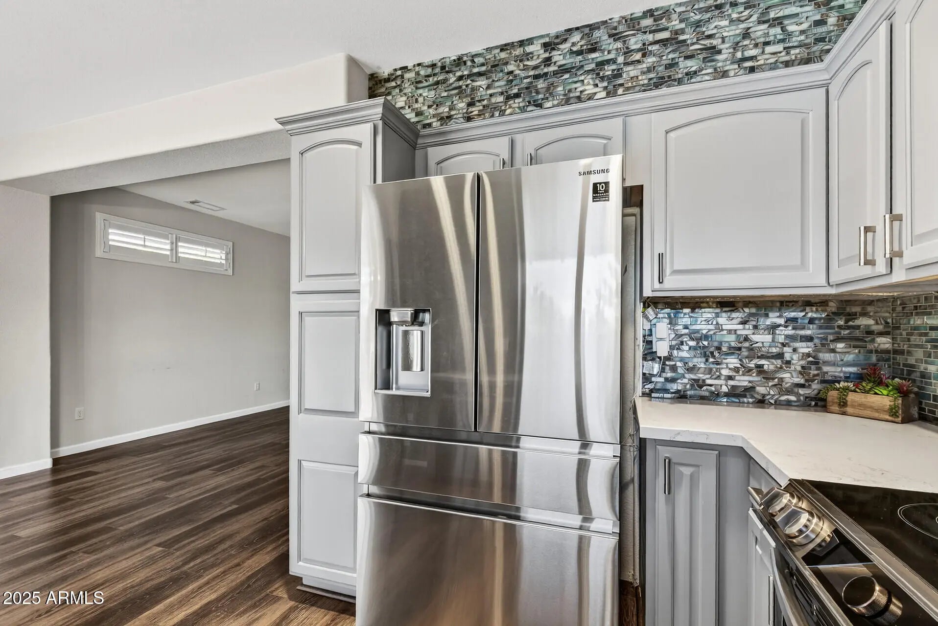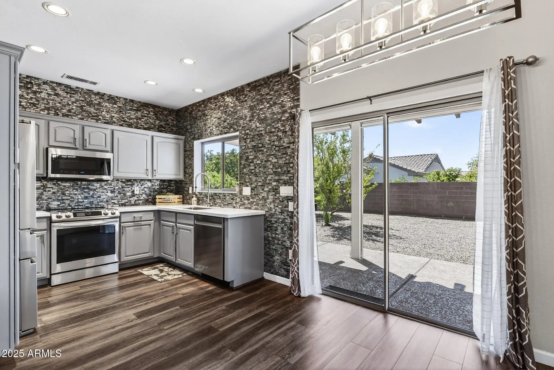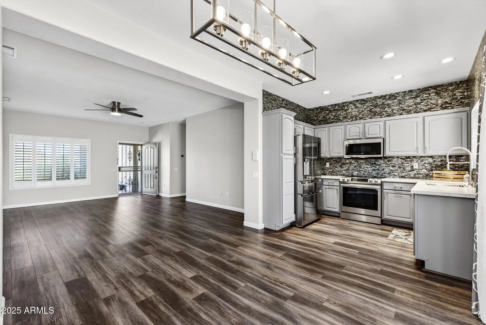 BIG WOW FACTOR! This move-in ready Cedar model is brimming with stylish upgrades & thoughtful touches. Vinyl plank flooring throughout (no carpet), updated craftsman-style baseboards, plantation shutters, contemporary ceiling fans & lighting create a fresh, cohesive look. The kitchen is a showstopper with quartz countertops, a stainless steel Samsung appliance suite, a new stainless sink and faucet, refreshed cabinetry, and a stunning glass tile backsplash that extends all the way to the ceiling. Both bathrooms have been tastefully renovated with quartz counters, new vanities and fixtures, updated lighting, and wainscoting. Spacious primary suite offers a large walk-in closet, ensuite bath with dual vanities, while the secondary bedroom features charming custom barn doors. Step outside to a large, fenced backyard with an extended covered patio, complete with convenient electric roll-down sunshades on all three sides, perfect for year-round enjoyment. THE EXTERIOR OF THE HOUSE AND BACK FENCE WILL BE FRESHLY PAINTED IN THE NEXT FEW WEEKS! Additional highlights include a 2-car attached garage with storage cabinets. This is the perfect blend of comfort, style, and low maintenance living in The Grand! SENSATIONAL VALUE WITH ALL OF THESE UPDATES!