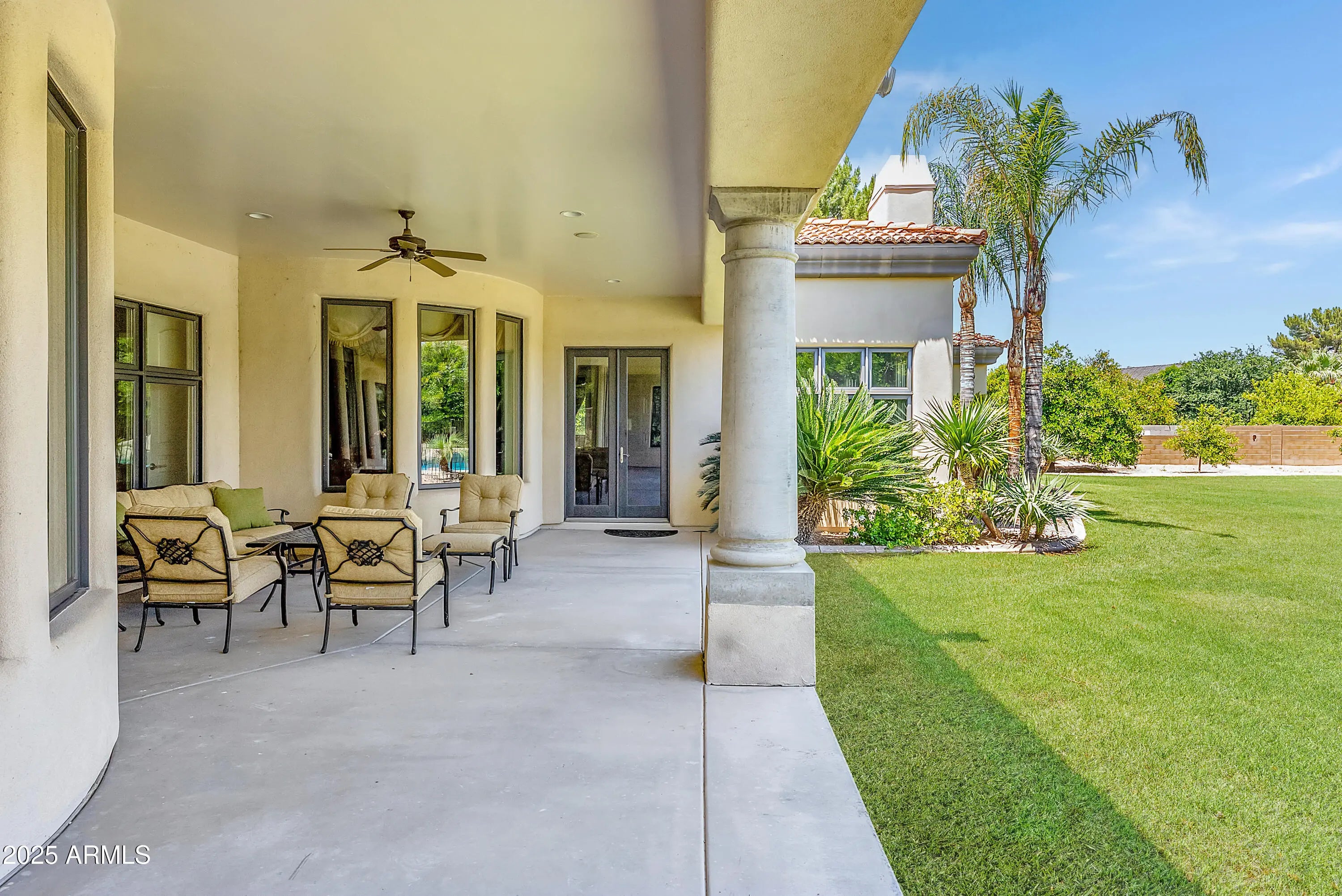 Welcome to a Santa Barbara-timeless inspired custom estate that unfolds across an expansive .81-acre parcel of lush green space, framed by irrigated citrus and mature trees. Crafted with exceptional attention to detail and high-end workmanship, the home is built with foam insulation for enhanced energy efficiency and enjoys ideal north/south exposure, allowing natural light to gently move through the interiors throughout the day. A paved circular driveway and an extraordinary grassy setting create a sense of arrival and privacy, while the estate's setting within the privately gated community of Vista Estancia—one of North Mesa's most coveted neighborhoods which offers a rare and serene citrus enclave where elegance and tranquility meet. The gorgeous backyard features an oversized lush living space, interior features include limestone & travertine flooring, high-end Lincoln casement windows, soaring ceilings, and high-quality fixtures. Boasting an ideal floor plan, the layout is appealing for many living situations. A TRUE SPLIT FLOOR PLAN, the Primary Suite occupies a separate wing of the home, with a spacious sitting room, romantic fireplace, and a well-appointed ensuite bath with abundant built-in storage and a spacious walk-in closet. Three newly painted and newly carpeted guest rooms are in another wing of the home; two with private verandas, walk-in closets and one with an ensuite bath. Beyond the great room and kitchen is a flex space, guest bedroom and full bath with endless possibilities as a MULTI-GEN LIVING SPACE, GAME ROOM, PLAY ROOM or MOVIE ROOM! A formal living and dining create a gracious entertaining space, while the GORGEOUS GOURMET KITCHEN with TIMELESS FEATURES and CLEAN LINES features a huge island, Alder wood cabinetry, built-in refrigerator with sleek wood-paneled doors, dual ovens, gas cooktop and so much more. Open to the EXPANSIVE GREAT ROOM with a view into the back yard and pool, a custom wood built-in entertainment wall and relaxing gas fireplace create an inviting atmosphere. Other notable features of this stunning home include full spray-foam insulation, updated HVAC systems (1 brand new), irrigated citrus trees, a HUGE KITCHEN PANTRY AND STORAGE, a secondary climate-controlled storage room, and gorgeous laundry/utility with cabinets, sink and built-in ironing board. Car enthusiasts will love the over 1,100 sf over height and extended length garage with new epoxy flooring, and space available to build an additional garage if desired. And the best thing? This home scores in the top tier of similarly-sized homes in energy efficiency according to SRP! This fully private lot is situated adjacent to a quiet private park with a playground and a basketball court. Vista Estancia is ideally located near the end of a quiet street with minimal traffic, but is just minutes away from the Loop 202 & Sky Harbor Airport, with easy access to downtown Phoenix, Scottsdale and the Mesa Arts Center. Northeast Mesa is a mecca for some of the best hiking, biking, paddling, fishing, golf and tennis in the Valley, as well as being just an hour's drive from the cool pines of Payson. Move in ready or ready to become your next masterpiece. As a bonus -- *SELLER OFFERING $10k in carpet/floor credit at COE*