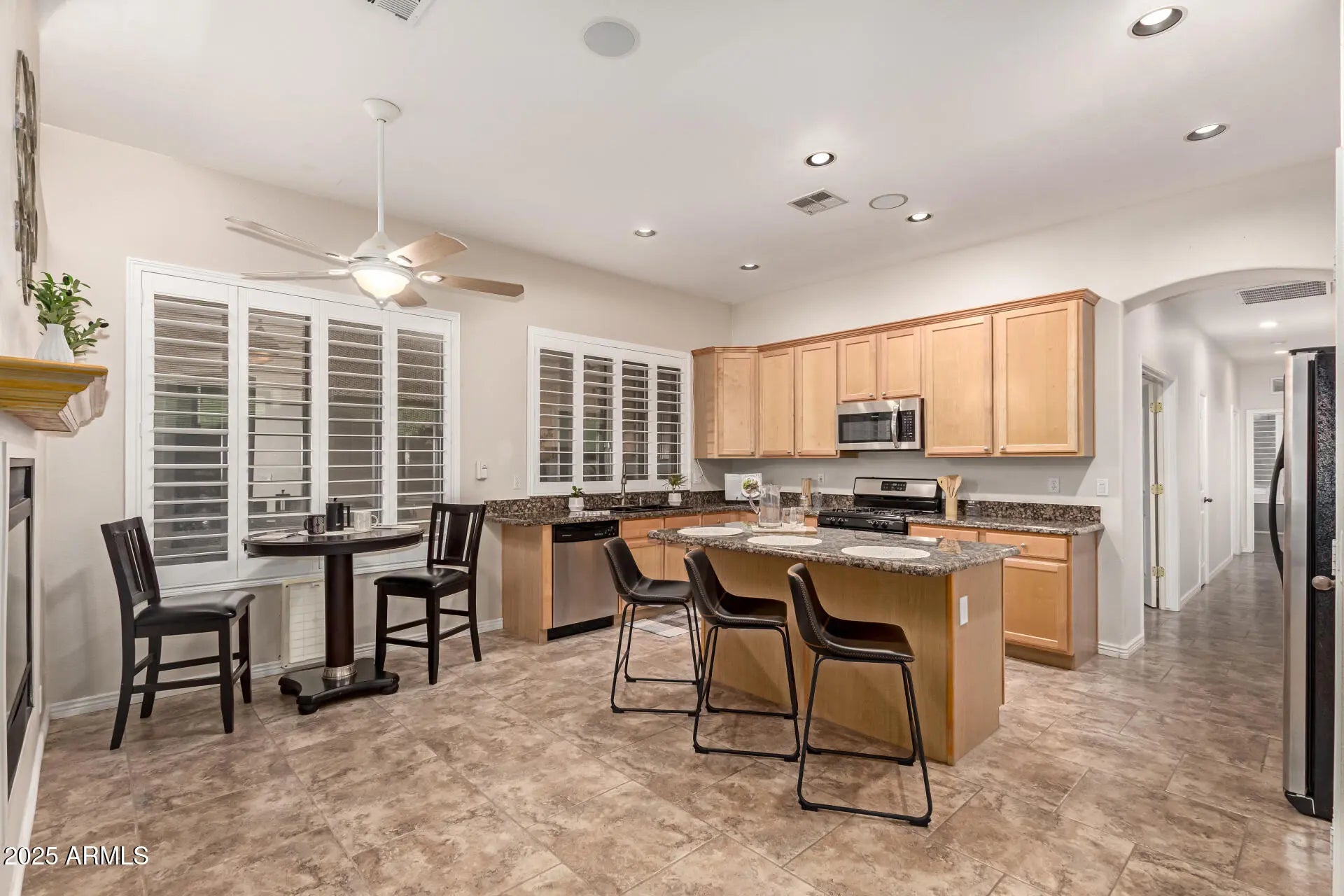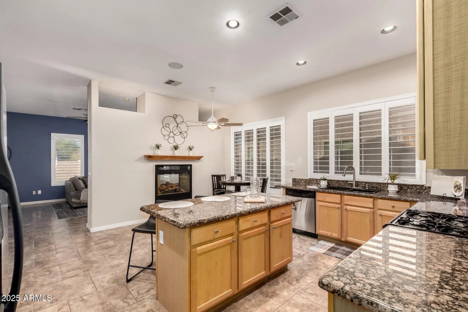 Don't miss this beautifully maintained 4-bed, 2-bath home in Settler's Meadow with 3-car garage and pool—now offered at a fantastic new price! Enjoy bright, open living with plantation shutters, surround sound, and tile throughout. The family room's two-way gas fireplace adds cozy charm, while the kitchen features granite counters, gas range, SS appliances, and island. Primary suite offers a sitting area, dual sinks, large shower, and walk-in closet. Updated roof, Trane ACs, garage AC, and resurfaced pool/deck. Private lot near park and downtown Gilbert!