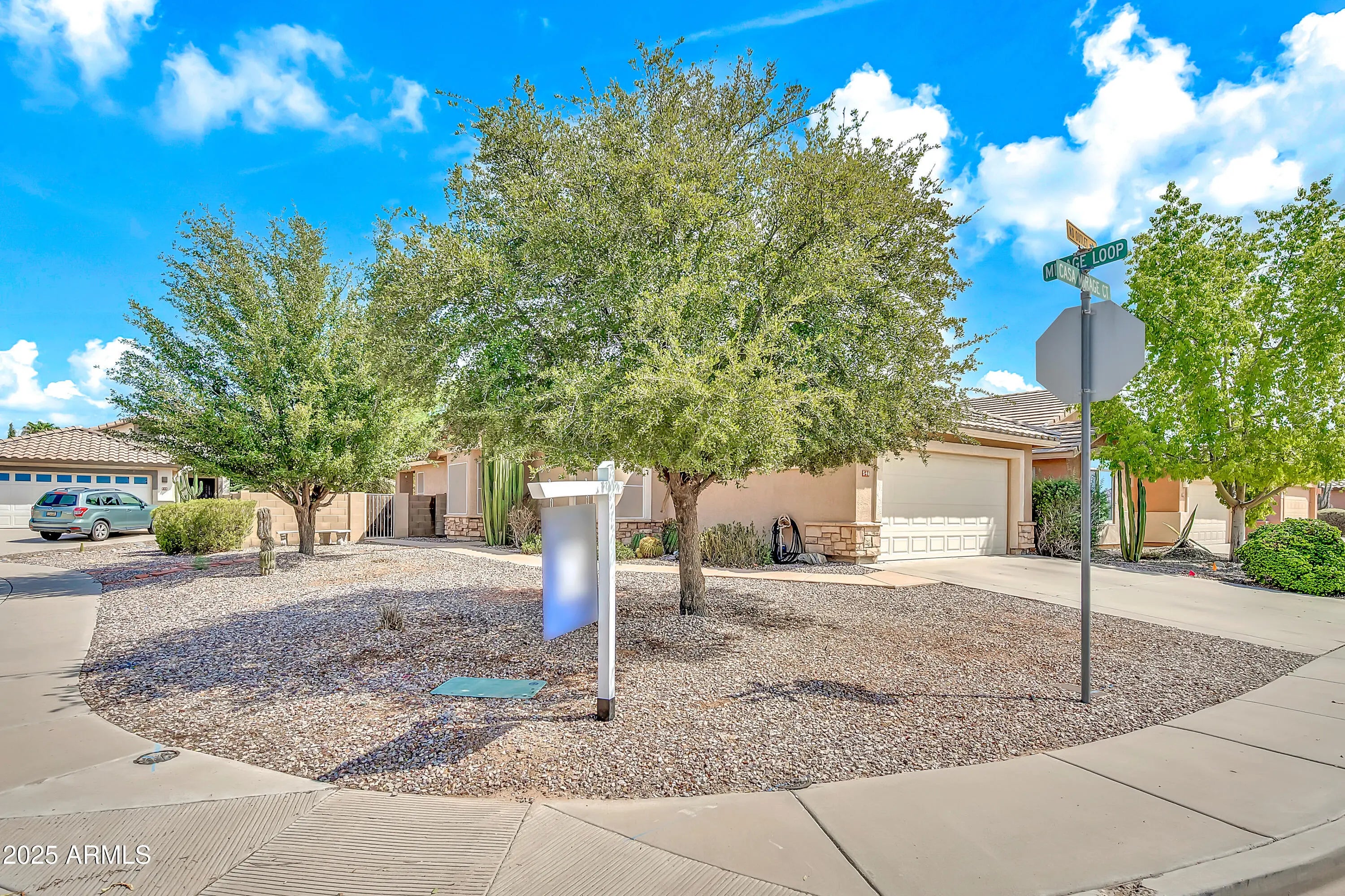 Welcome to this charming single-story corner lot home in the desirable Casa Mirage neighborhood of Casa Grande, where curb appeal and abundant natural light make it truly stand out. This 2-bedroom, 2-bath residence offers 1,196 sqft of comfortable living space with an inviting open layout, decorative niches, and stylish flooring. The updated kitchen features a modern backsplash and a new range/oven, while the included dishwasher, refrigerator, washer, and dryer make this home truly move-in ready. Outside, a covered patio and mature citrus trees create a peaceful retreat, enhanced by the privacy and openness that only a corner lot can provide. With access to the community pool and a prime location, this home perfectly blends charm, value, and convenience.