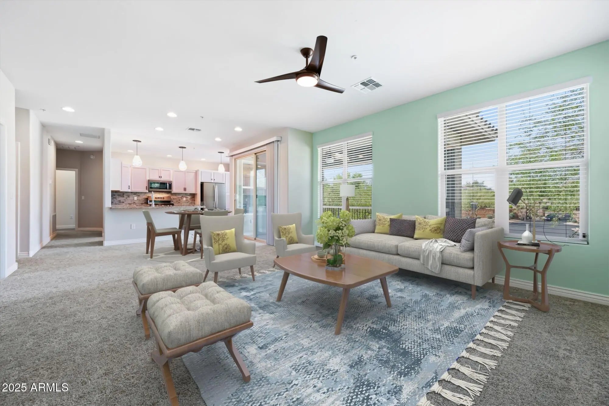 NEW LOWER PRICE!! Step inside and feel it instantly - this home welcomes you in. Sunlight pours over brand-new plush carpet and 9-ft ceilings that make every room feel open and airy. With 2 bedrooms, 2 bathrooms, and a flexible den, you've got space to work, relax, and live your way. Life expands outdoors, too. Enjoy two private patios for morning coffee or evening wine, plus two storage areas to keep everything tidy and uncluttered. This condo is more than move-in ready - it's effortless living. With a heated pool, fitness room, and peaceful walking paths, you get resort-style amenities without any upkeep.