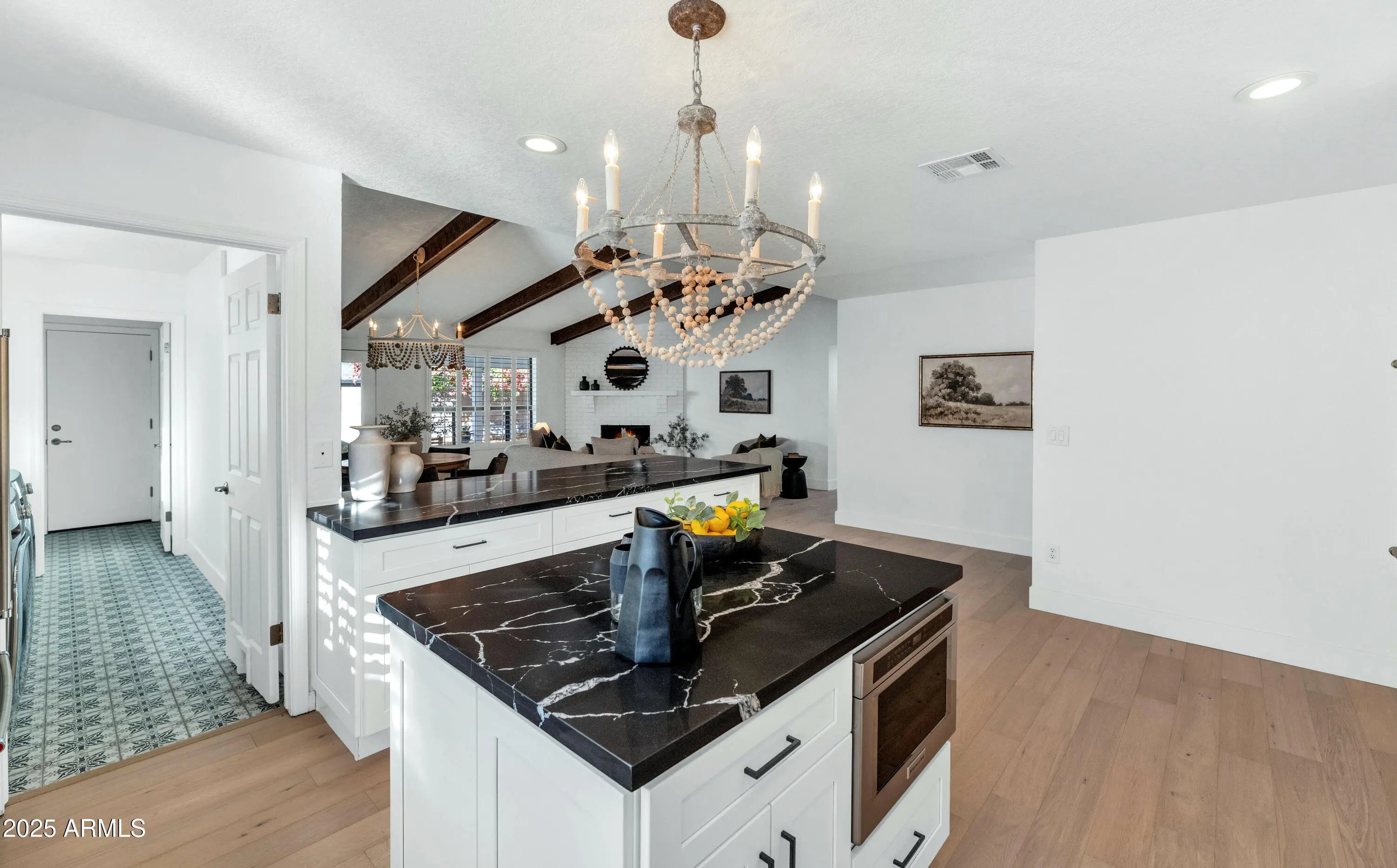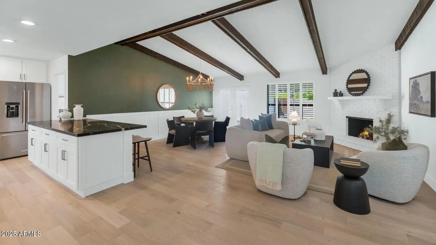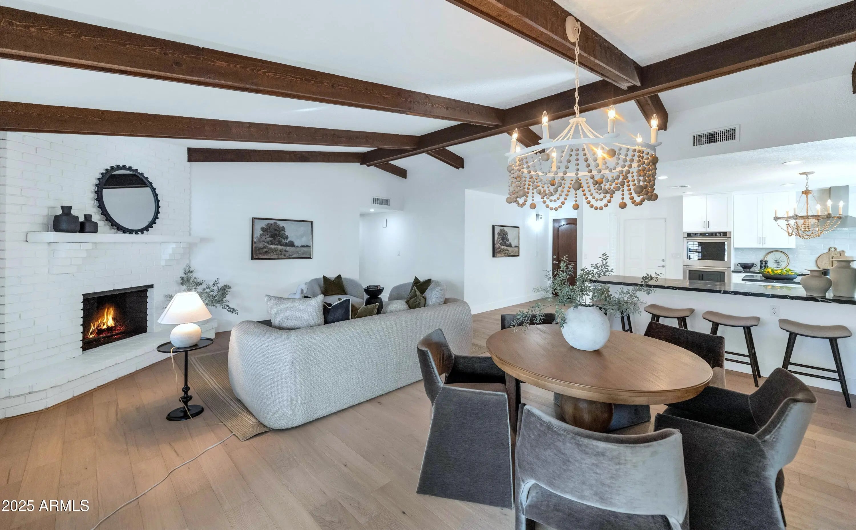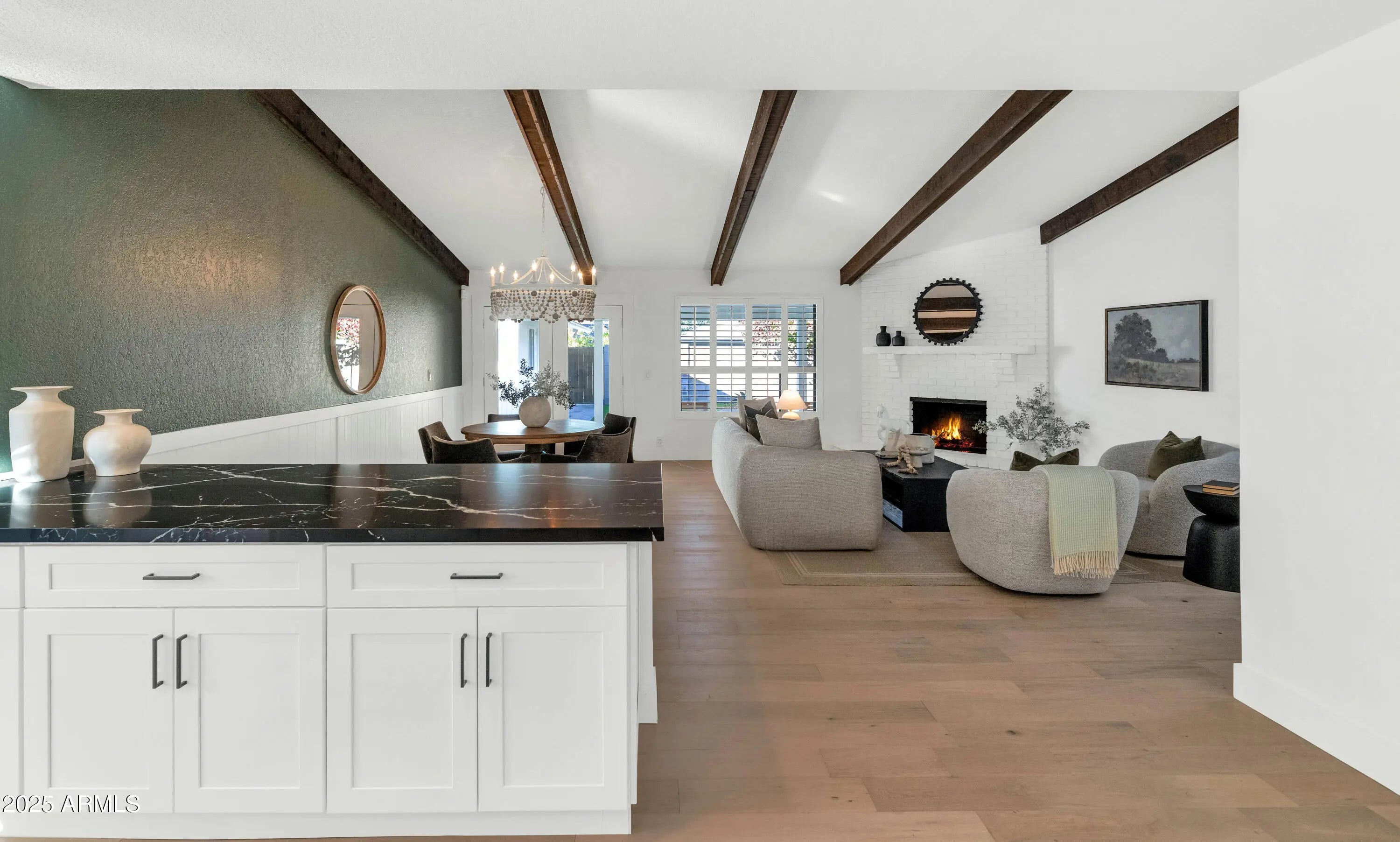 If you think you've seen this house, it's time for another look! With three FULL bedrooms it's perfect for first-time buyers or those looking to downsize. This beautifully remodeled home blends style, comfort, convenience, and garage space with room for ALL your toys! See how this space best works for you! The light-filled island kitchen boasts pristine white cabinetry, elegant marble countertops, and stainless-steel appliances—ideal for both everyday living and entertaining. The spacious living room features striking exposed wood beams and a stunning floor-to-ceiling brick fireplace, creating a warm and inviting space to gather with loved ones or spend a cozy evening in front of the fire. The serene primary suite offers its own cozy fireplace and an enormous walk-in closet with its own temperature control. Outside, you'll find a beautifully landscaped yard with lush grass, incredible curb appeal, and rare garage parking for 4 cars, OR turn the detached garage into an office, gym, or full casita and rent it for passive income - floor plan options in documents tab. The possibilities are endless! Located within walking distance to some of Phoenix's best shopping, dining, hiking trails, and entertainment, this home truly has it all.