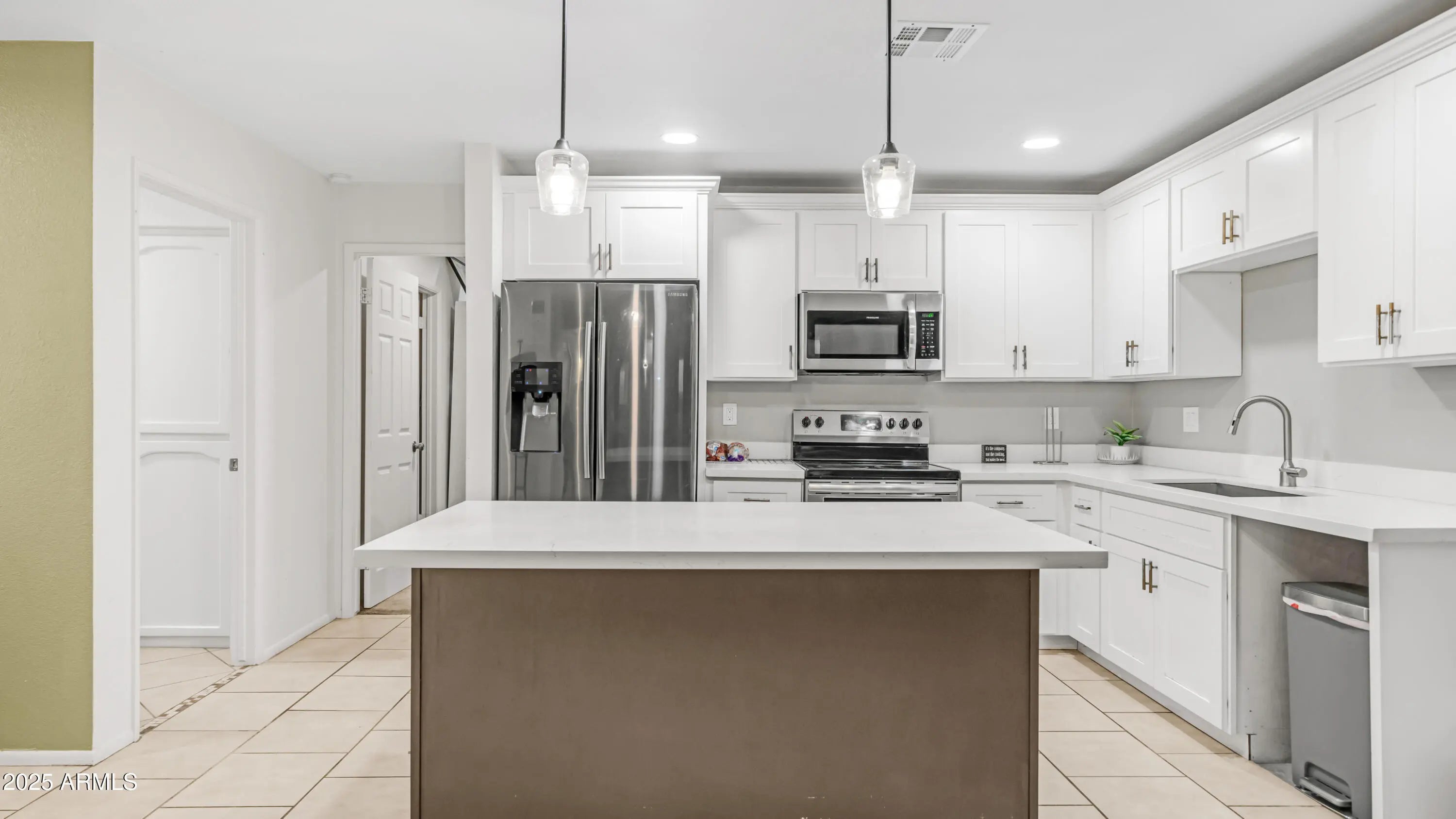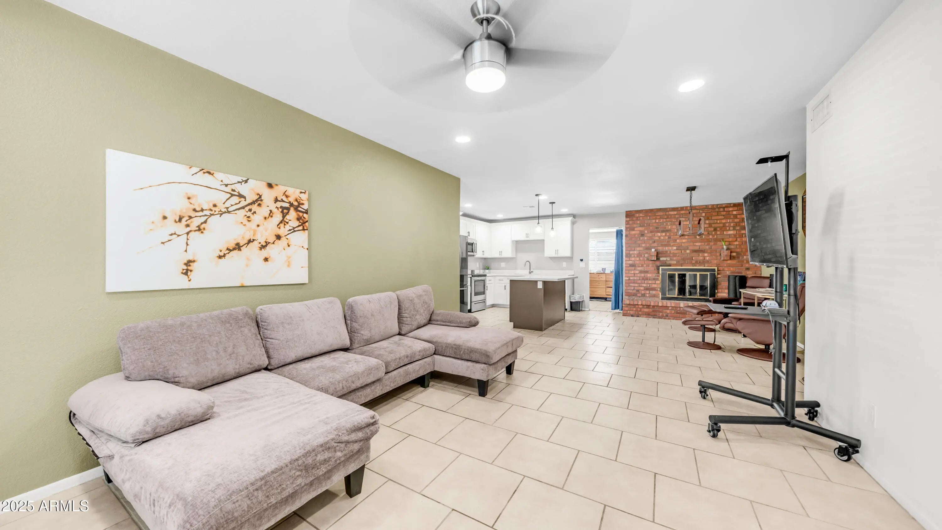 Charming 3-bedroom, 2-bath Glendale home featuring open living and a cozy brick-mantle fireplace. An Arizona sunroom off the kitchen/dining area adds extra versatility and natural light. The kitchen, updated in 2022, offers white stone countertops, soft-close cabinets, stainless steel appliances, and a spacious island. Tile flooring flows through the main living areas with carpet in the bedrooms. Bathrooms feature beautifully tiled shower/tubs. With tasteful updates and timeless comfort, this home is perfect for everyday living and entertaining.