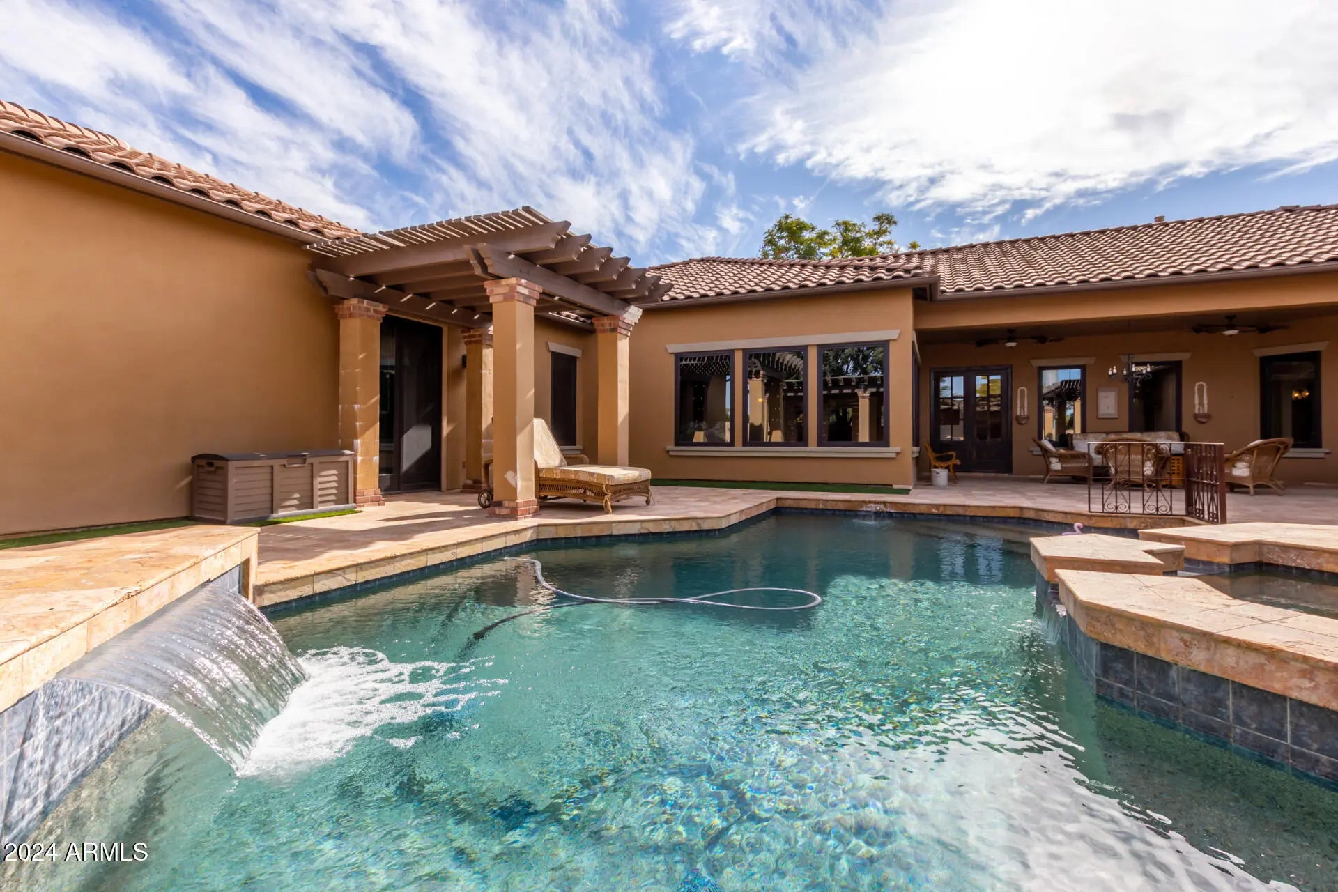 Welcome to your dream home in the coveted Higley Groves West community of Morrison Ranch, celebrated for its tree-lined streets and timeless neighborhood charm. Situated on a premium corner lot of nearly half an acre with no neighbors behind, this property offers unmatched privacy and over $200K in luxury upgrades. Comfort and efficiency abound with extra attic insulation and triple-pane Anderson windows and patio doors that fill the home with natural light. The chef's gourmet kitchen showcases Wolf appliances, a Sub-Zero refrigerator, built-in icemaker, and a stylish minibar with wine cooler. Plantation shutters, updated bathrooms, and custom French doors in the dining room elevate the interiors, while the owner's suite includes sliding doors that open to the backyard retreat. Designed for year-round enjoyment, the resort-style backyard features a built-in Wolf grill and flat grill, sparkling saltwater pool and spa, and expansive travertine decking. Even the garage is thoughtfully upgraded -- fully vented and ready for air conditioning, perfect for a home gym, workshop, or hobby space. With scenic walking trails to the Riparian Preserve and easy access to top-rated schools, shopping, and dining, this home perfectly blends luxury, functionality, and location in one of Gilbert's most sought-after neighborhoods.