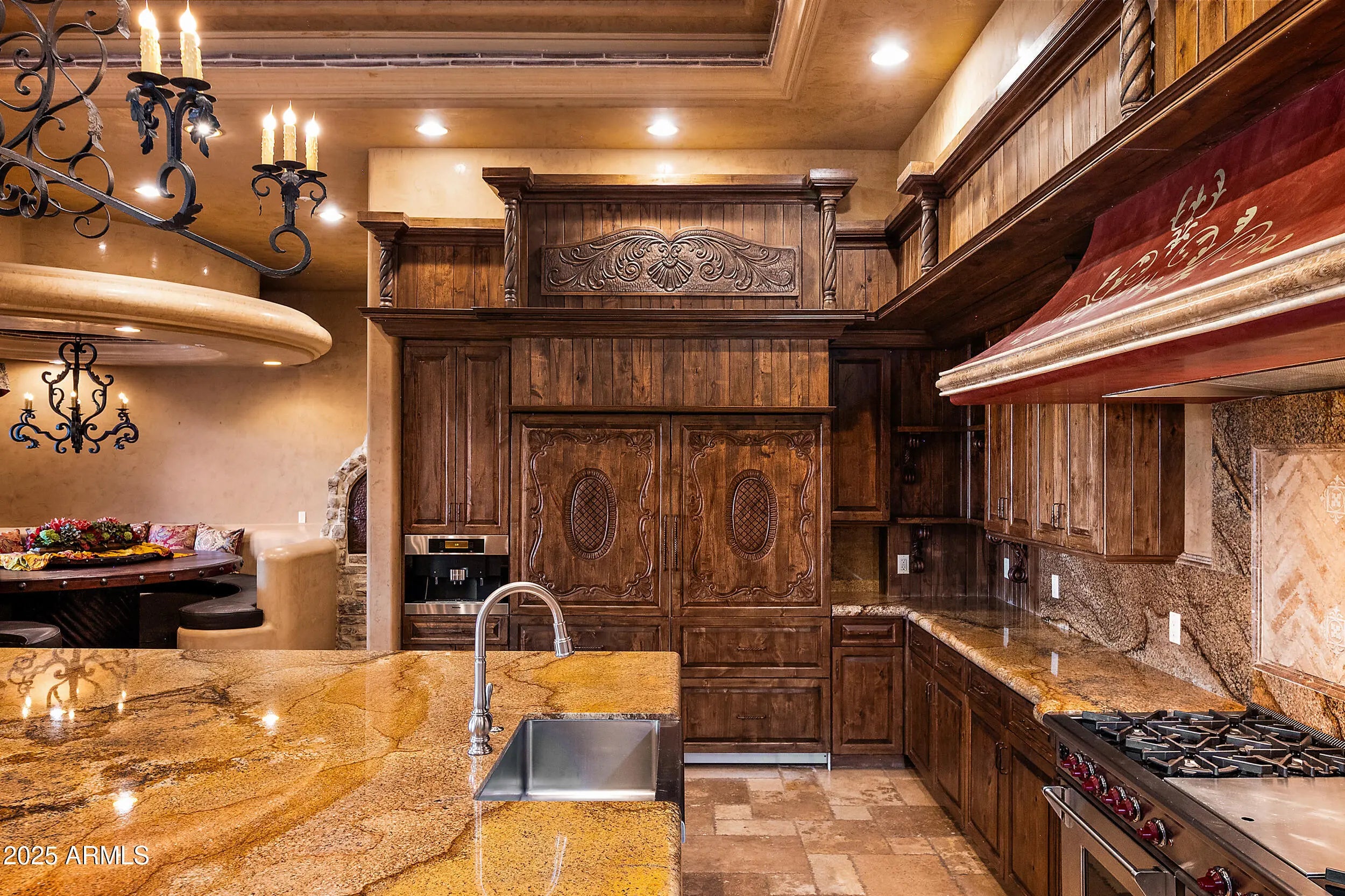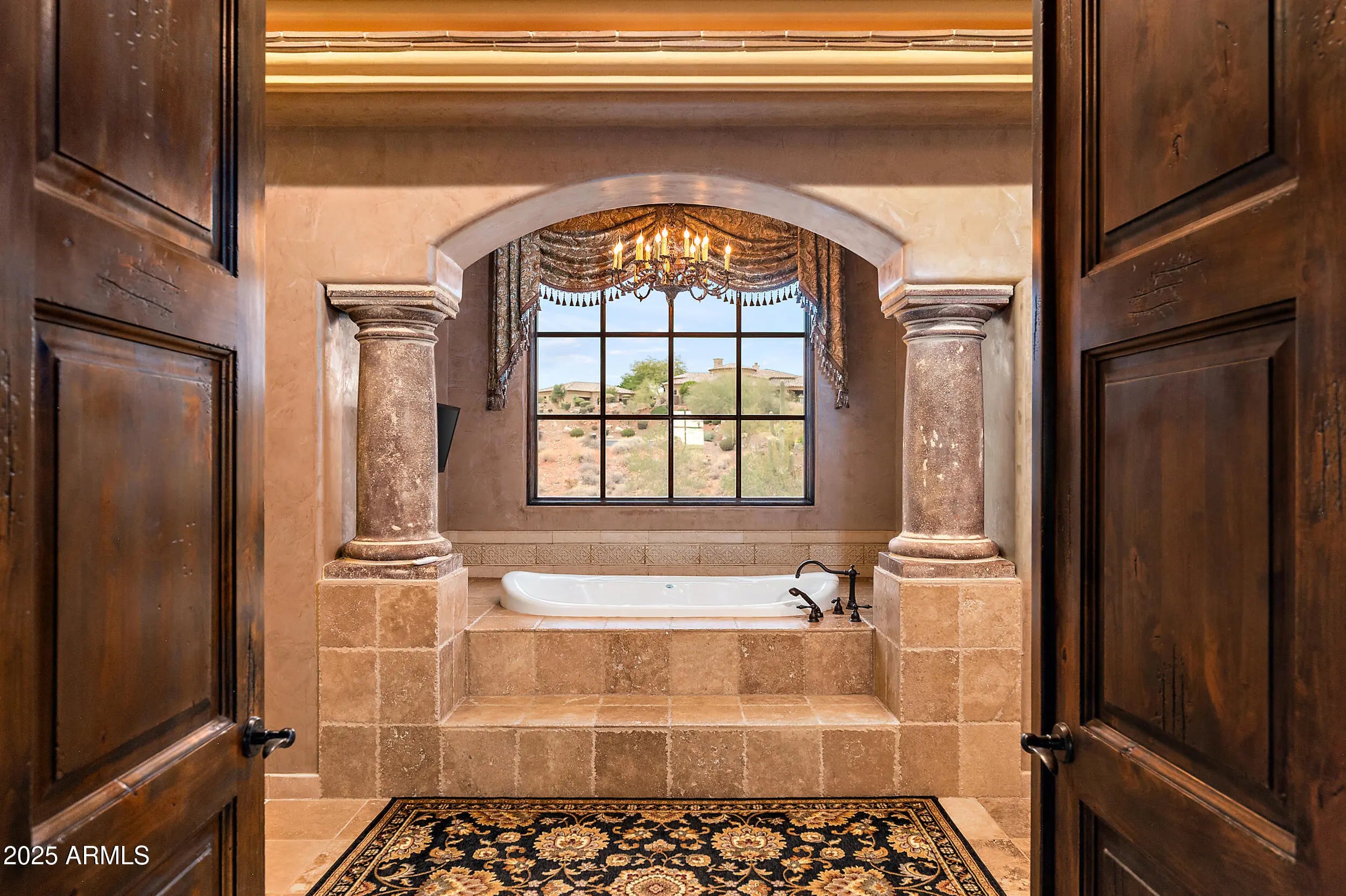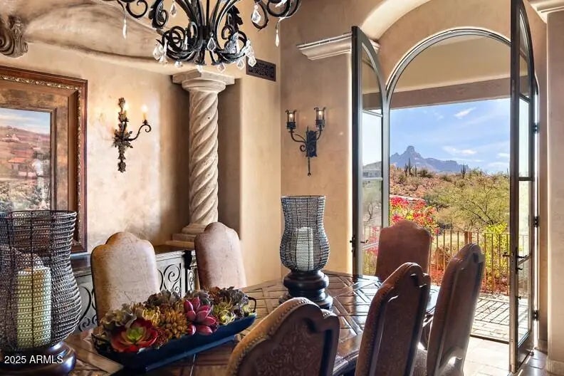 Embrace la dolce vita in this magnificent Tuscan estate, brimming with timeless Old World charm. Situated on a 1.79 ac lot the home is designed to capture views of Four Peaks, Red Mountain, and the Firerock Country Club golf course. A stretched paver driveway over a private bridge with whitewashed stone walls leads to a gated courtyard with bubbling fountains, fruit trees, and vibrant planters. Multiple sets of arched doors seamlessly connect the courtyard and terraces to the heart of the home, creating an effortless indoor/outdoor lifestyle. Inside bespoke architectural details include 18-20' dramatic dome and wood-beam ceilings, imported stone, hand-carved woods, 10' Cantera fireplace, and Venetian plaster walls. The home is one level with spacious 5 bedrooms/ensuites + seperate guest casita. Outdoor living is the showpiece with expansive terraces and a tiered pool featuring a two-story waterfall, stone slide, and plunge and play pool. Turnkey elegance awaits as furnishings are included. This extraordinary estate is one to be experienced in person to fully appreciate its artistry, scale, and one-of-a-kind details.
