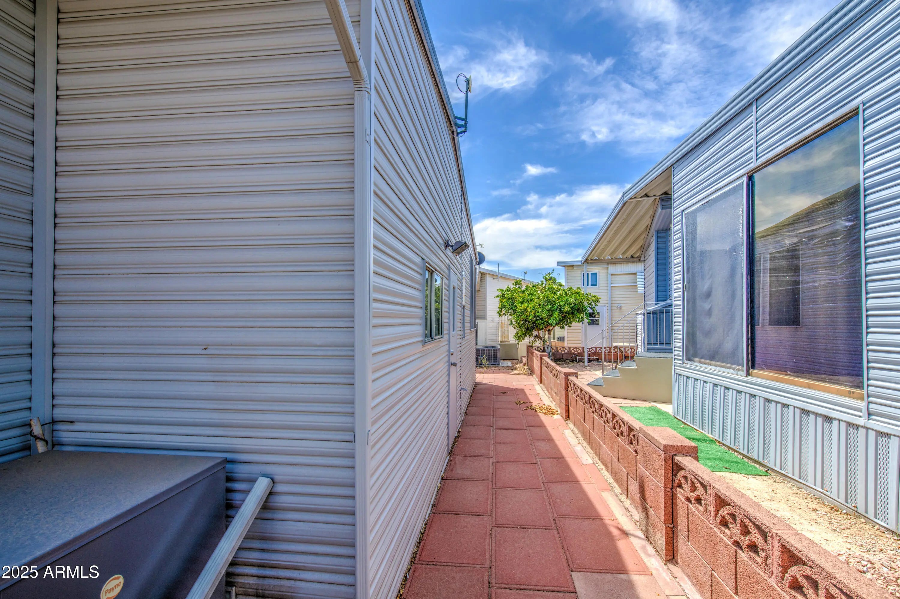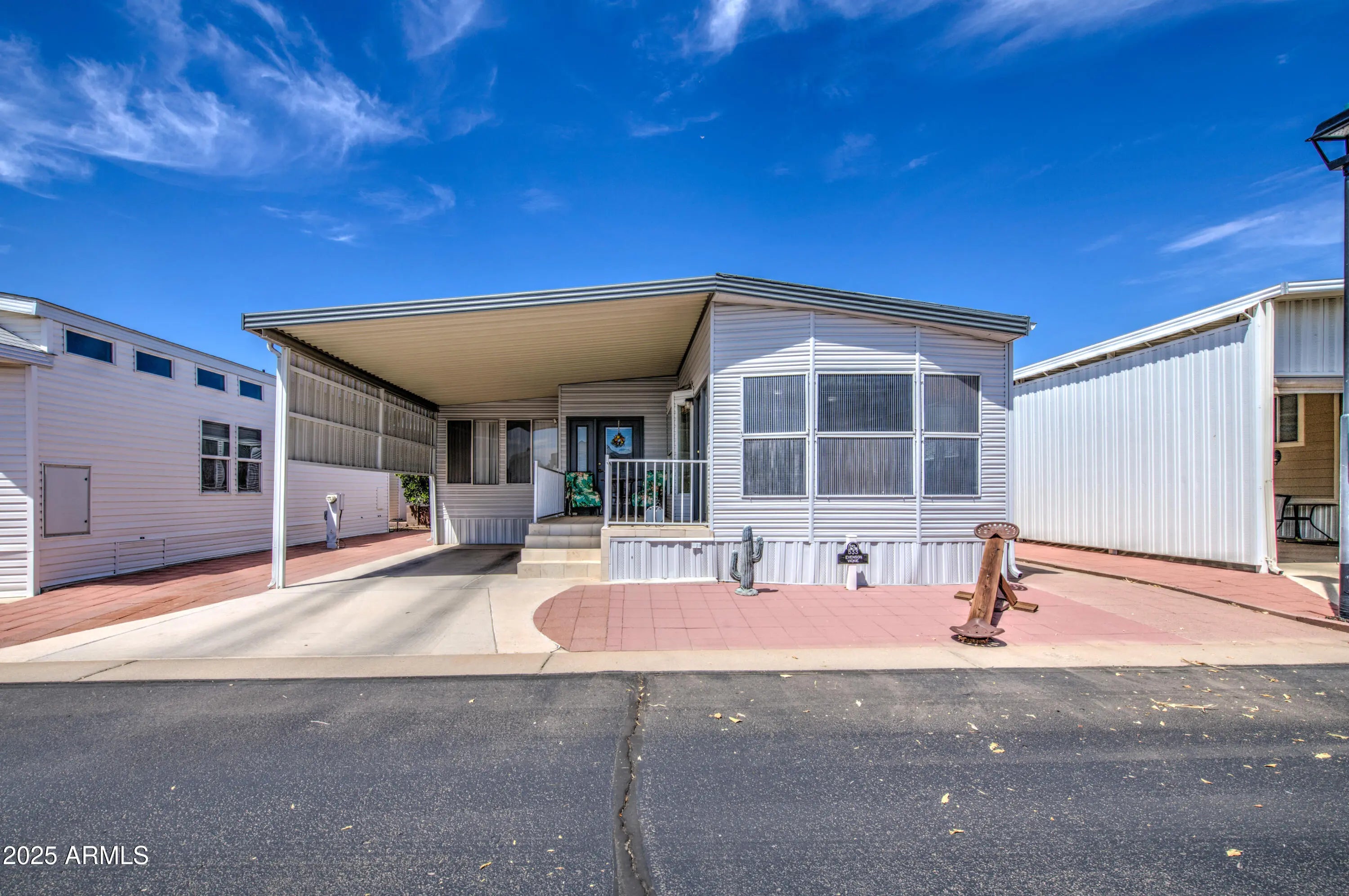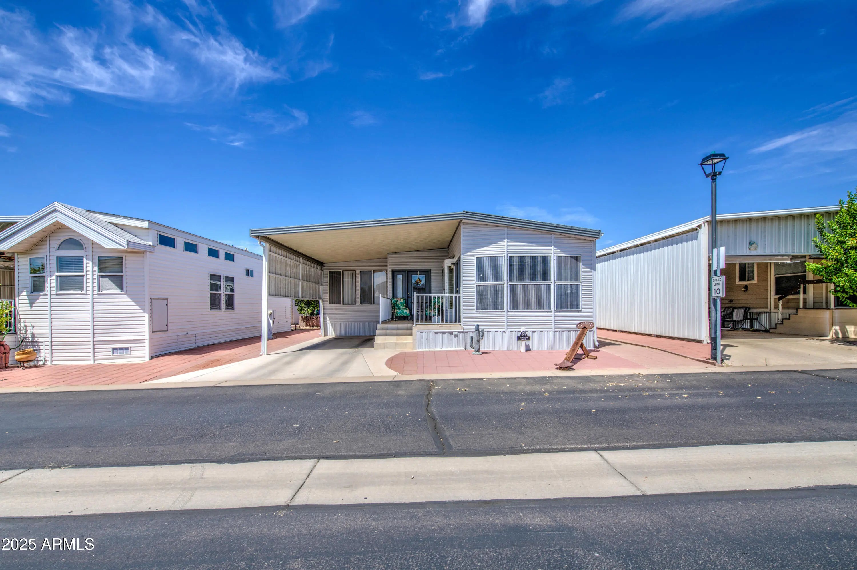 This is a great eastern facing Park Model with an Arizona Room in Carriage Manor Resort, a premier 55+ Community where you OWN THE LAND! This beautiful home had a new A/C unit installed in 2024. It also has a 40 gallon hot water tank that was installed in 2020. The cute little side kitchen with a moveable island is open to the front living area making this a very open floor plan. It has a very large Arizona Room with a full size washer & dryer INSIDE as well as a laundry tub. Carriage Manor has 24/7 on site security, a heated saltwater pool/spa, fitness facility, Tennis, Pickle ball, Golf Club, Onsite heated pool/spa, nice fitness facility, Tennis, Pickle ball, Golf Club, Billiards, Lapidary/Silversmith, Sewing, Wood shop, Bingo, Dances parties & many more activities & amenities