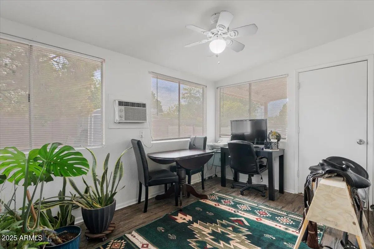 This home will wow you! Turn key home with RV hookup (both water and sewer hookup!). Furniture included!! Modern leather sofa and chairs, comfy beds and more! This home is just waiting for you to move in and enjoy the many upgrades including easy to maintain vinyl plank floors throughout most of the home, wainscotting in dining new living room fan, fresh paint, updated bathroom and kitchen with upgraded stainless steel appliances! The yard is a sanctuary with a huge pine tree providing abundant shade a bounty of gorgeous roses and flowers beckon you home. Pet friendly fencing and patio to keep your fur family safe. Enjoy the enclosed, air conditioned or easy breezy Arizona room which can be used as a third bedroom.