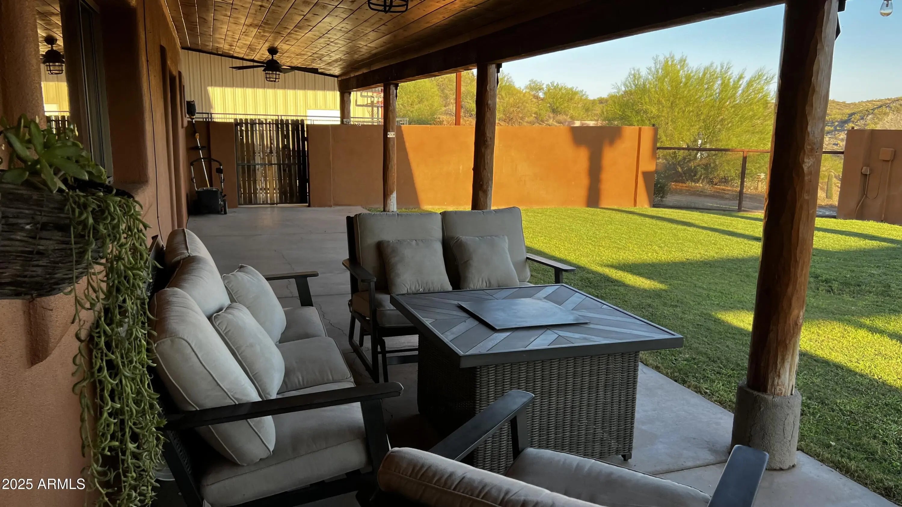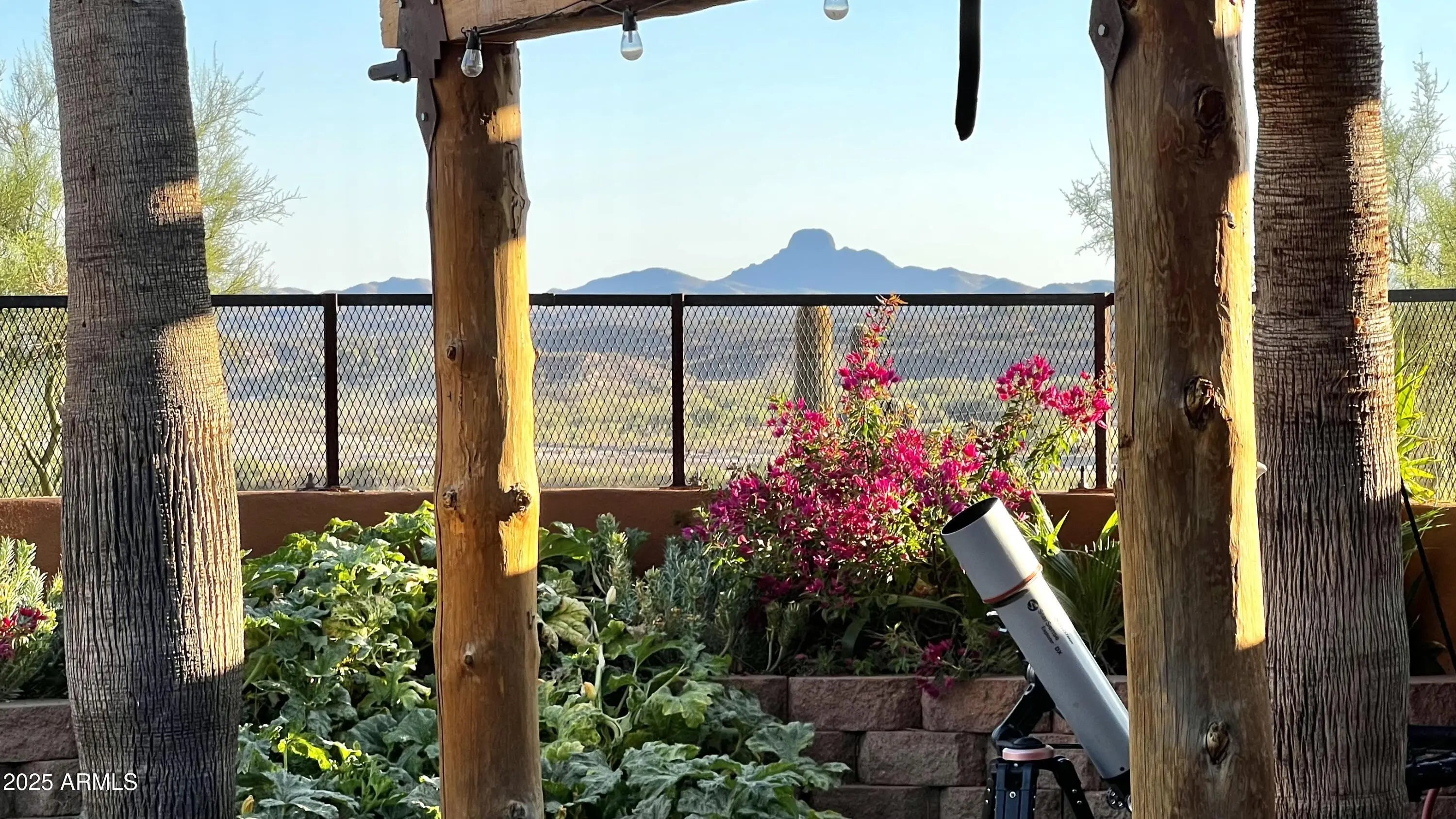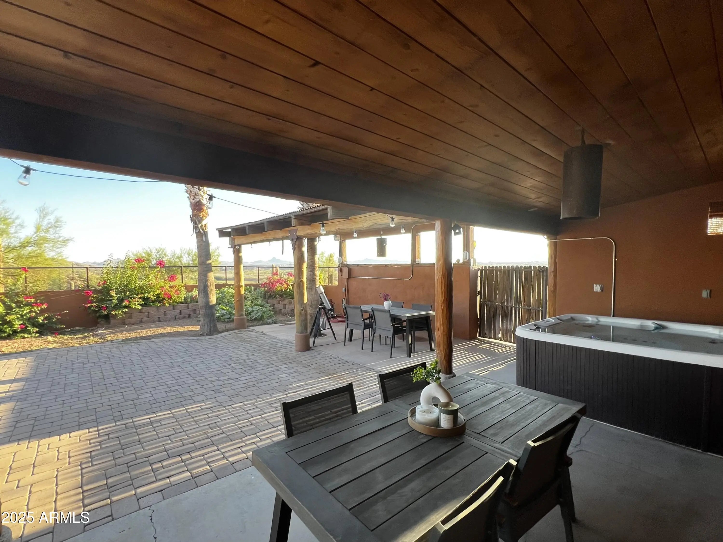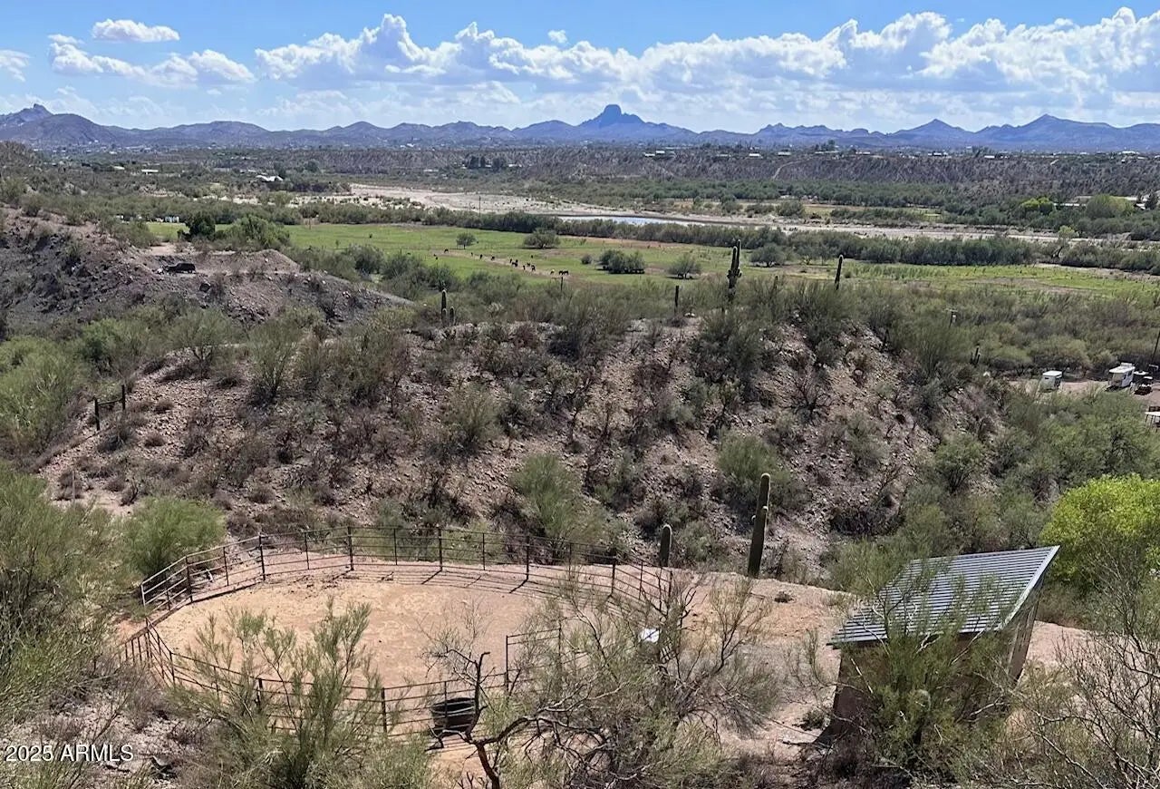 Impressive views of Vulture Peak. Property offers your guests 2 FULL HOOKUPS for RV's, a 30 & 50 AMP/ another 30AMP-125V at Carport/ & a 50AMP-250V in the 20x42 Shop/RV Garage! MUST SEE TO BELIEVE! Warmth & Personality greet you at the front door & welcome you into the Grand Living Room w/ Soaring Ceilings adorned w/ massive Round Timber Beams. Expansive arched entry leads into the Heart of the Home. This expansive kitchen space is where you will enjoy everything from your first cup of coffee at dawn to family dinners. GRANITE counters. Marble backsplash. Dual ovens, Kitchen Island w/ Wine Rack. Sliding Glass Patio Doors invite you into a covered, Outdoor Living Space, enclosed w/ tall courtyard walls for comfort & safety for you & your furry family.