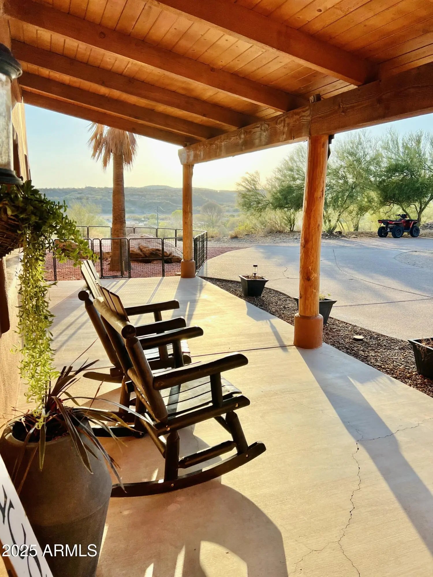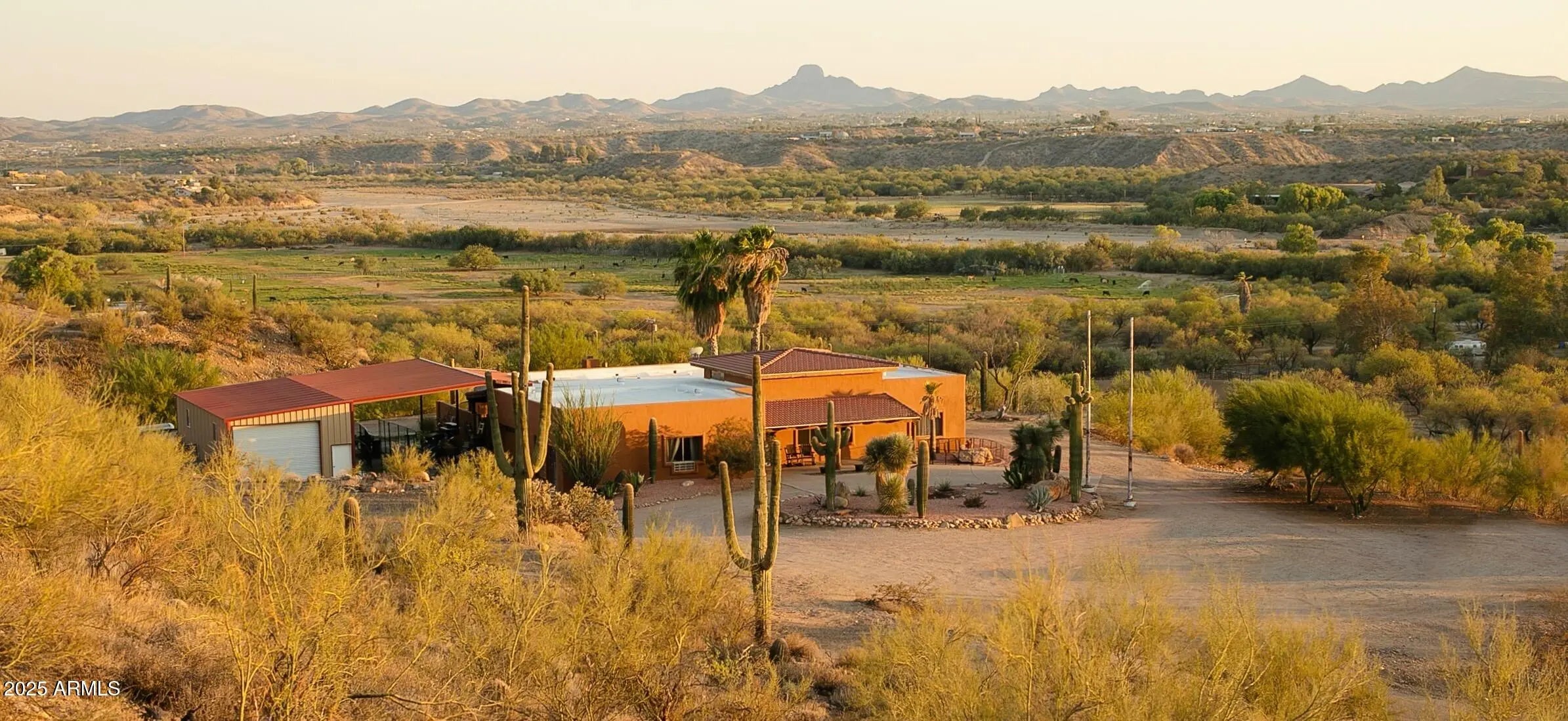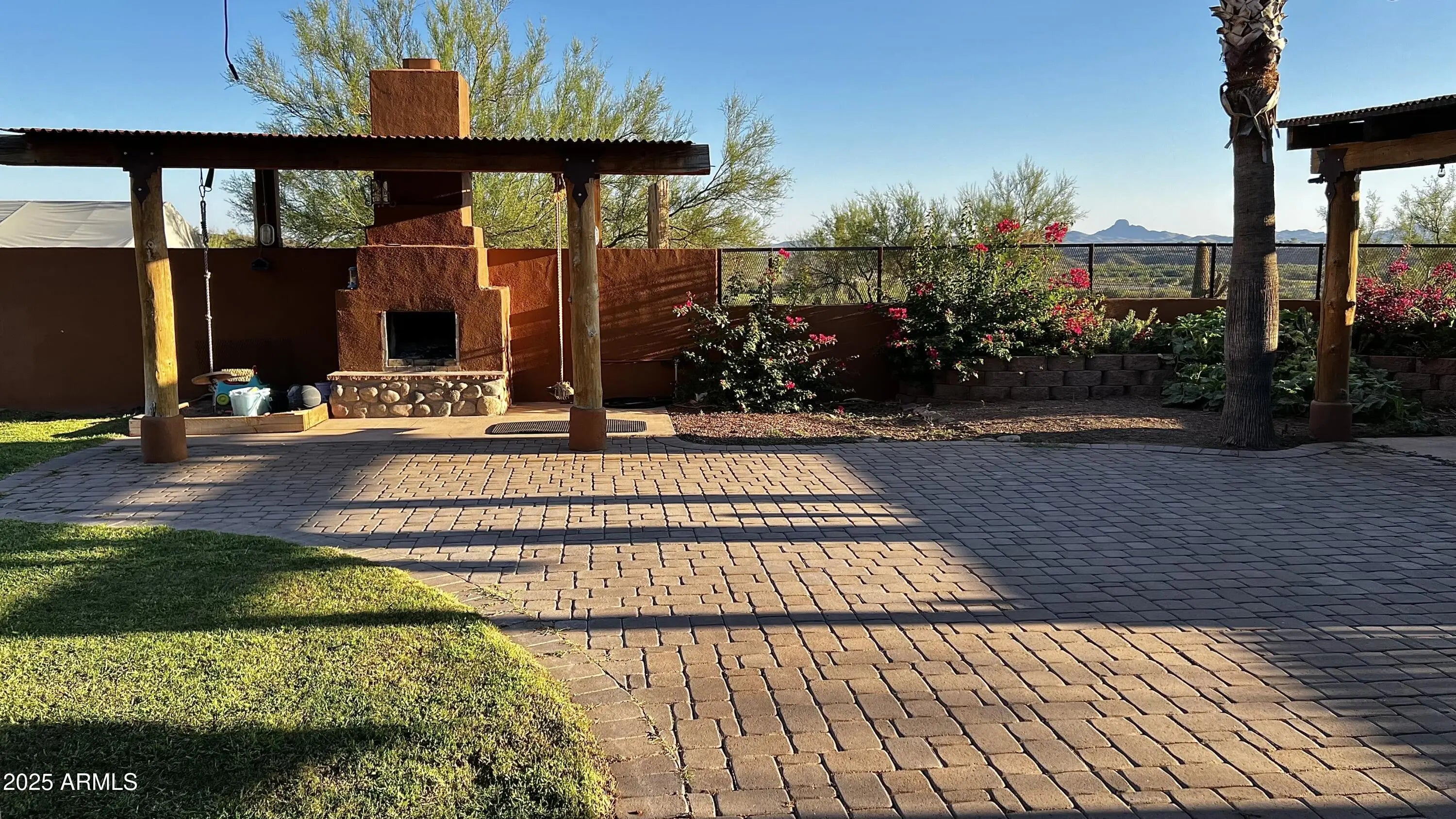 Impressive views of Vulture Peak. Property offers your guests 2 FULL HOOKUPS for RV's, a 30 & 50 AMP/ another 30AMP-125V at Carport/ & a 50AMP-250V in the 20x42 Shop/RV Garage! MUST SEE TO BELIEVE! Warmth & Personality greet you at the front door & welcome you into the Grand Living Room w/ Soaring Ceilings adorned w/ massive Round Timber Beams. Expansive arched entry leads into the Heart of the Home. This expansive kitchen space is where you will enjoy everything from your first cup of coffee at dawn to family dinners. GRANITE counters. Marble backsplash. Dual ovens, Kitchen Island w/ Wine Rack. Sliding Glass Patio Doors invite you into a covered, Outdoor Living Space, enclosed w/ tall courtyard walls for comfort & safety for you & your furry family.