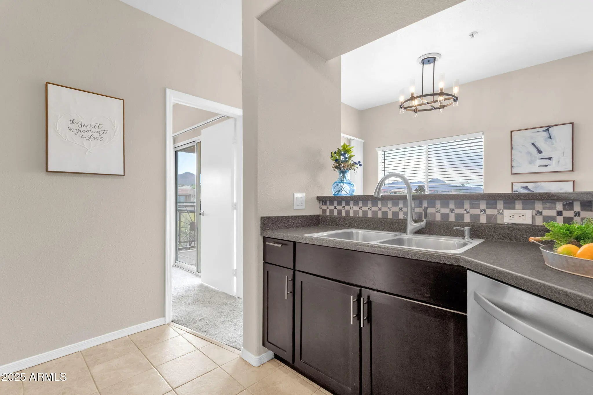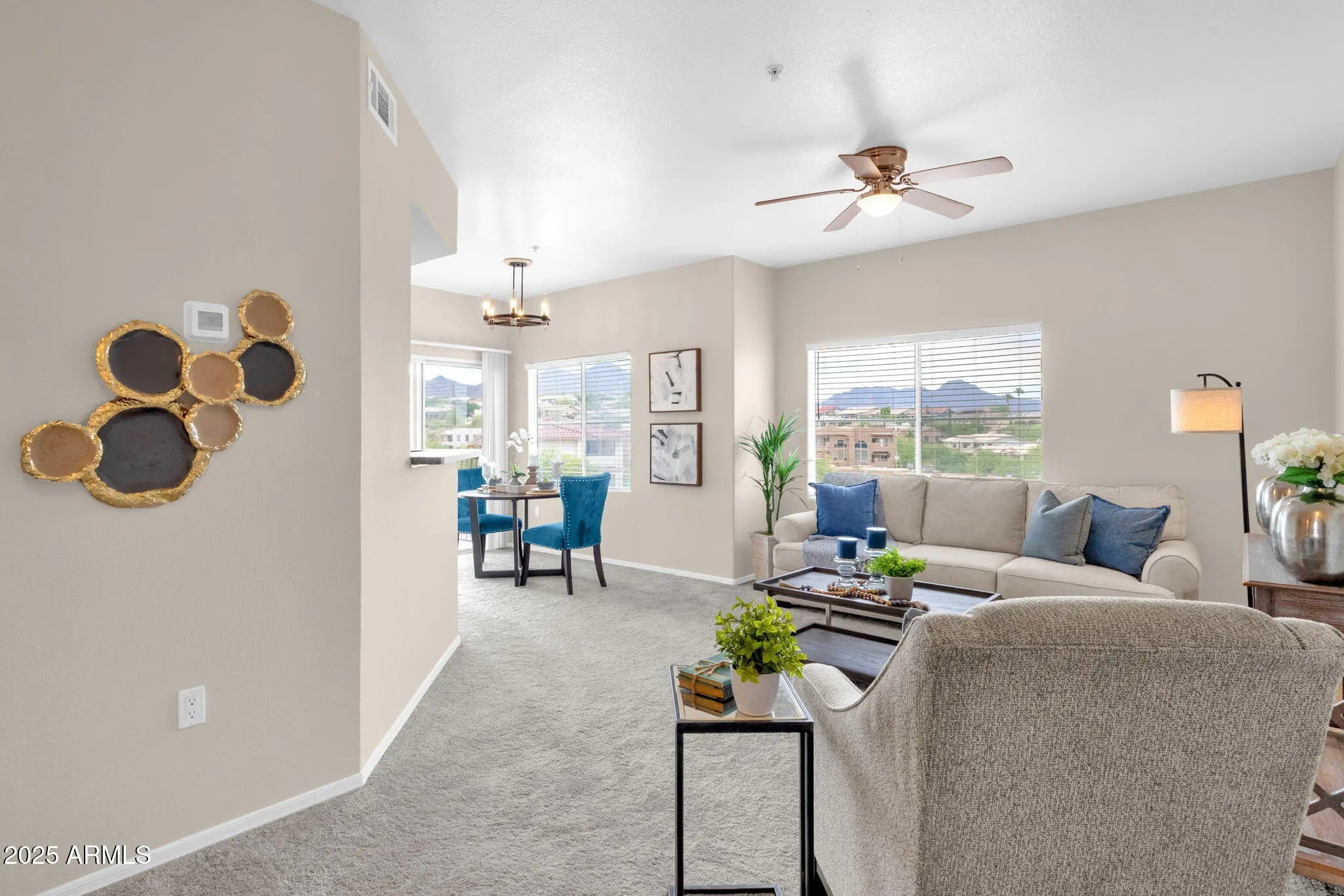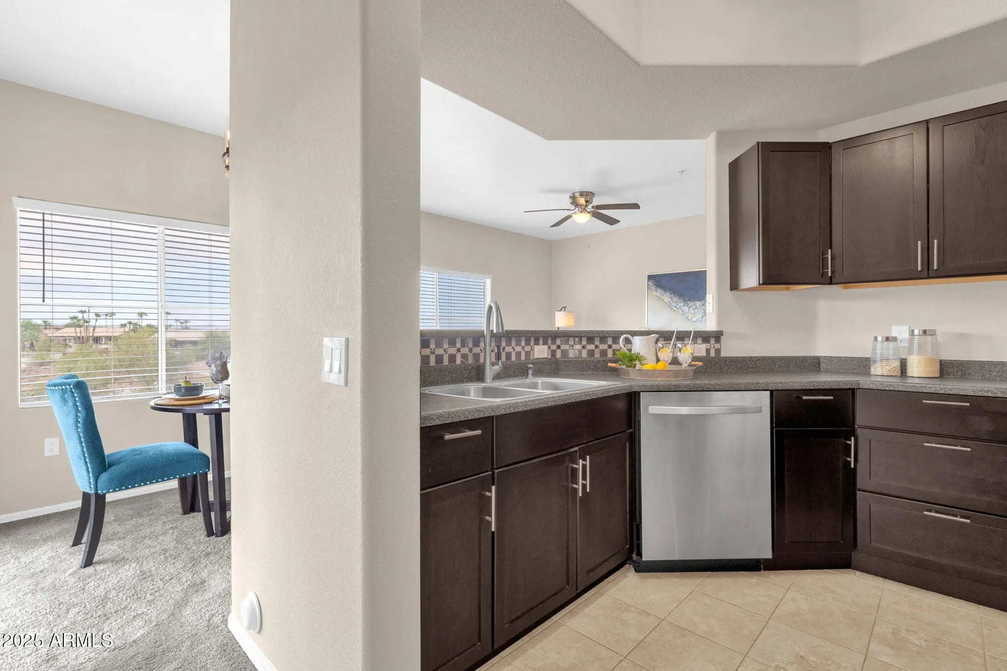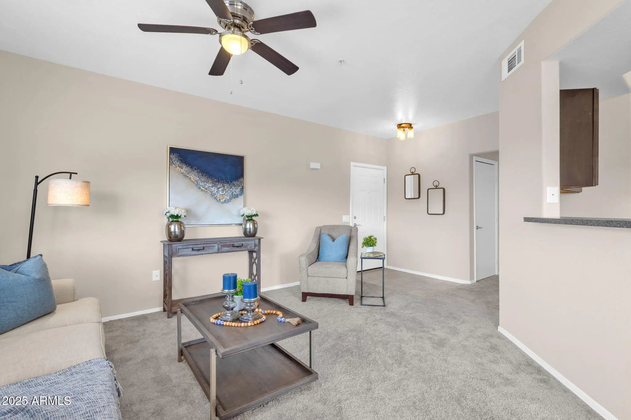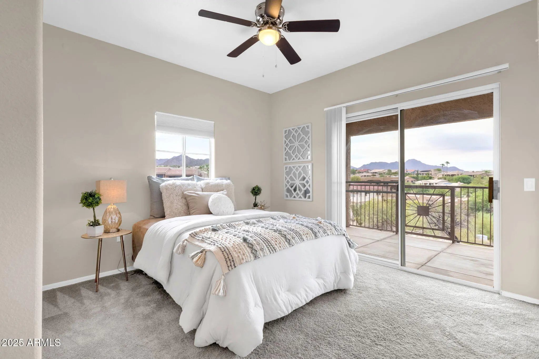 Discover this beautifully updated 1-bedroom, 1-bath condo offering 778 sq. ft. of modern, well-designed living space. Step inside to a bright and inviting open floor plan featuring neutral tones, plush carpeting, and plenty of natural light. The spacious living area flows seamlessly into the dining space and kitchen. The kitchen boasts sleek stainless steel appliances, rich cabinetry, modern finishes, and a breakfast bar for casual dining. The large primary suite has direct access to a private balcony, a roomy walk-in closet, and an updated bath with stylish tilework. Additional conveniences include a full-size laundry area and ample storage throughout. Enjoy Arizona's indoor-outdoor lifestyle on your covered patio with views of the surrounding desert and mountains. Located in the desirable Four Peaks community, residents benefit from resort-style amenities, including a sparkling pool, spa, and fitness center. With an affordable HOA, this condo is a fantastic opportunity for a first home, vacation retreat, or investment property.