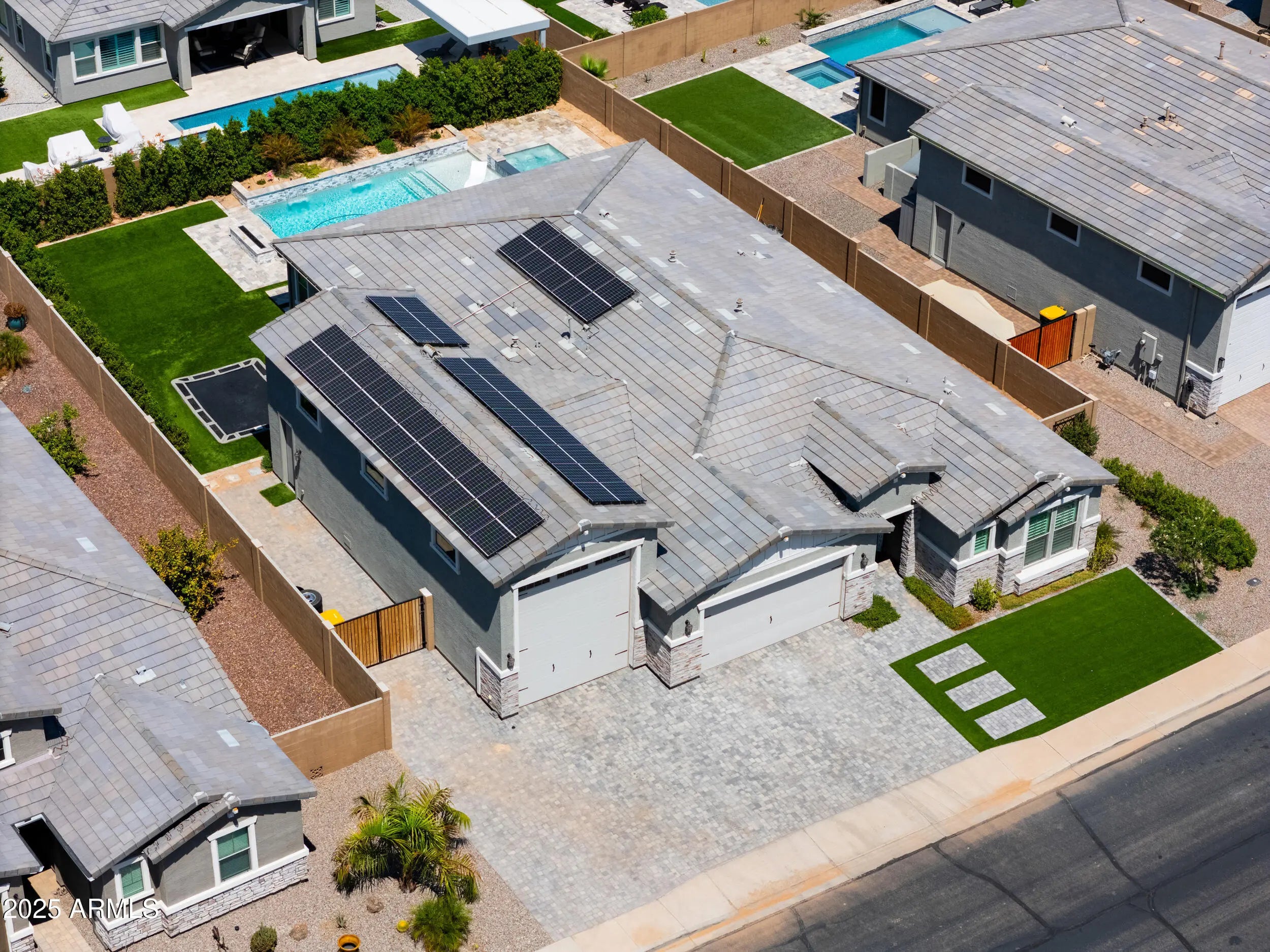 THE CROWN JEWEL! This stunning 2022 built bungalow boasts nearly 2600 sq ft of open concept living with 3 spacious bedrooms + open den, 2.5 lavish baths & gourmet kitchen overlooking the great room! Upgrades abound & include tray ceilings, wainscoting, designer paint throughout, plantation shutters, custom built fireplace wall with natural quartzite stone & much more! Entertainer's kitchen features Quartz countertops, tile backsplash, designer cabinets with soft close feature, large island, SS appliances with gas cooktop, built in oven, walk-in pantry & dining nook! 5 CAR GARAGE with 3 car tandem & RV door! BACKYARD OASIS with 20x 30 oversized heated pool & builtin Jacuzzi, in ground trampoline, artificial turf, travertine decking & plumbed for outdoor kitchen! OWNED SOLAR! A must see!