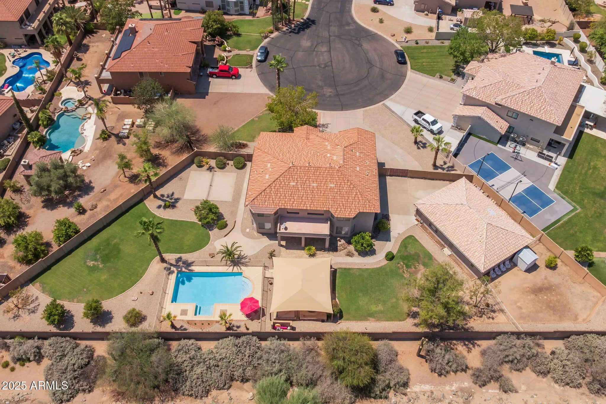 This beautifully designed and spacious home is located in the private gated community of Saguaro Vista Estates, a neighborhood known for its large homes and serene setting. Perfectly positioned at the head of a quiet cul-de-sac on an expansive 27,581 sq. ft. lot—one of the largest in the subdivision—this residence offers privacy, elegance, and flexibility. The 4,632 sq. ft. main home is thoughtfully designed with the ideal split floor plan, featuring the primary suite downstairs and four generous bedrooms upstairs, each with walk-in closets. A versatile loft with its own large walk-in closet can easily serve as a 7th bedroom, additional storage, or even a pantry. Throughout the home, soaring vaulted ceilings enhance the open and airy design. Living spaces are abundant and include a formal dining room, formal living room, great room with breakfast nook, and a chef's eat-in kitchen with stylish two-tone accents and generous prep and storage space. Recent updates include new lighting, fixtures, interior paint, upstairs flooring, modern accent walls, and on-trend color palettes. Built with super energy efficiency, the home blends comfort, design, and functionality. The backyard is a true retreat with a sparkling pool, above-ground spa, fire pit, sport court for pickleball, large shade structure, manicured fruit trees, and mature trees and landscaping with room for gardens or future expansion. With no neighbors behind most of the lot and mountain views in the distance, the outdoor living space is private and inviting. The detached 1,280 sq. ft. guest house adds incredible versatility with its own kitchen, large bedroom, private RV gate, and access to two additional garage stalls. These stalls may remain as garage parking or be converted into an expanded living room, offering the perfect next-gen suite, man cave, workshop, or retreat. Combined with the 3-car garage in the main home, this estate offers a rare 5 garage spacesideal for collectors, hobbyists, or those who need extra storage. Well maintained and masterfully crafted, this is the only home in the neighborhood that truly offers it allspacious living areas, sparkling pool, guest house, an abundance of garage parking, mature landscaping, room to grow and expand, and even mountain viewsall in one of Mesa's most desirable gated communities. Situated near Las Sendas and Mountain Bridge in NE Mesa, it also provides access to A-rated schools, convenient freeway connections, and the Valley's best hiking, biking, and outdoor recreationincluding nearby Saguaro Lake.